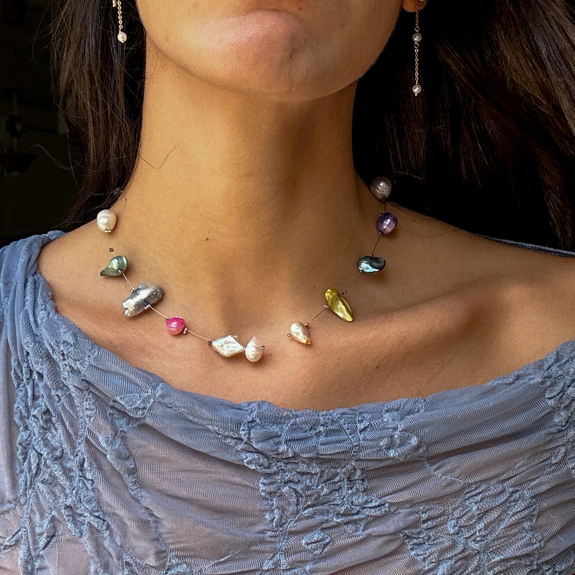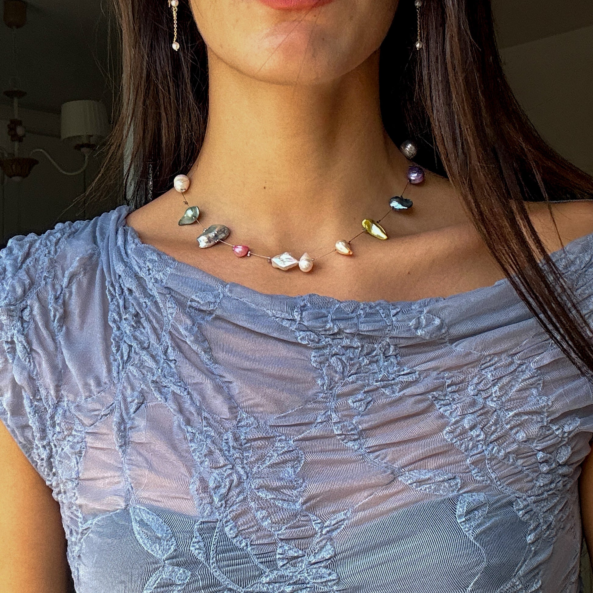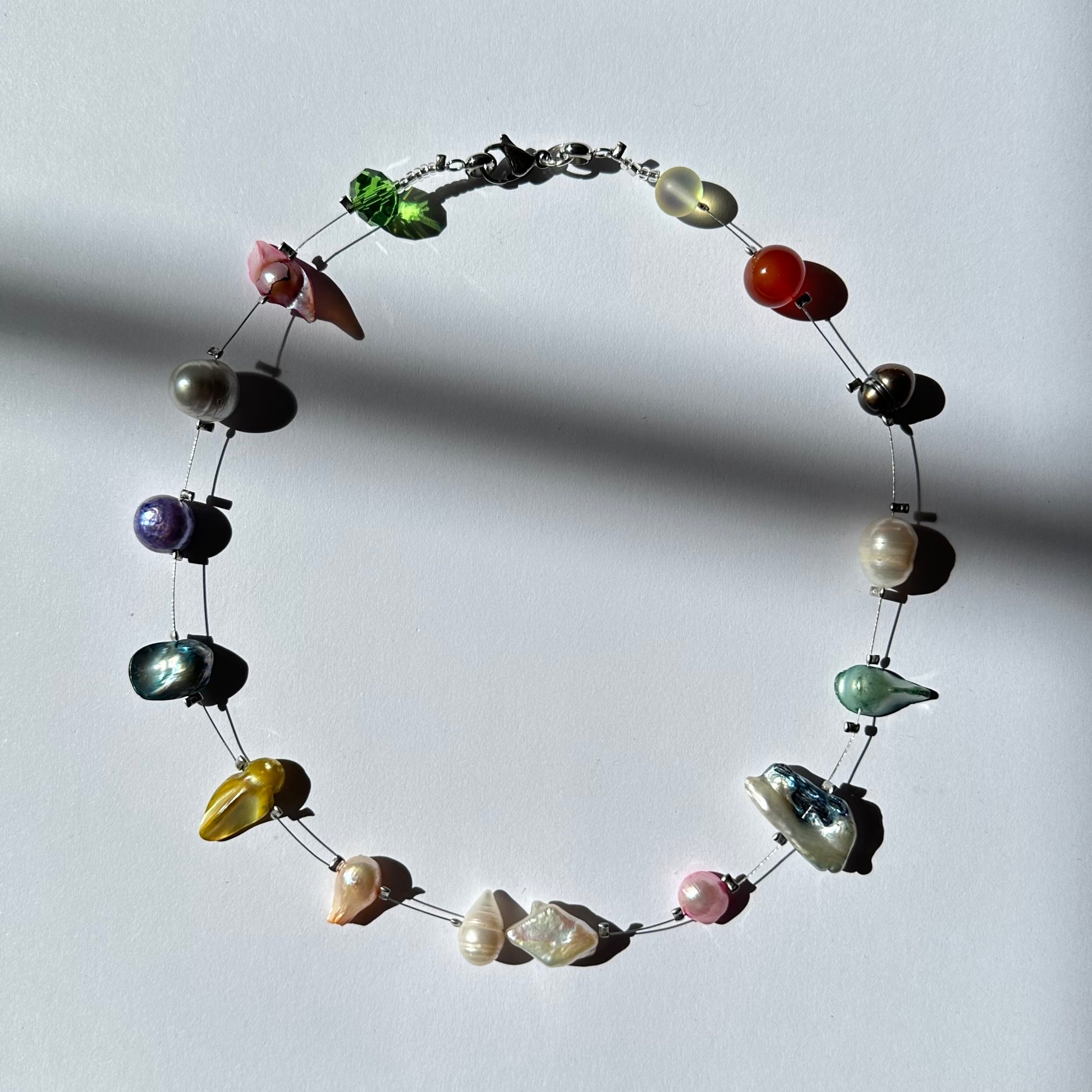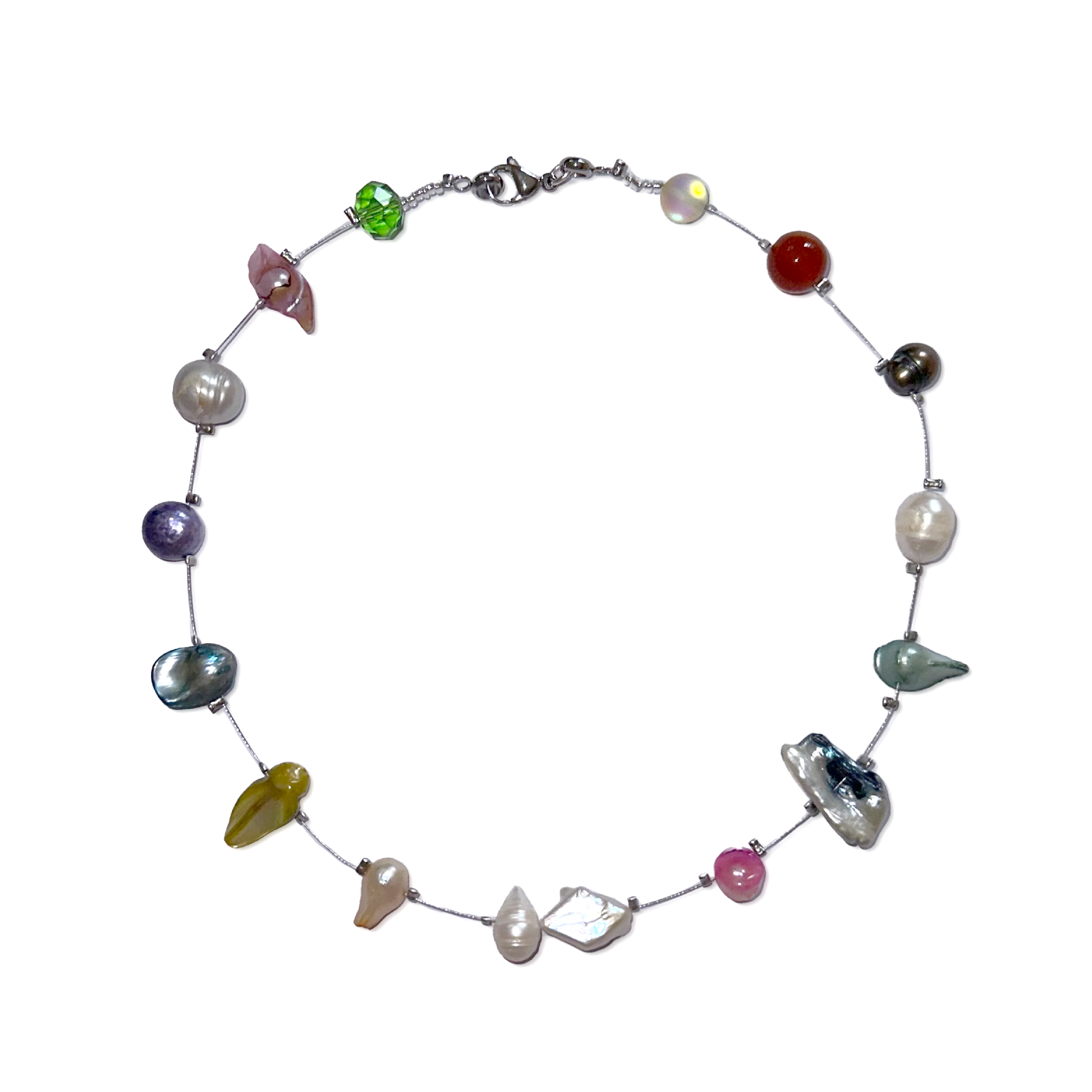 Everyday dainty necklace, colored freshwater pearls, acrylic beads, crystal beads, stainless steel silver clasp.