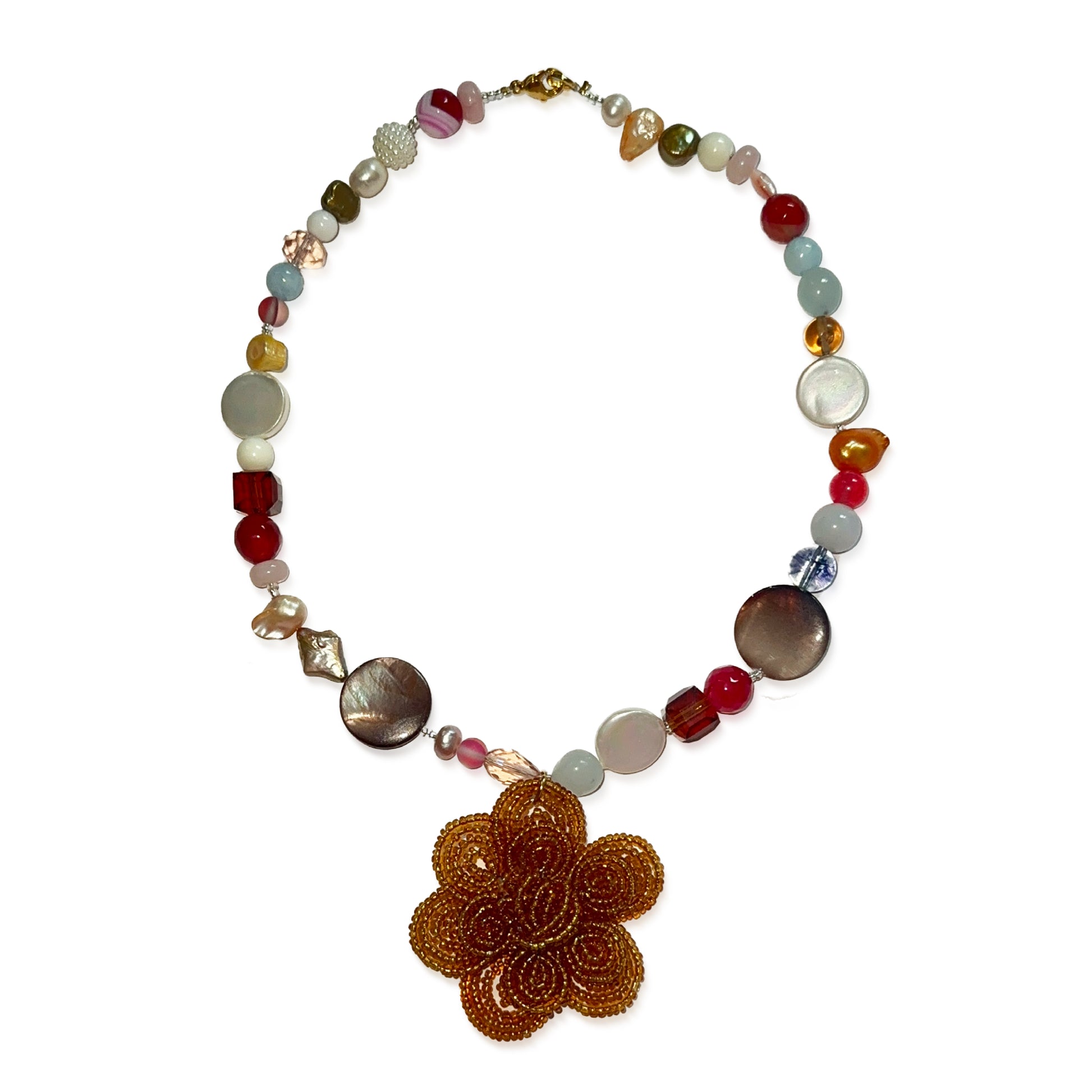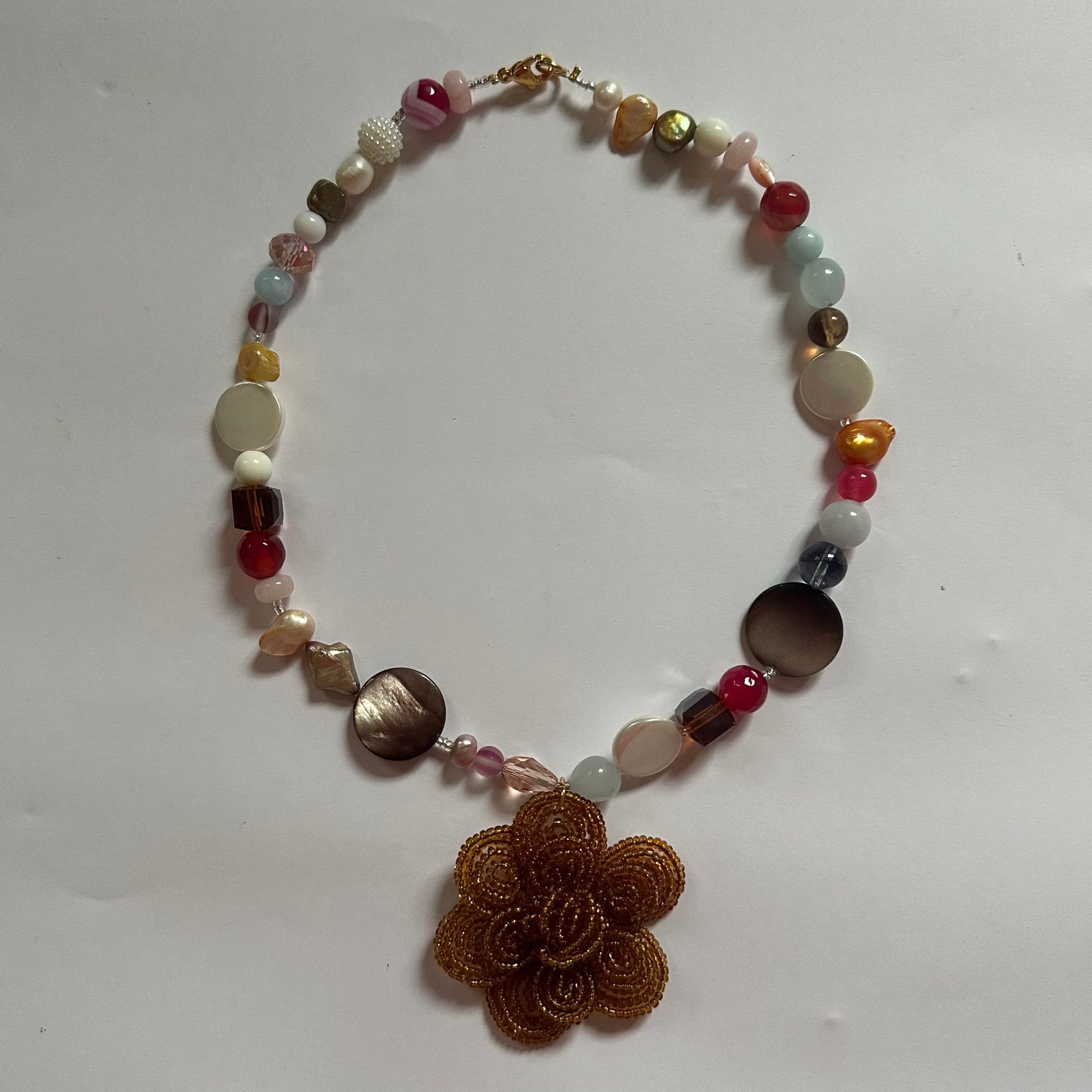 big handmade flower pendant, pearls and rounded beads, flat beads and a stainless steel golden clasp