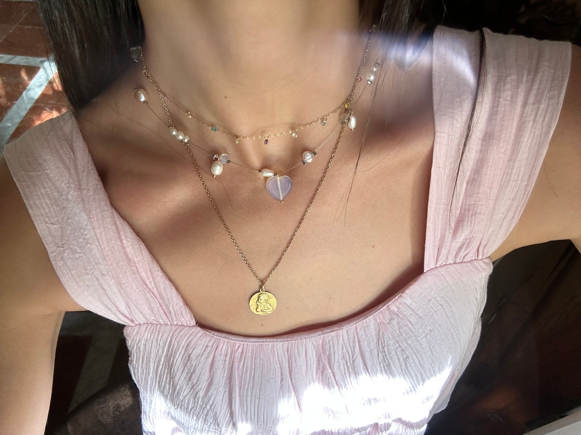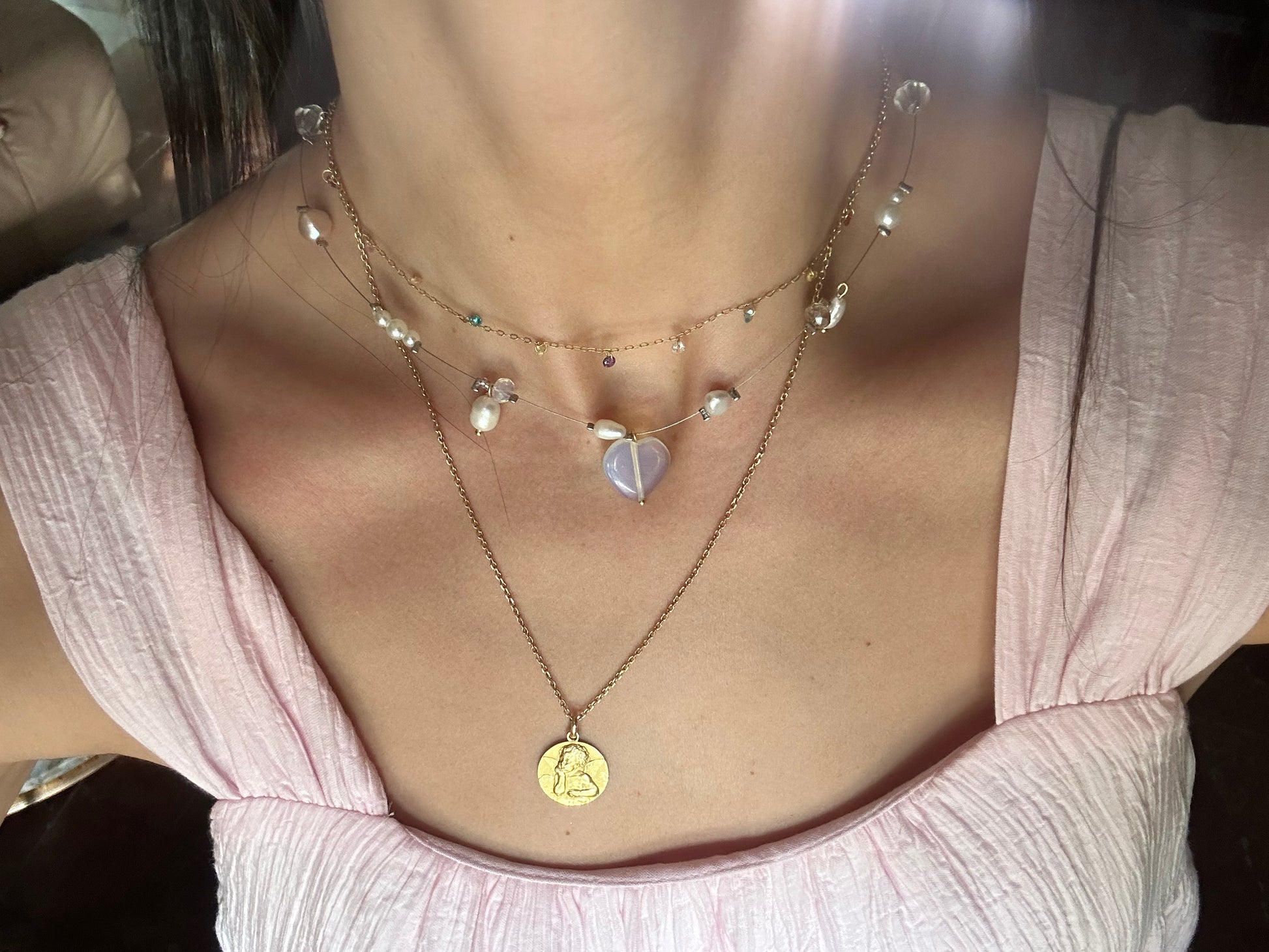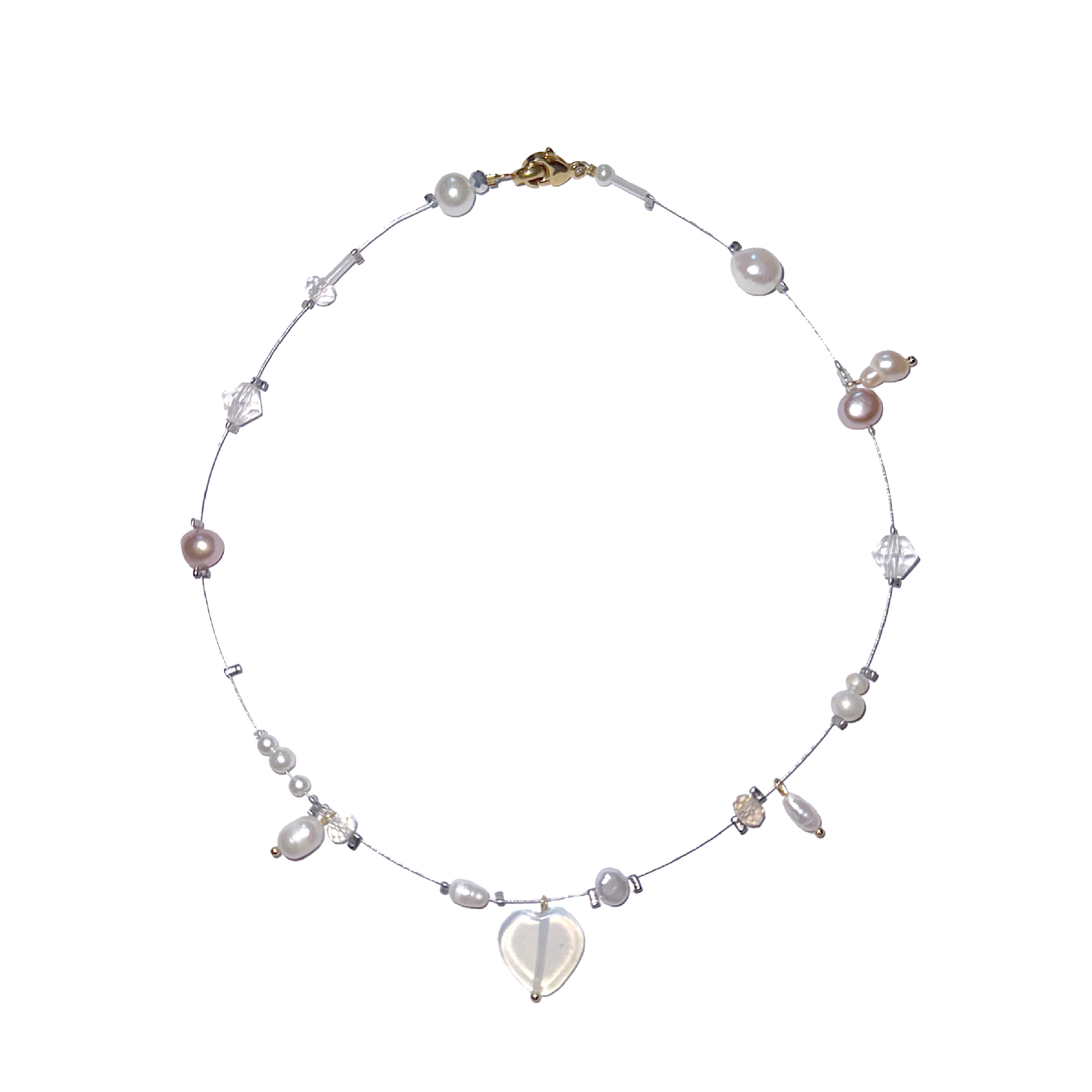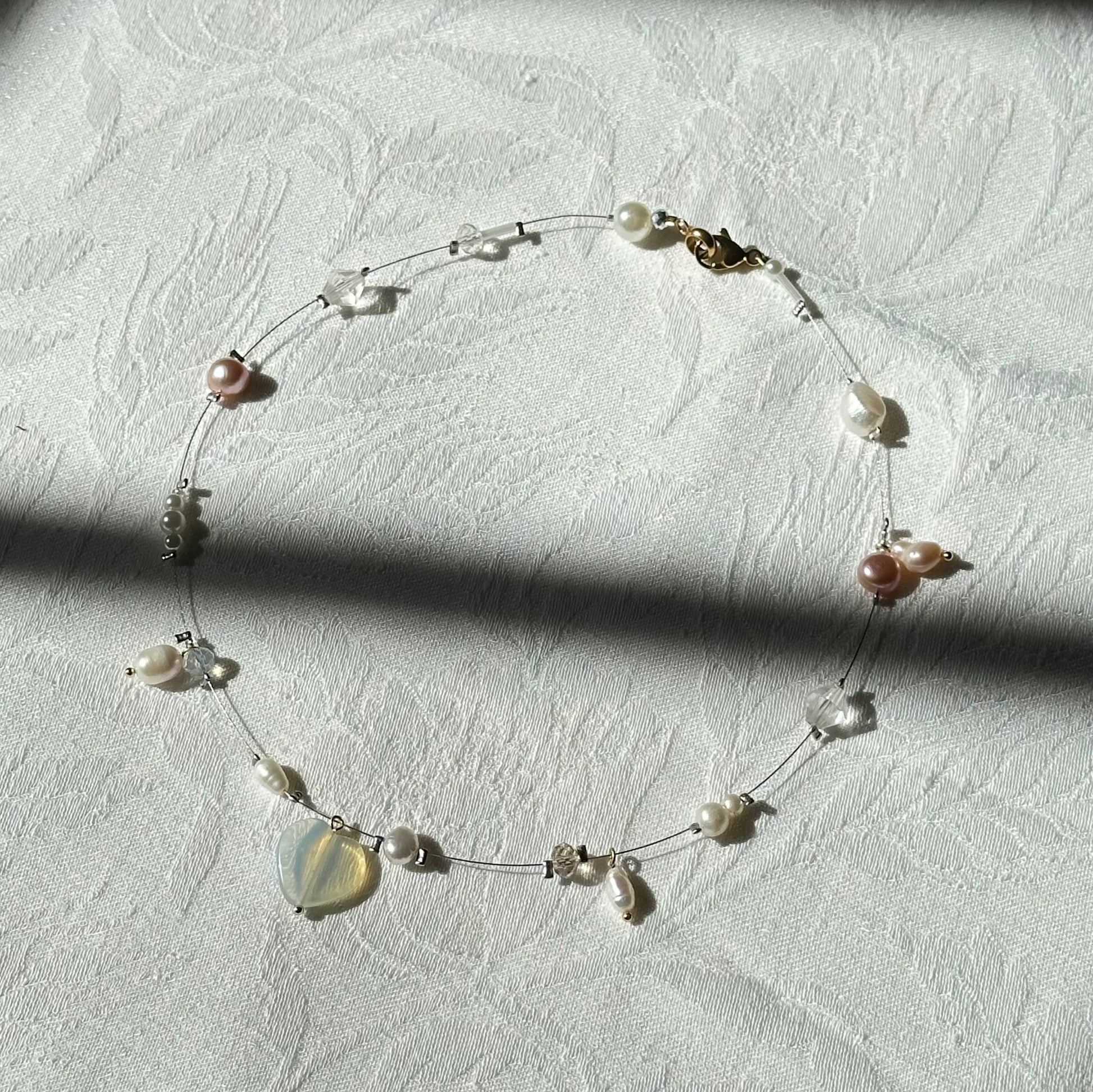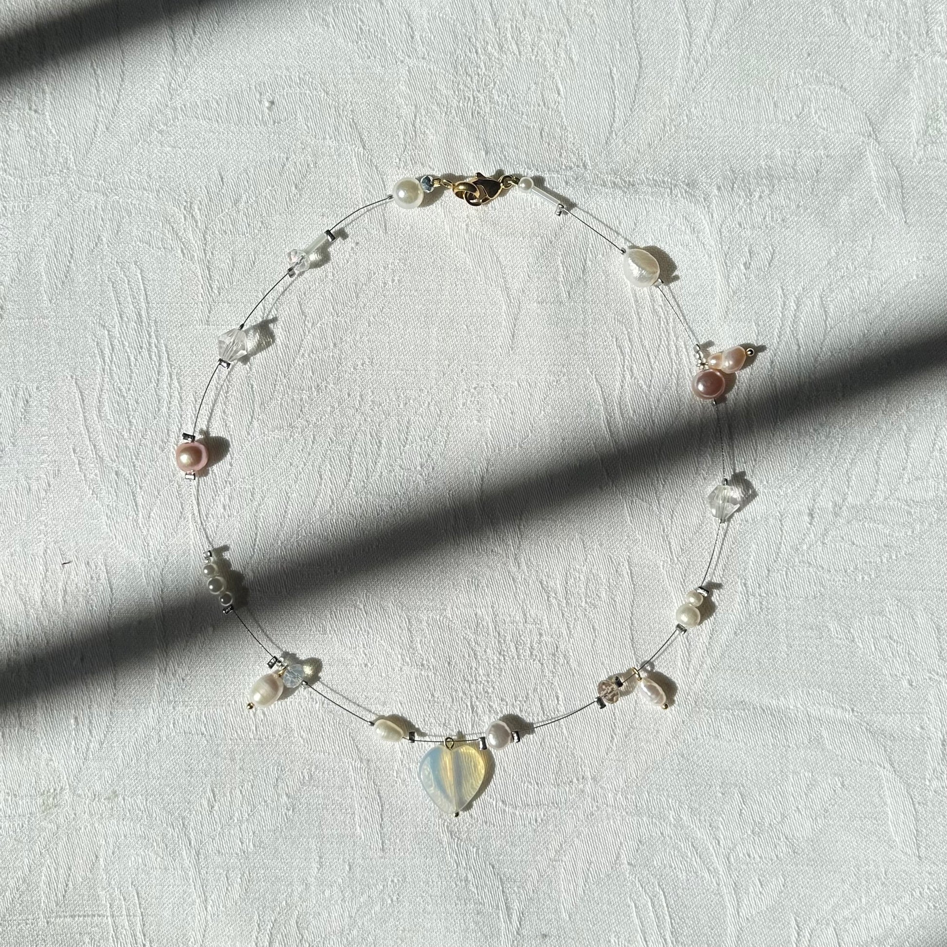 Dainty wire necklace, with little pearls, crystal beads, and opal little heart pendant.