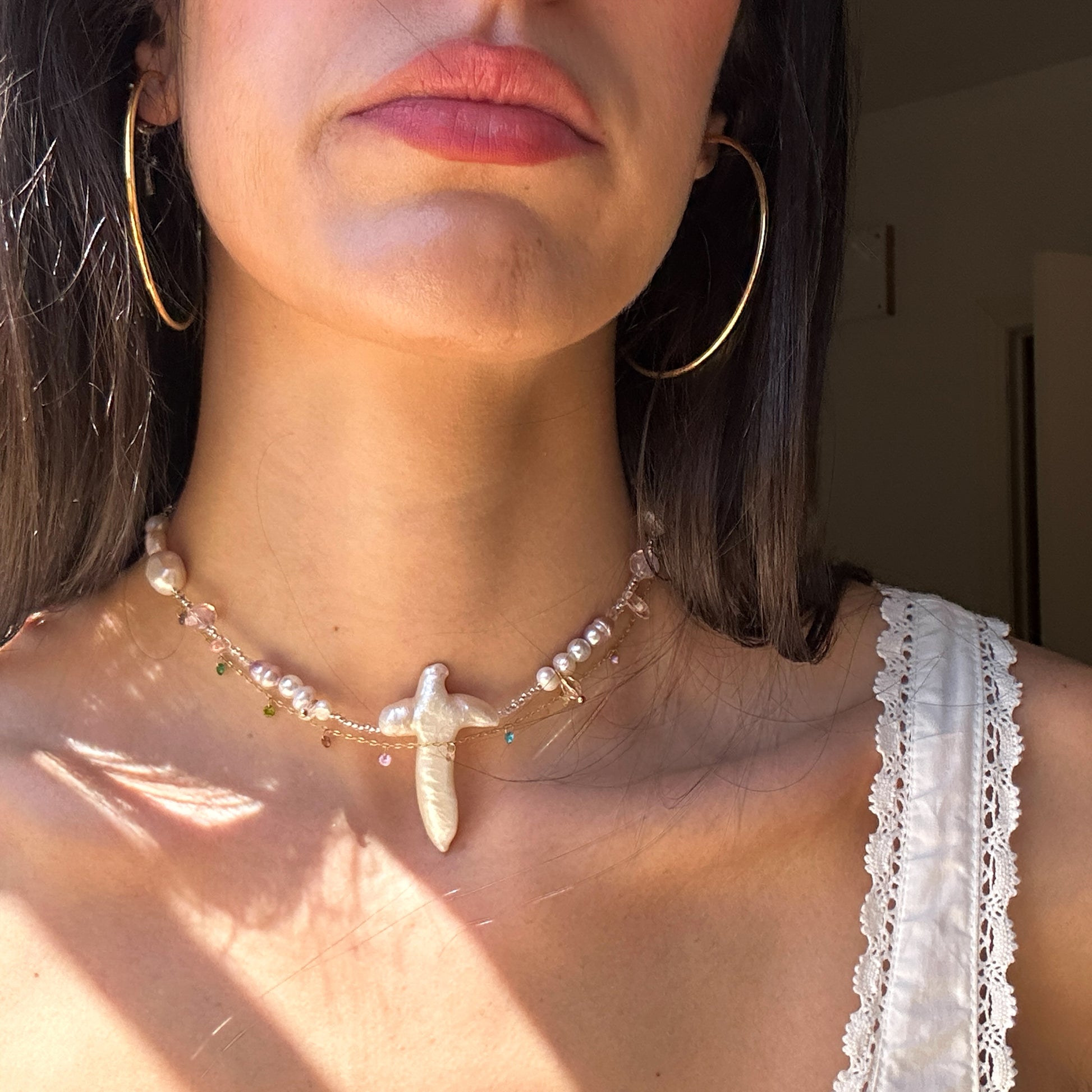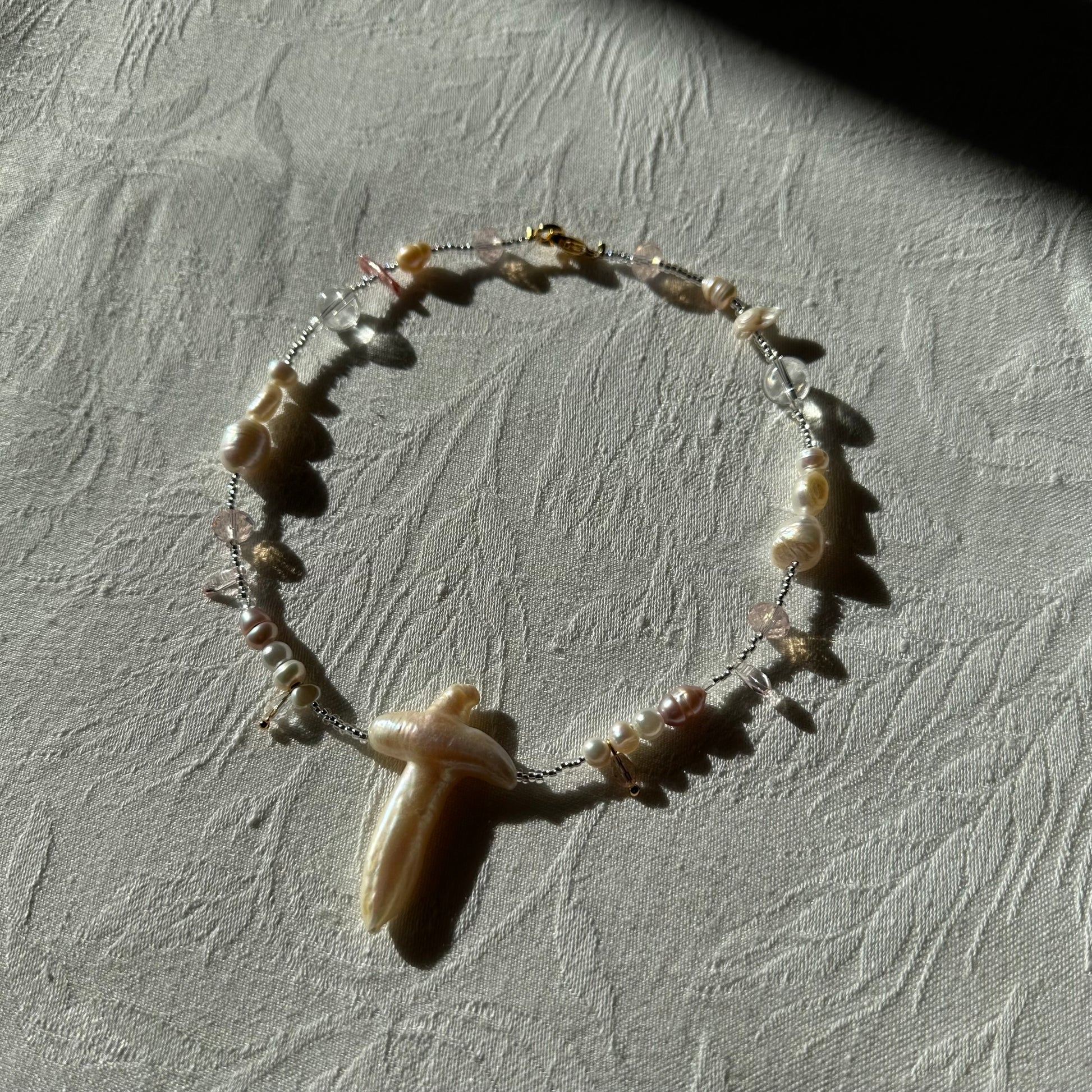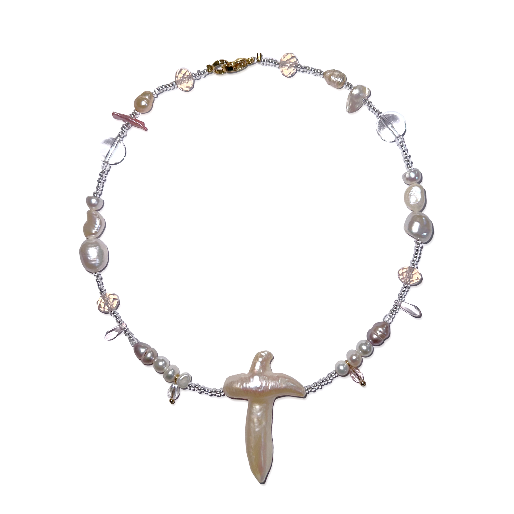 Big cross pearl, dagger beads, freshwater pearls, seed beads, stainless steel golden clasp