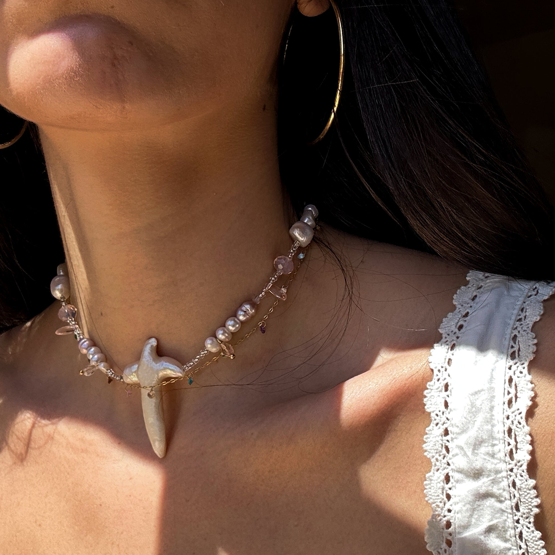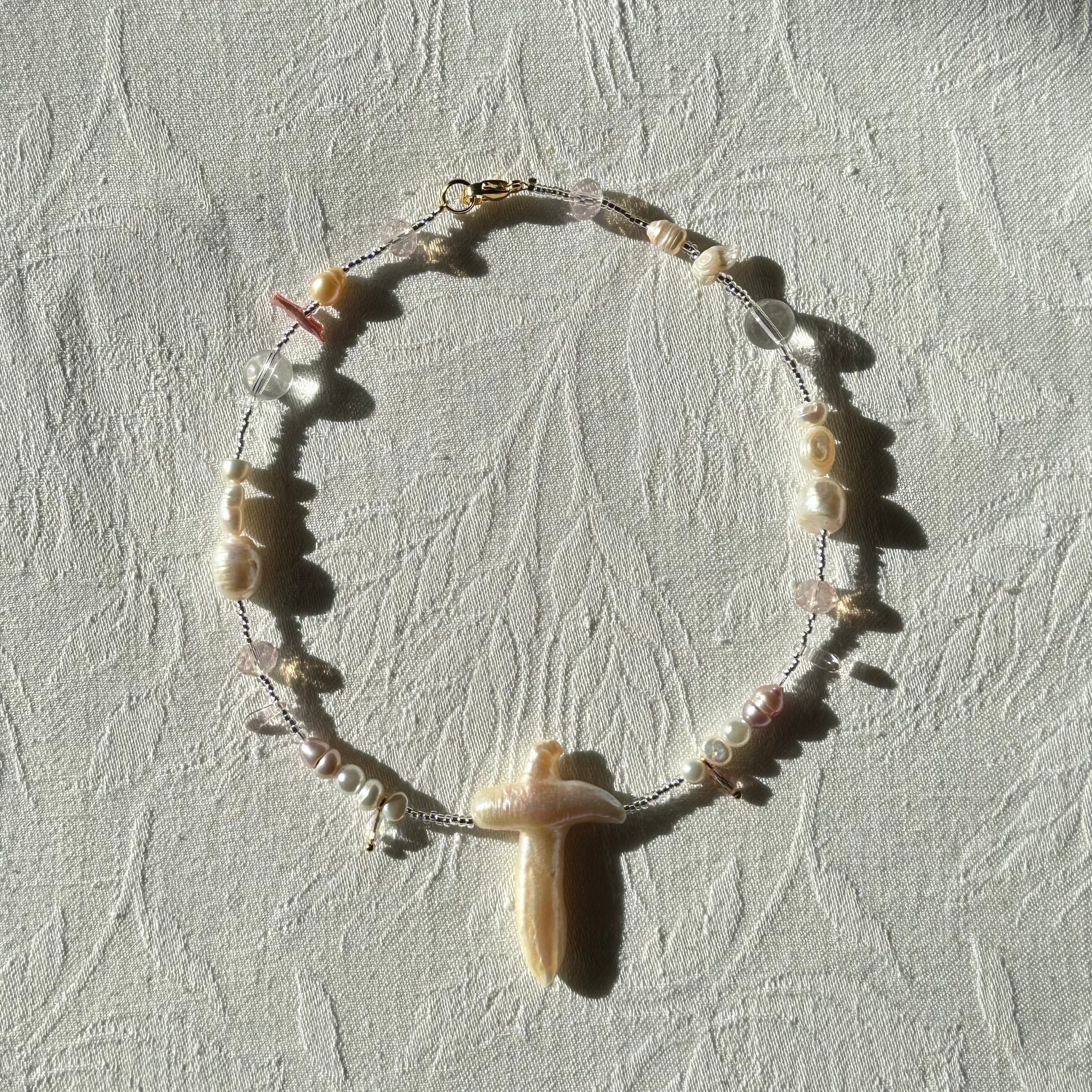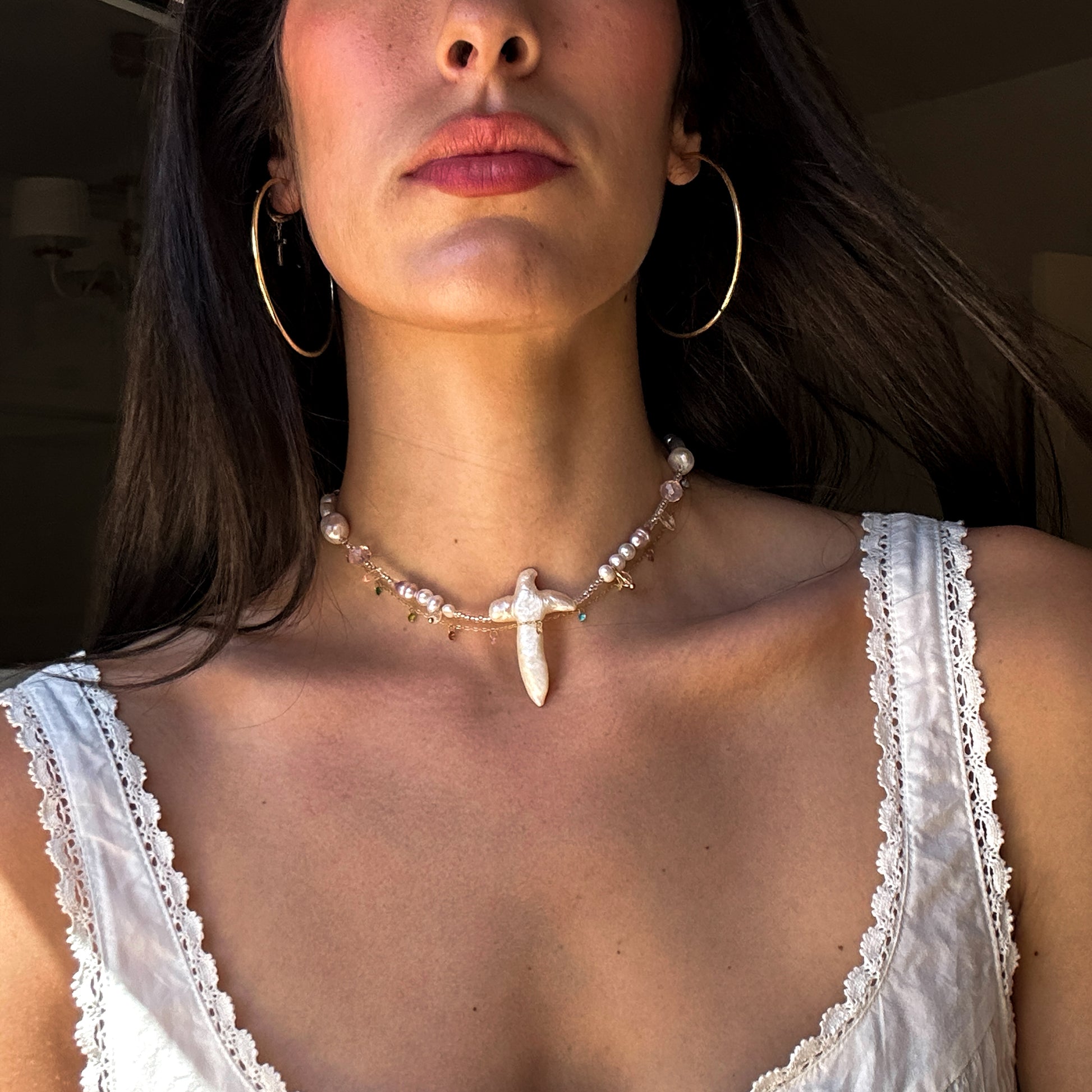 Big cross pearl, dagger beads, freshwater pearls, seed beads, stainless steel golden clasp