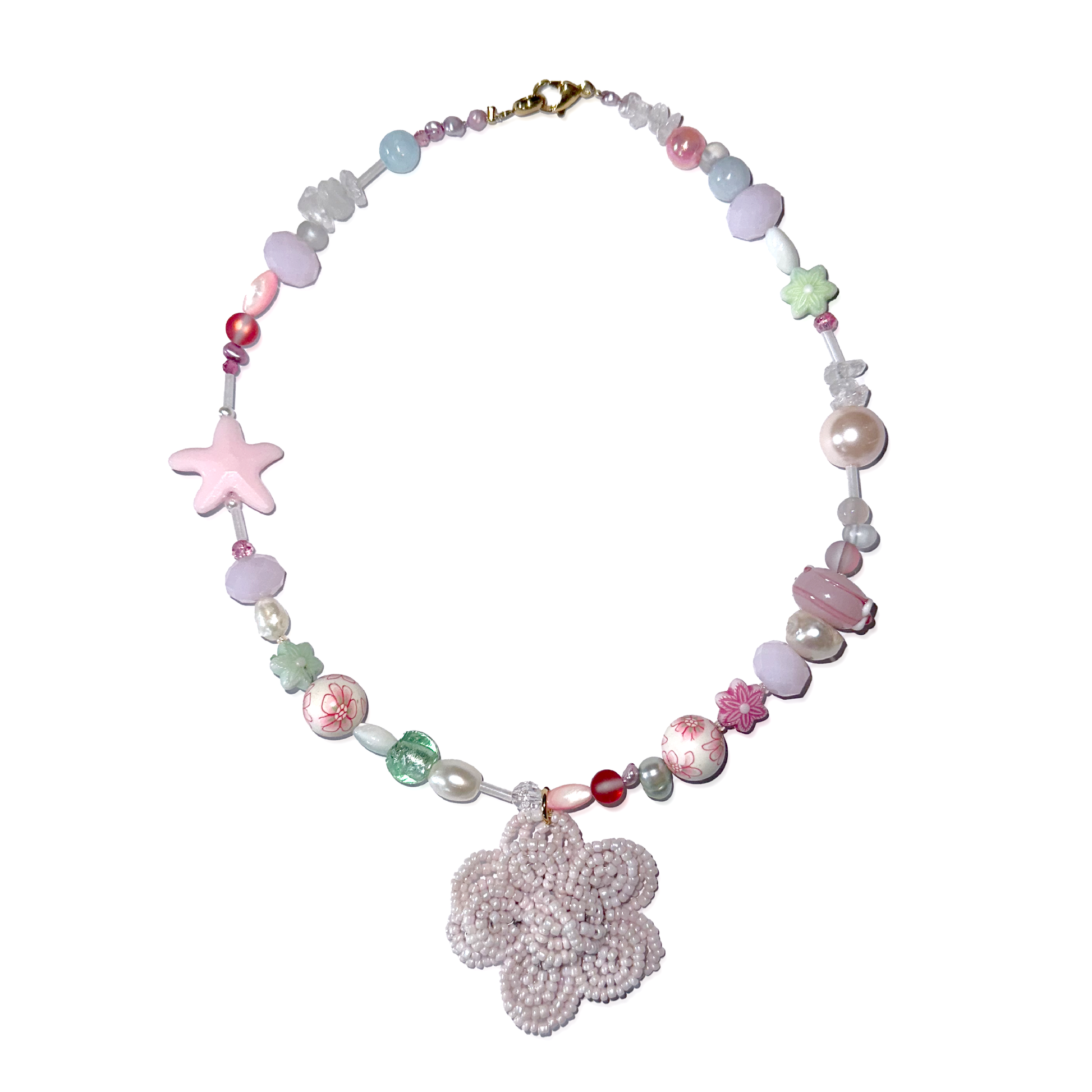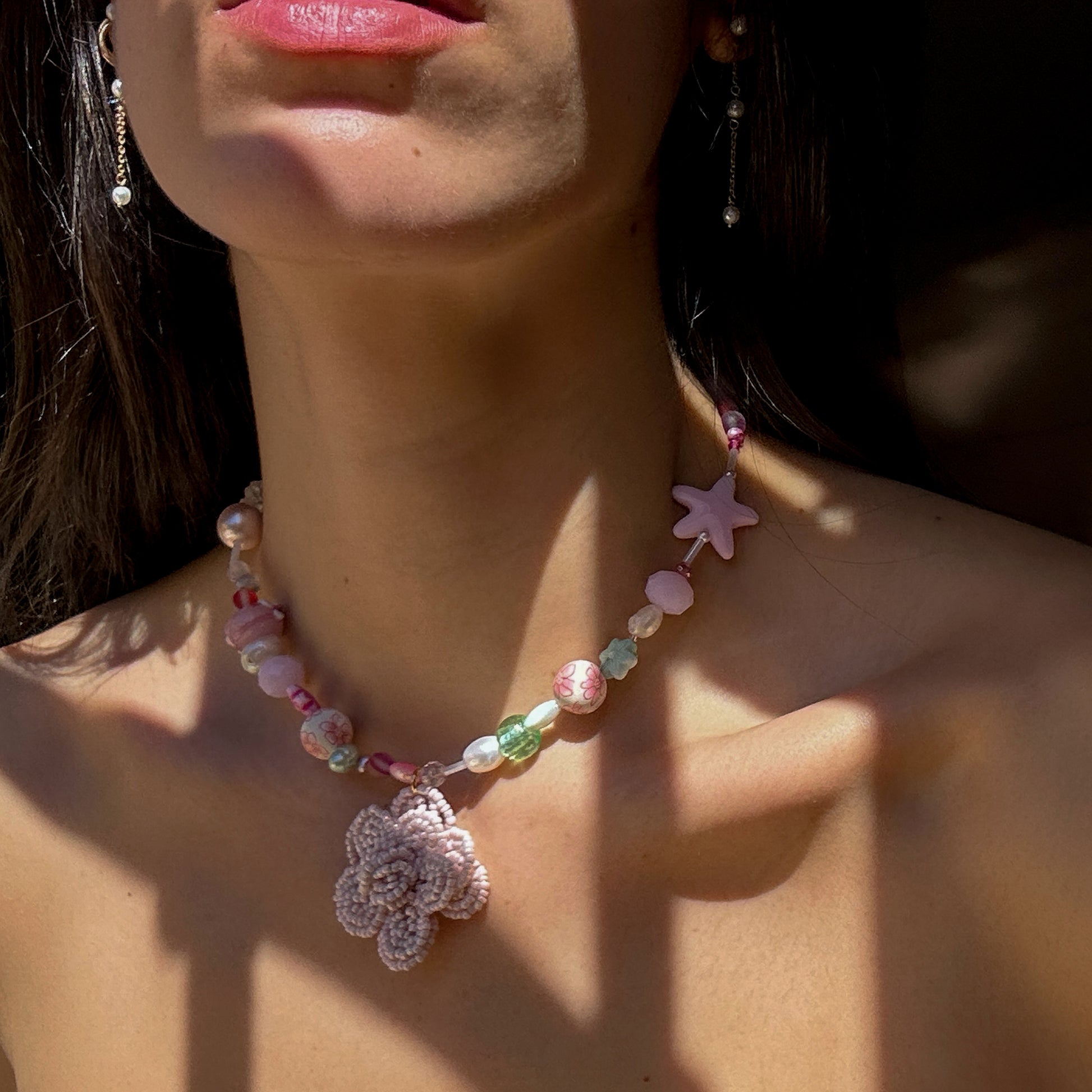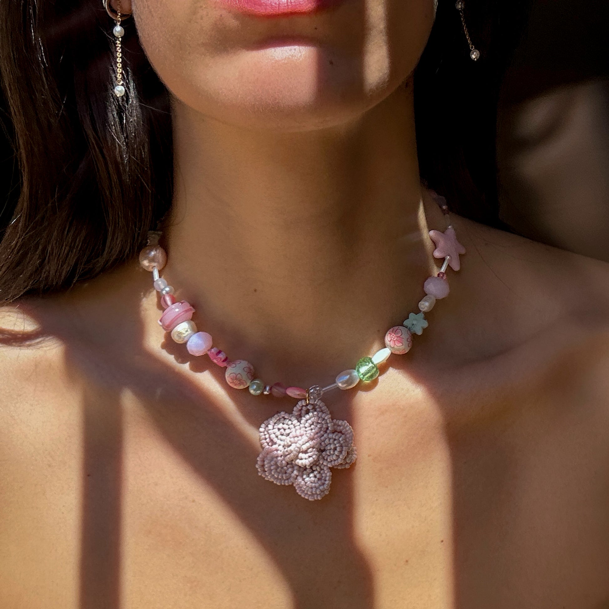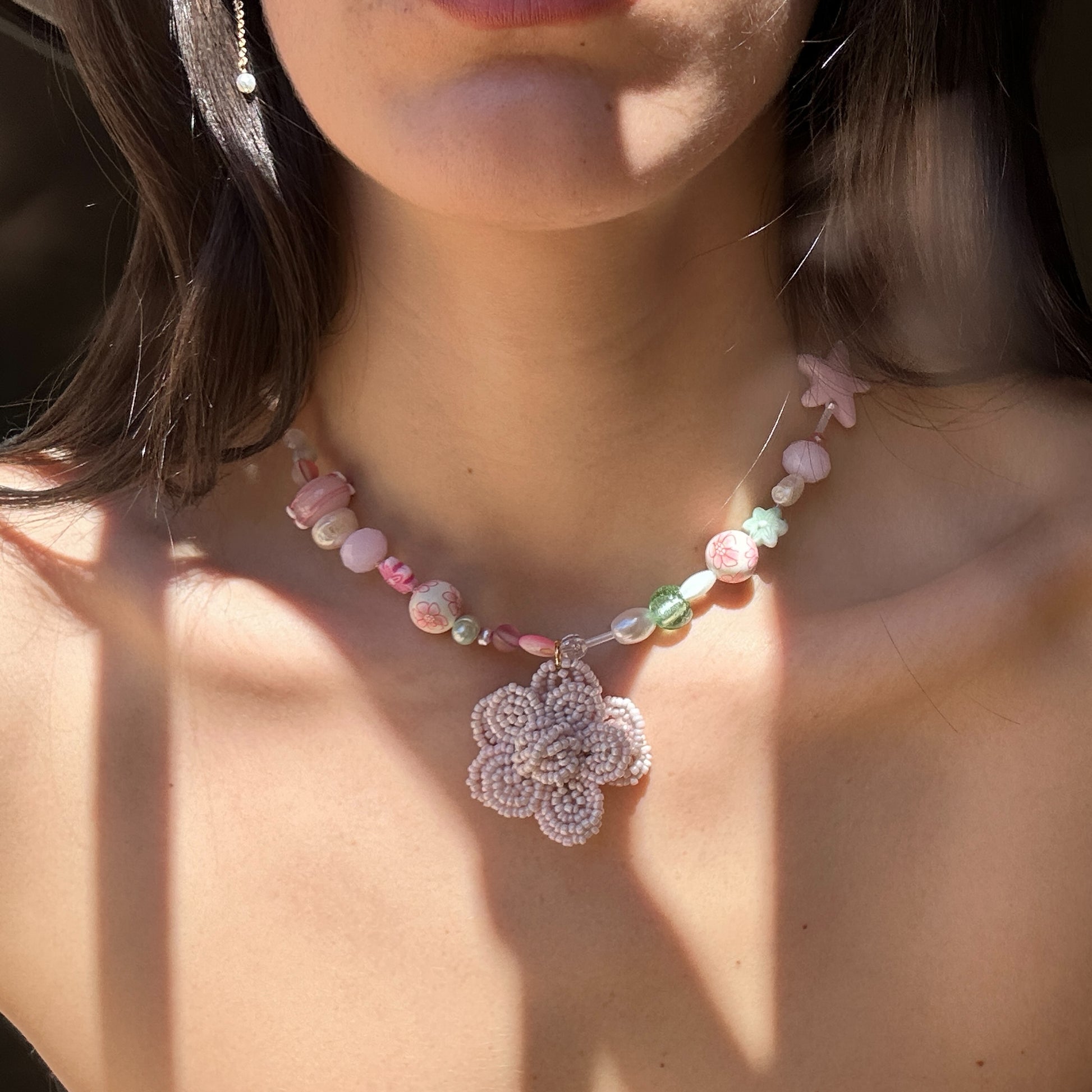 Handmade flower pendant made with pink beads, pearls and rounded beads, flat beads, flower beads and a stainless steel golden clasp.