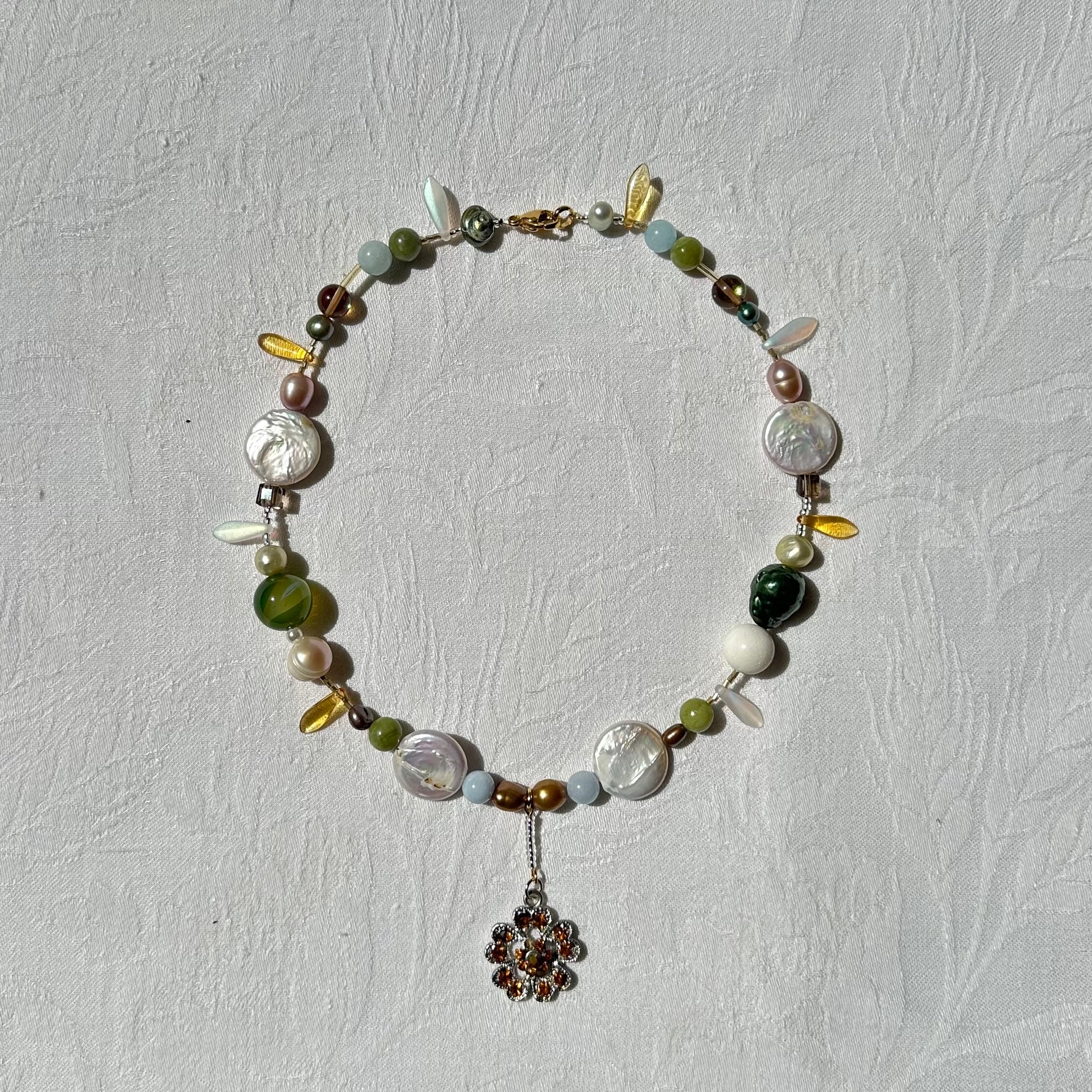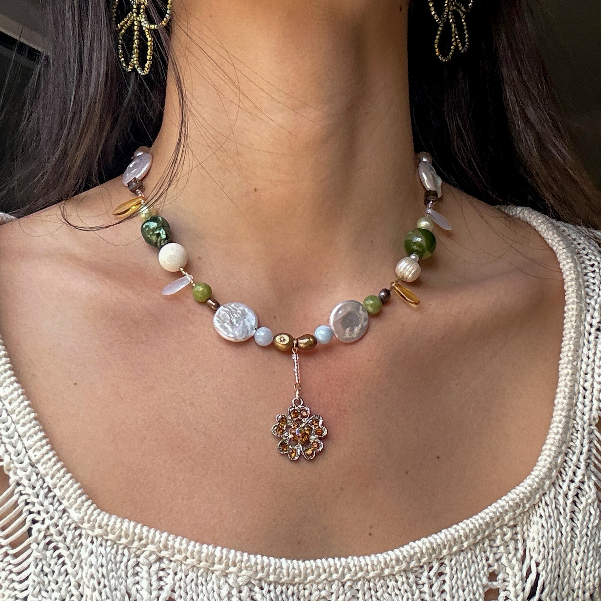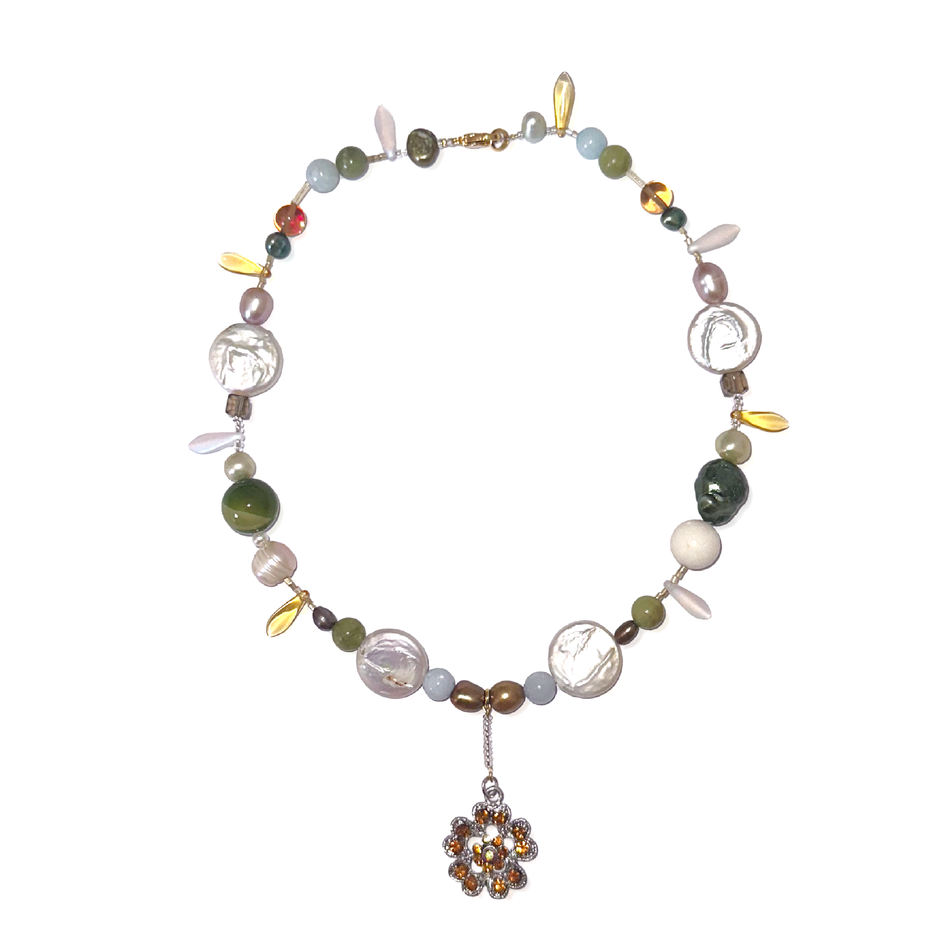 Yellow and Iridescent dagger beads, coin pearls, pink freshwater pearls, crystal beads, seed beads, vintage orange pendant and stainless steel golden clasp.