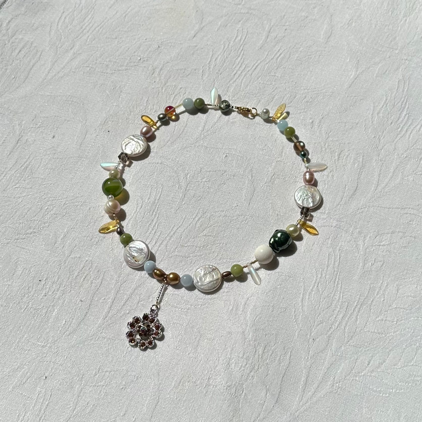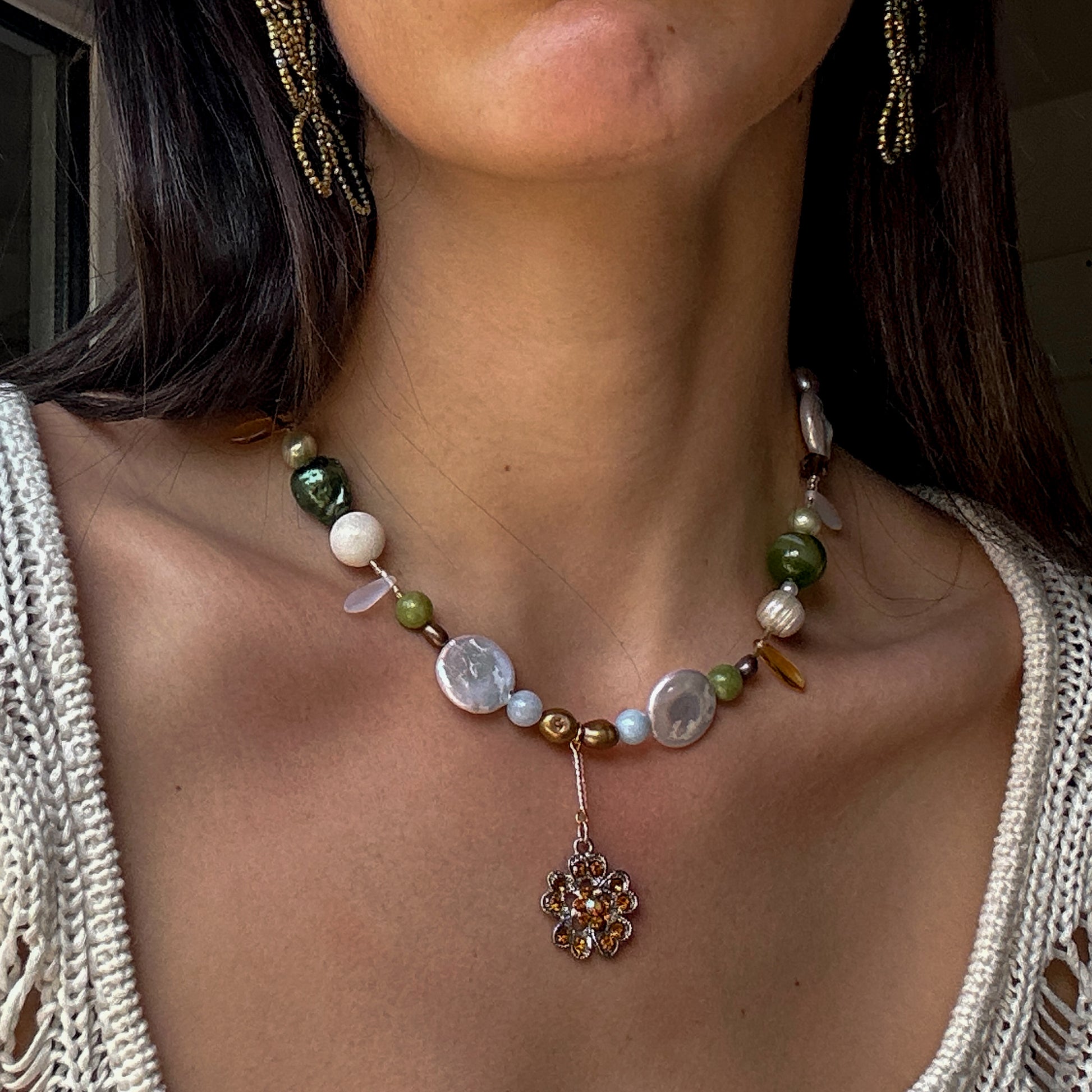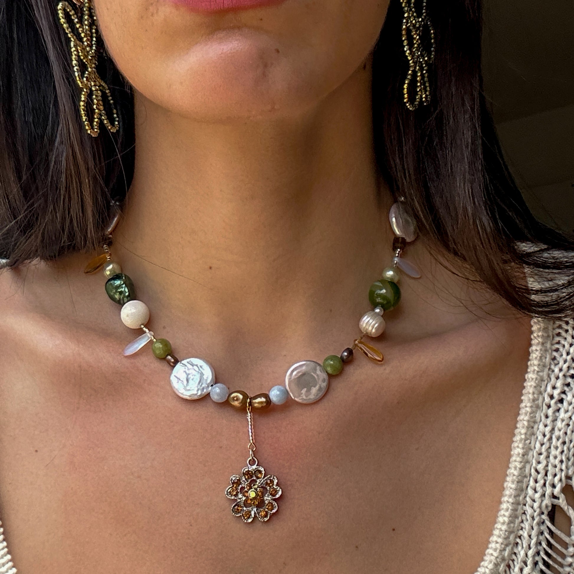 Yellow and Iridescent dagger beads, coin pearls, pink freshwater pearls, crystal beads, seed beads, vintage orange pendant and stainless steel golden clasp.