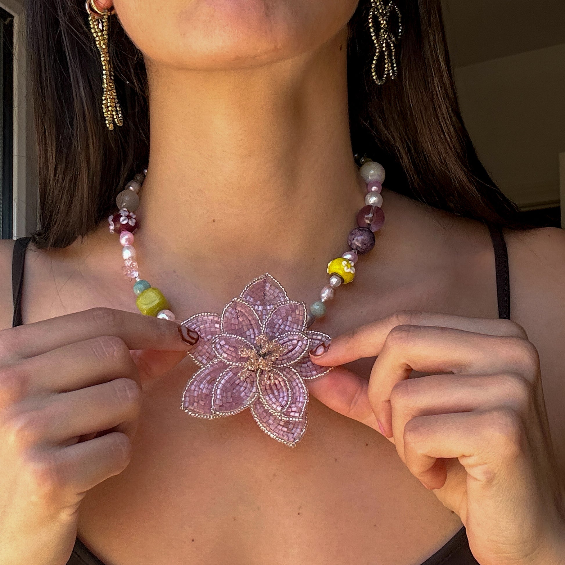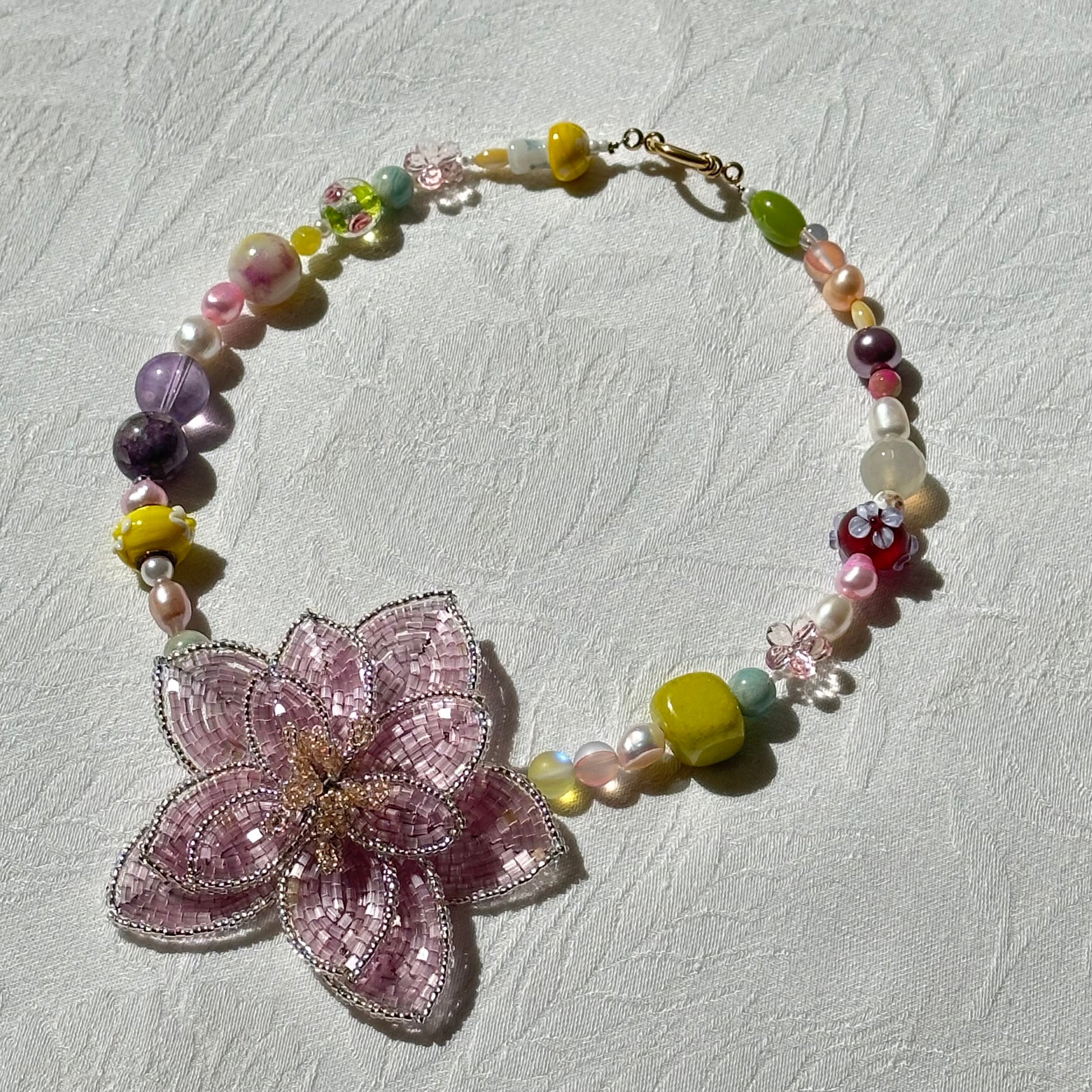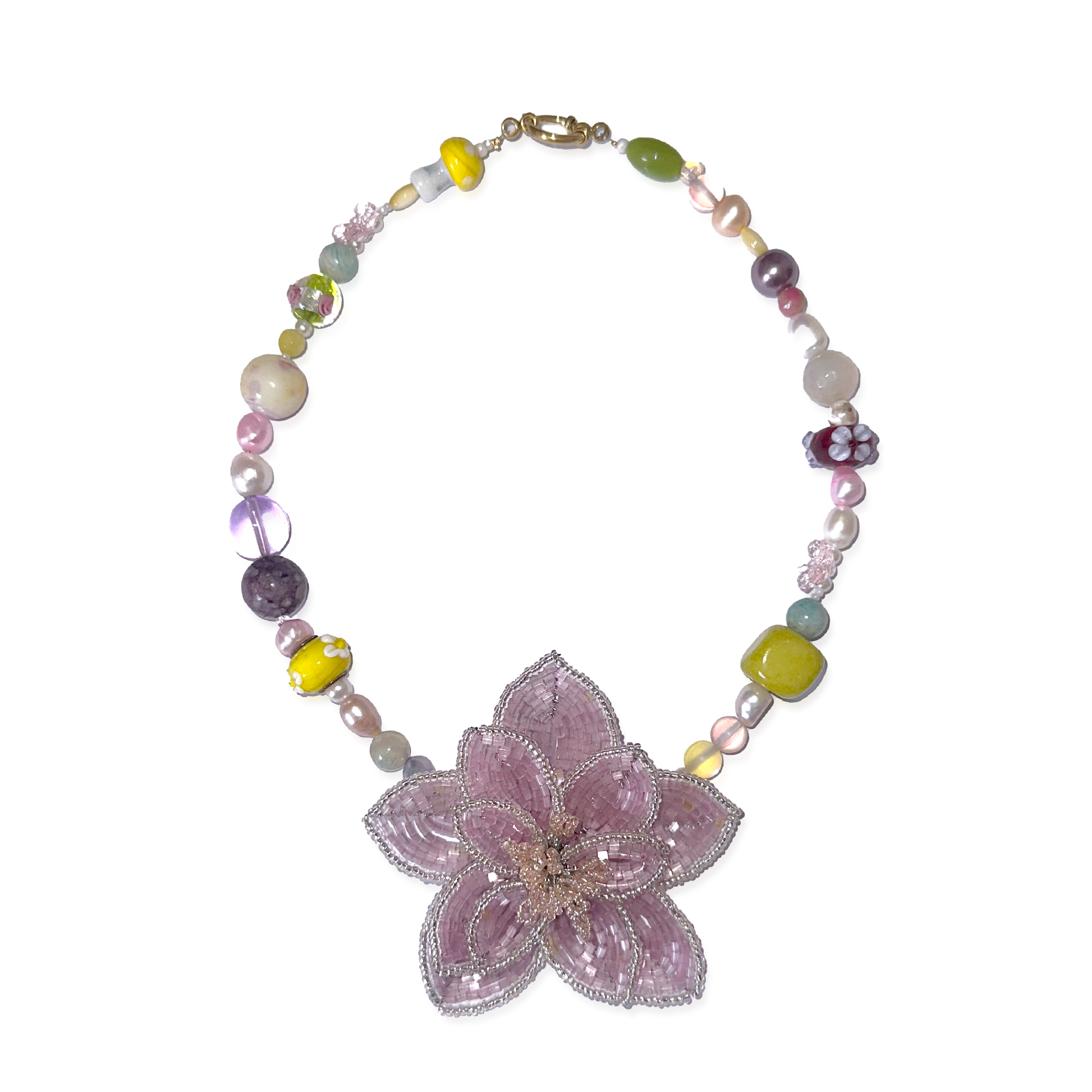 Handmade big beaded flower (7,5cm x 7,5cm), big round beads, freshwater pearls, mushroom beads, flower plastic beads, stainless steel golden clasp.