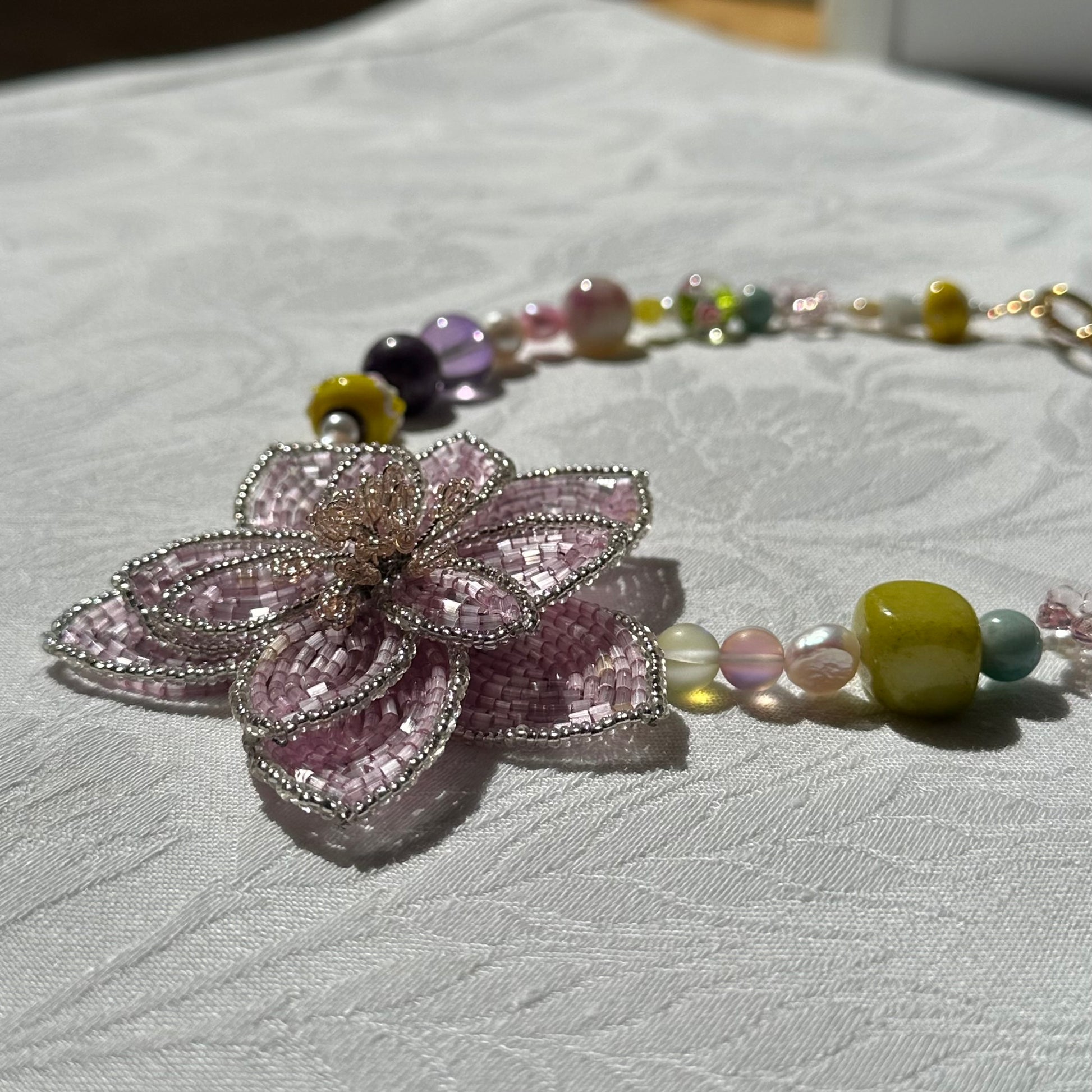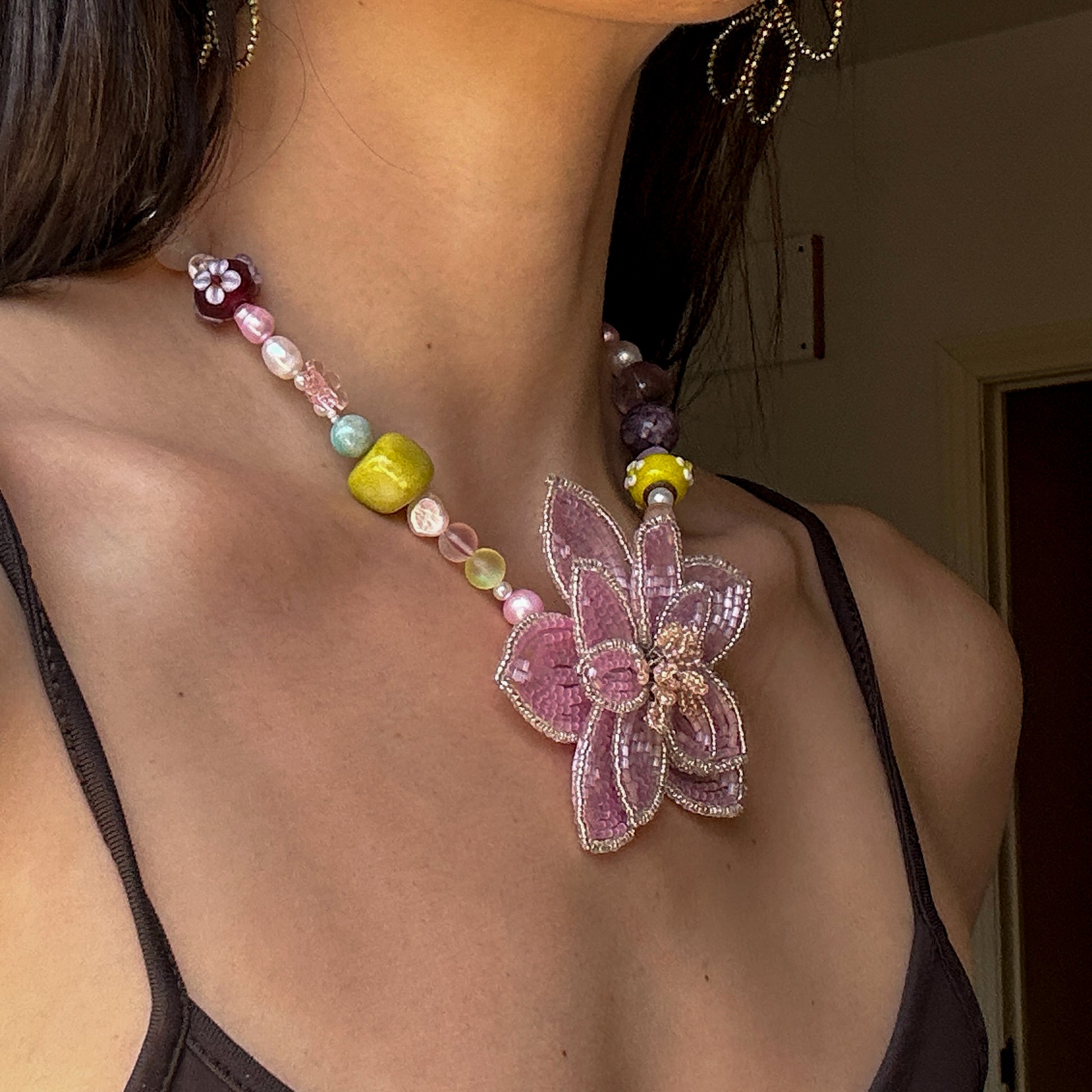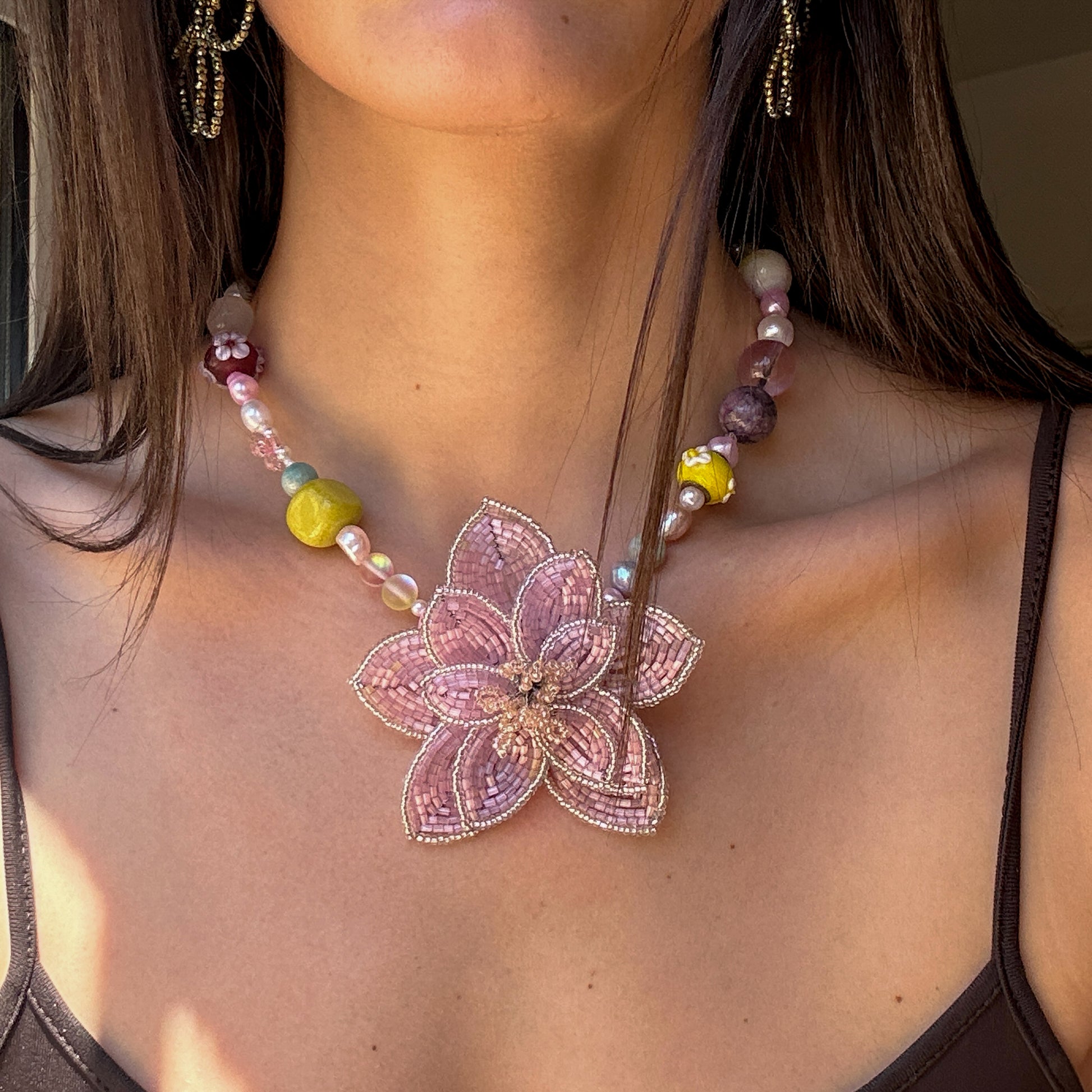 Handmade big beaded flower (7,5cm x 7,5cm), big round beads, freshwater pearls, mushroom beads, flower plastic beads, stainless steel golden clasp.