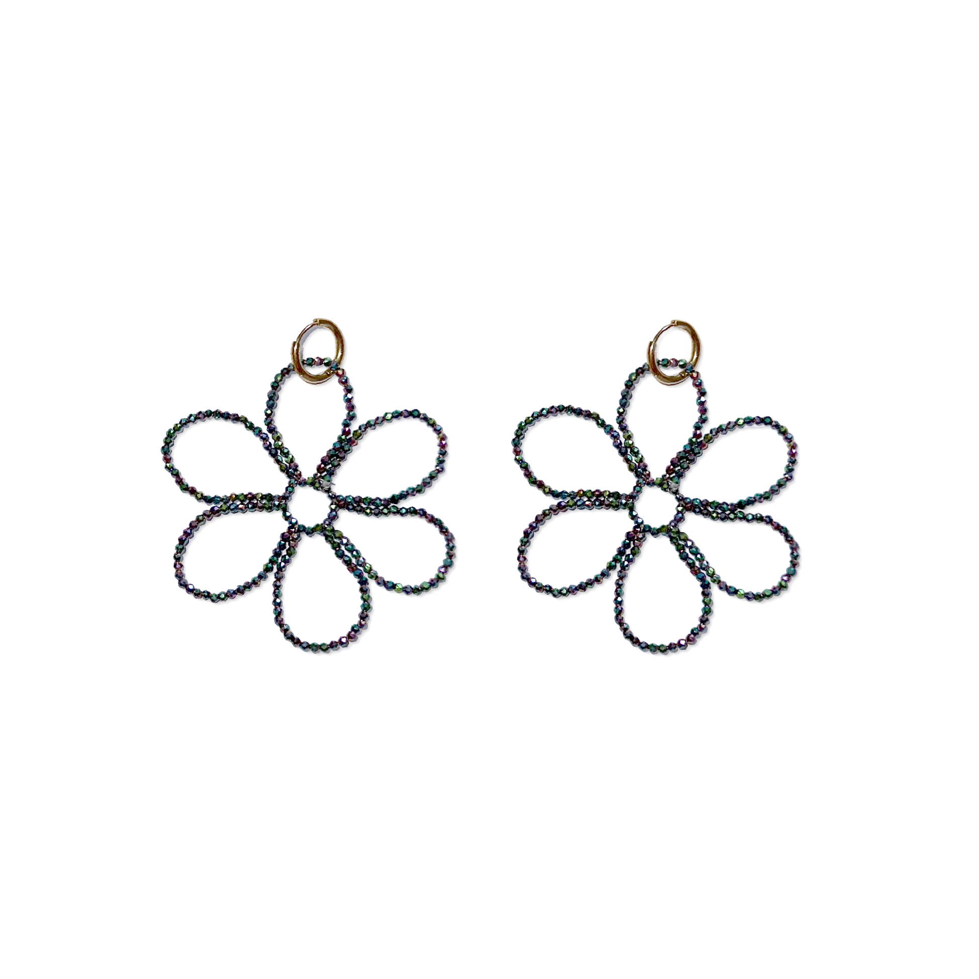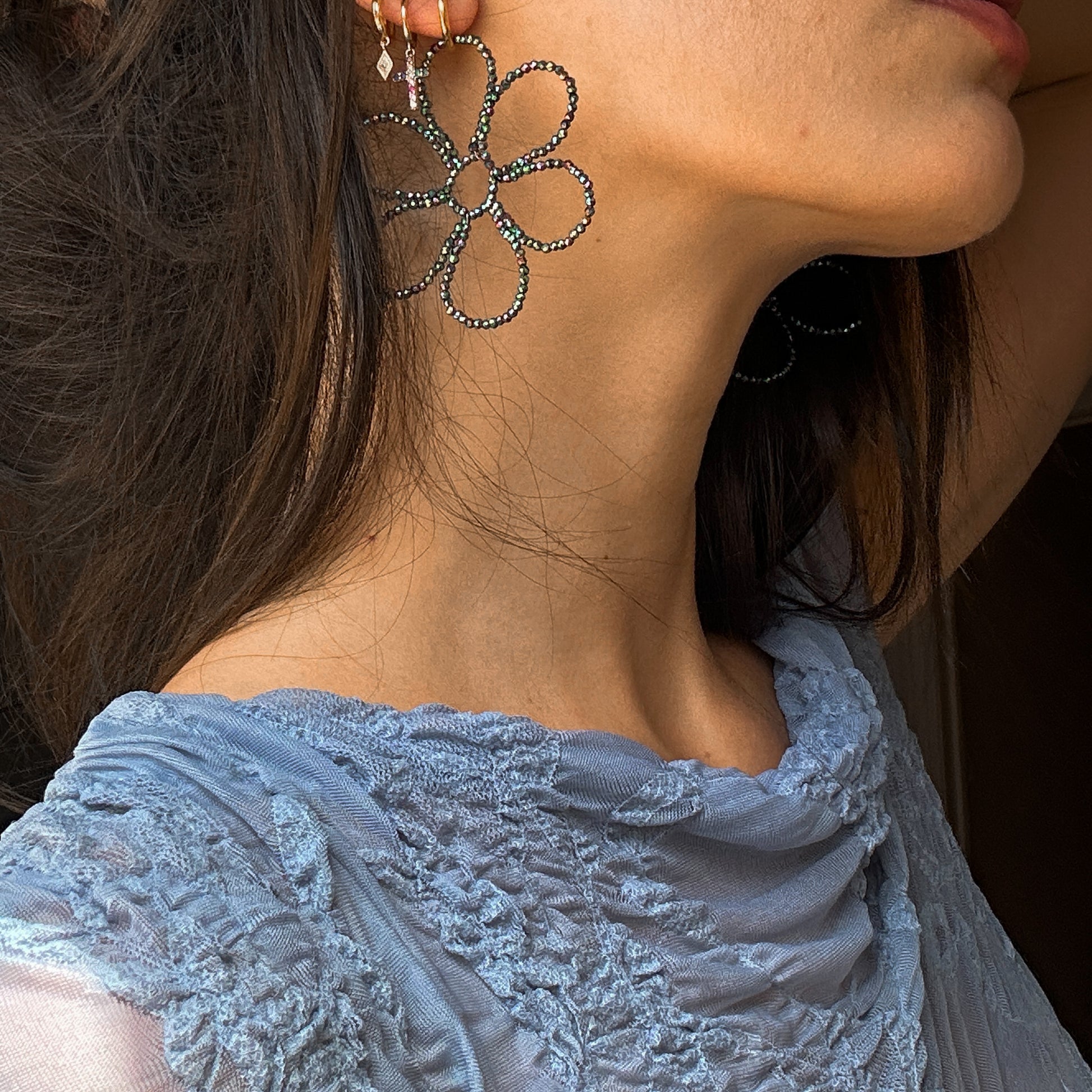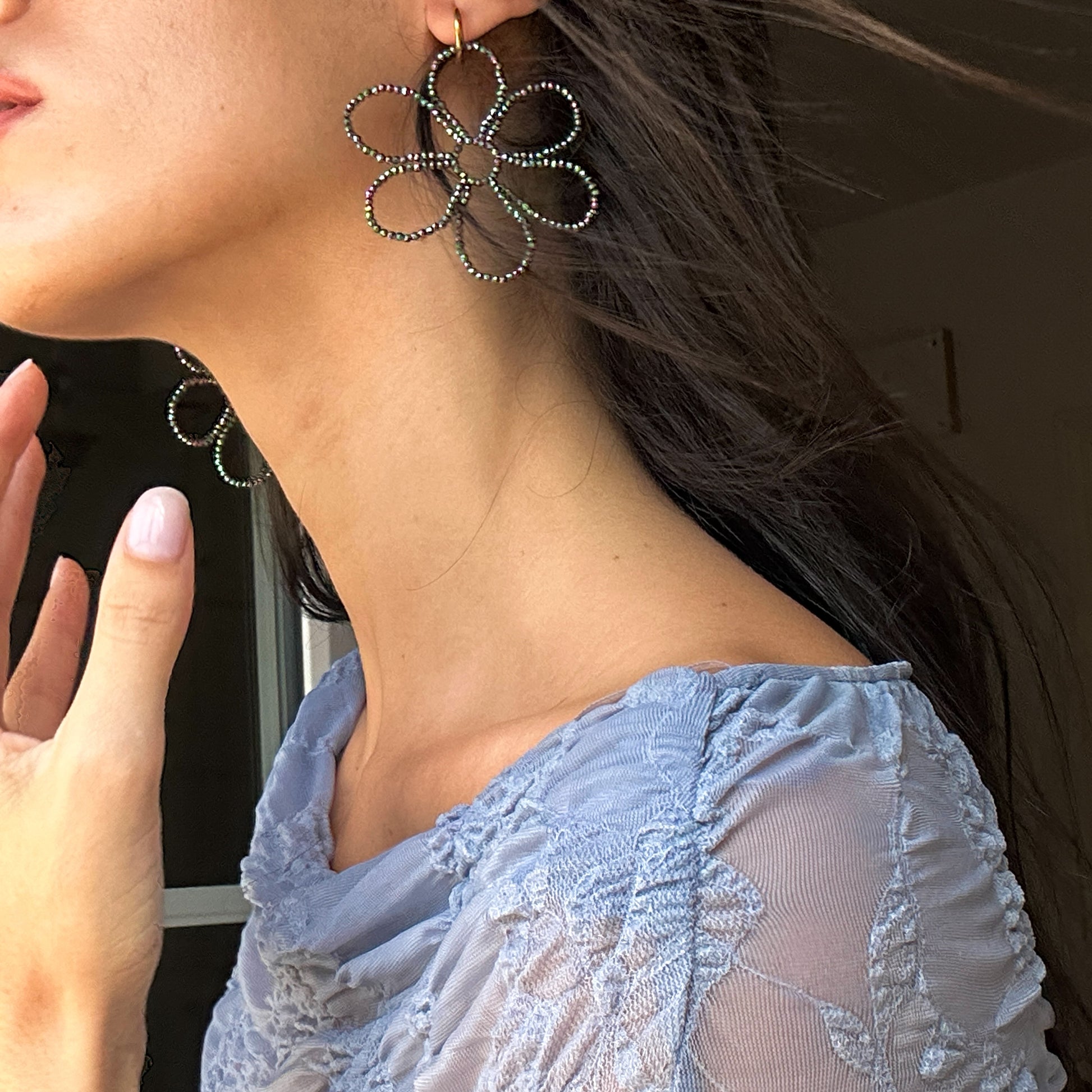 Handmade flower hoop earrings made with tiny chrome greenish Swarovski crystals.