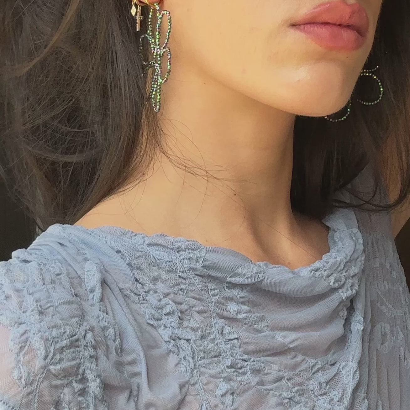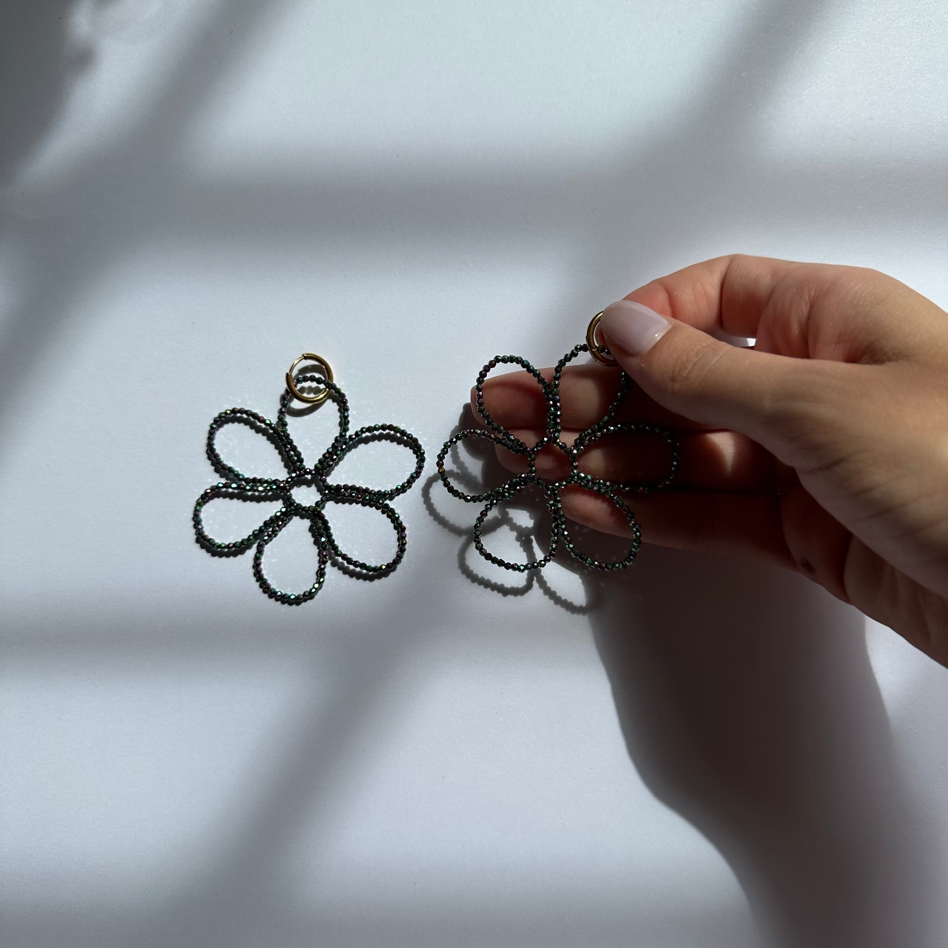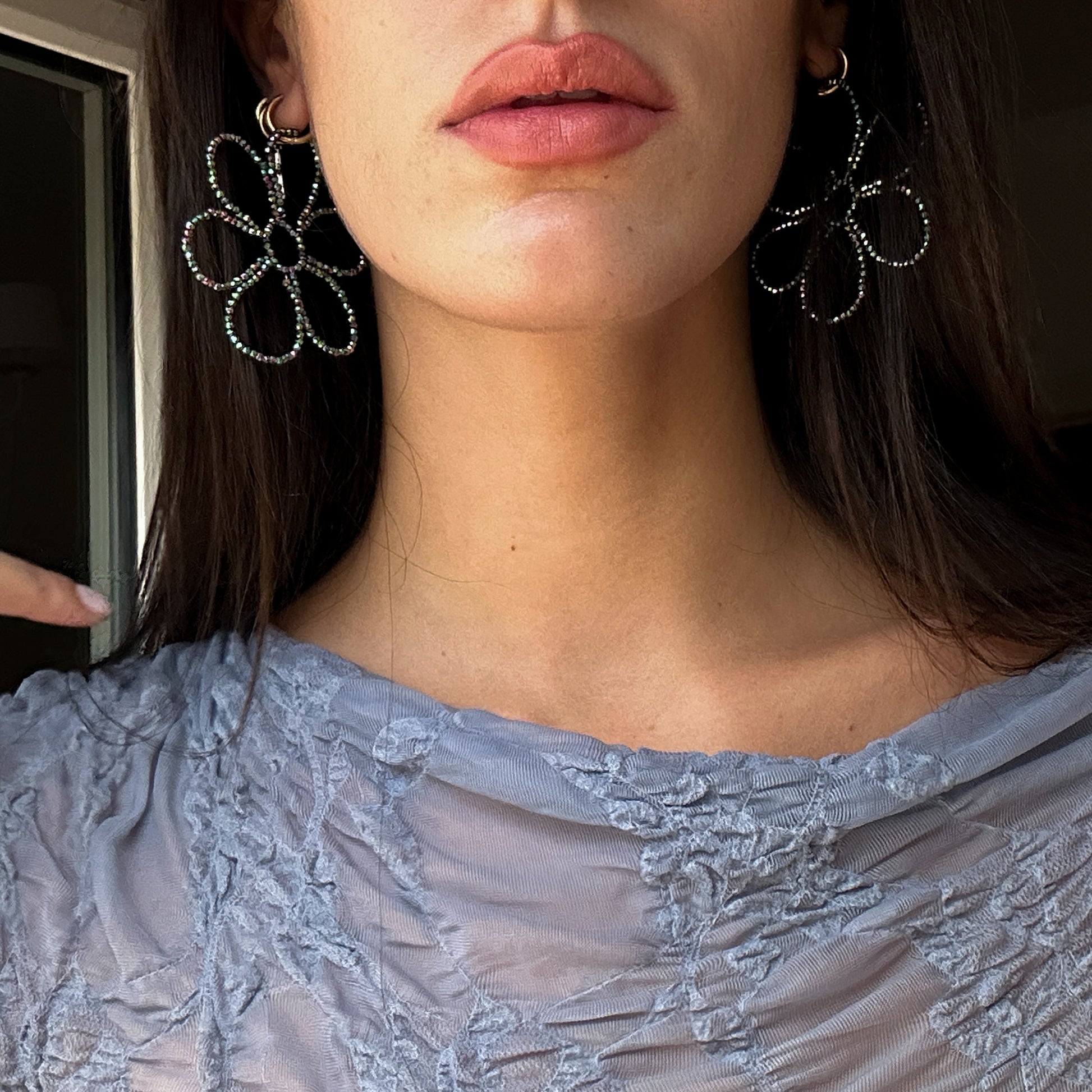 Handmade flower hoop earrings made with tiny chrome greenish Swarovski crystals.
