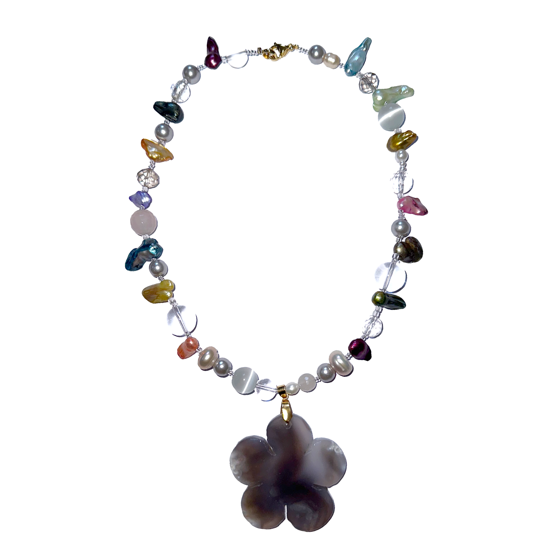 Big glass greyish flower pendant, spike pearls, rounded beads and a stainless steel golden clasp.