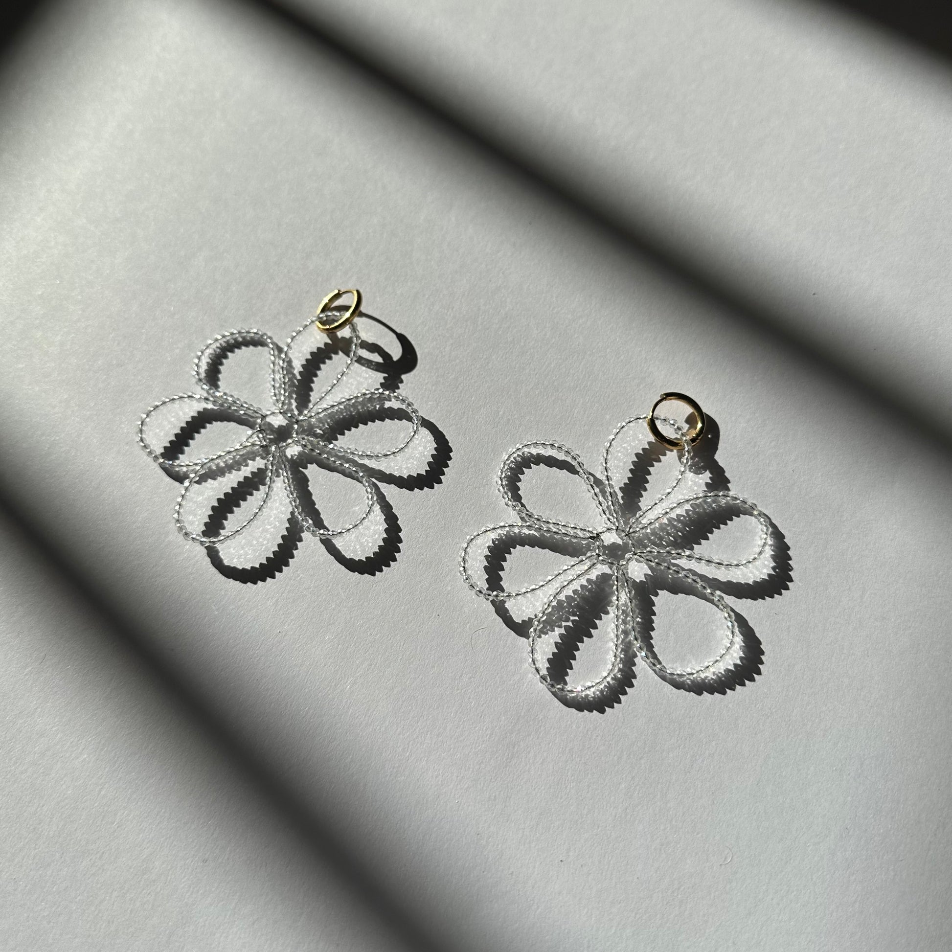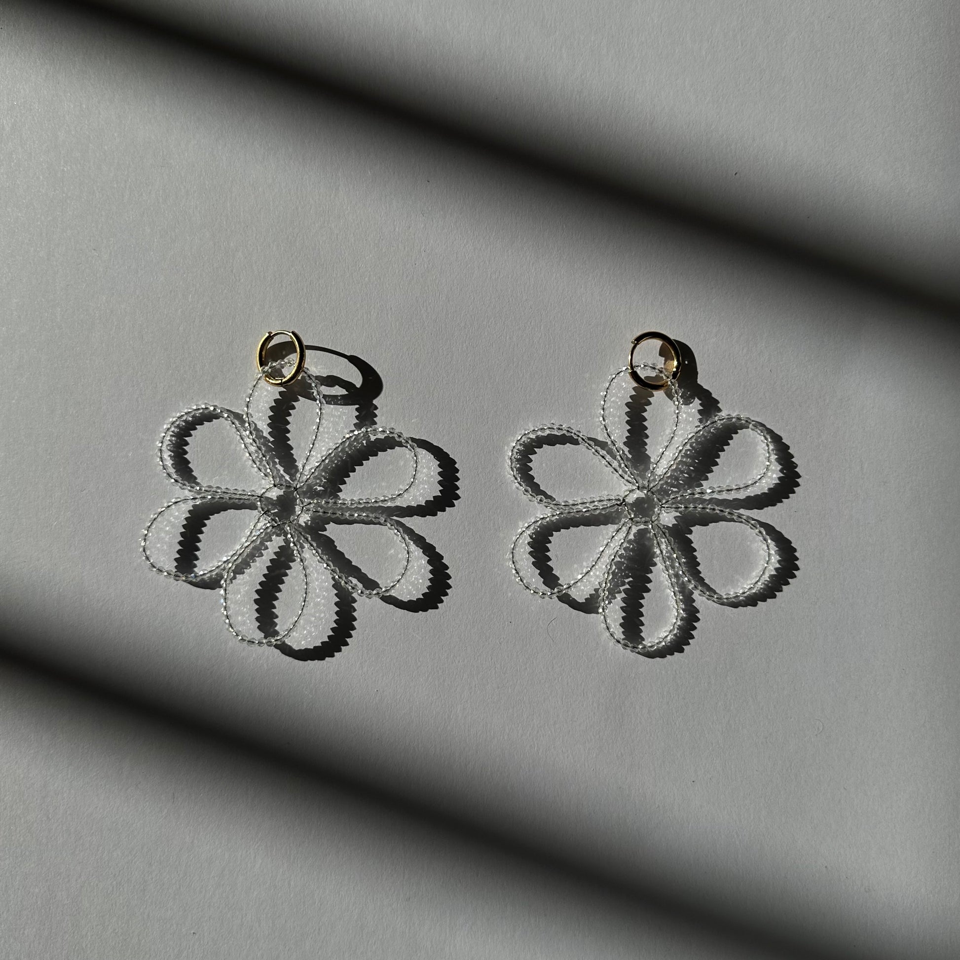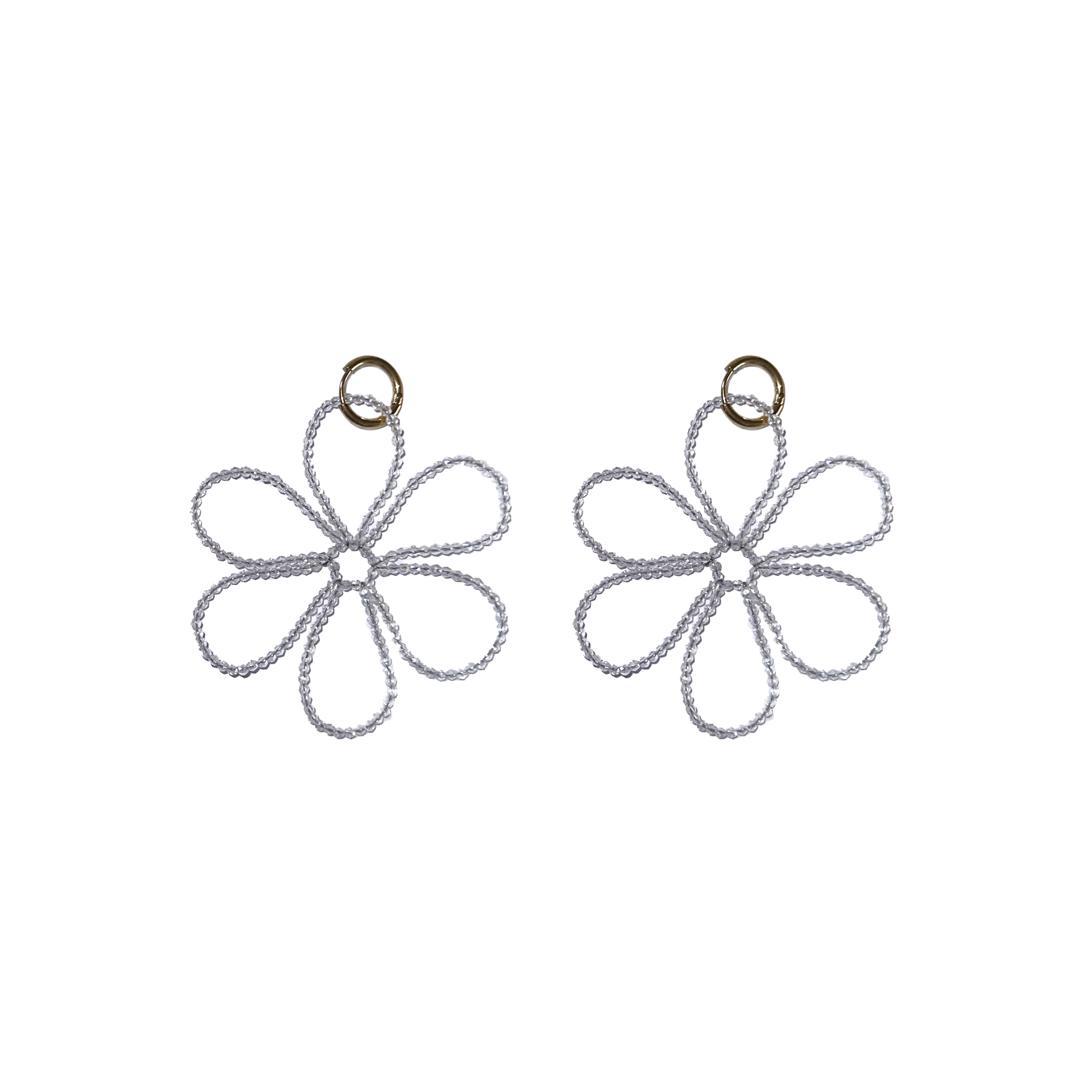 Handmade flower, stainless steel gold hoop earrings made with tiny white-ish/transparent Swarovski beads!