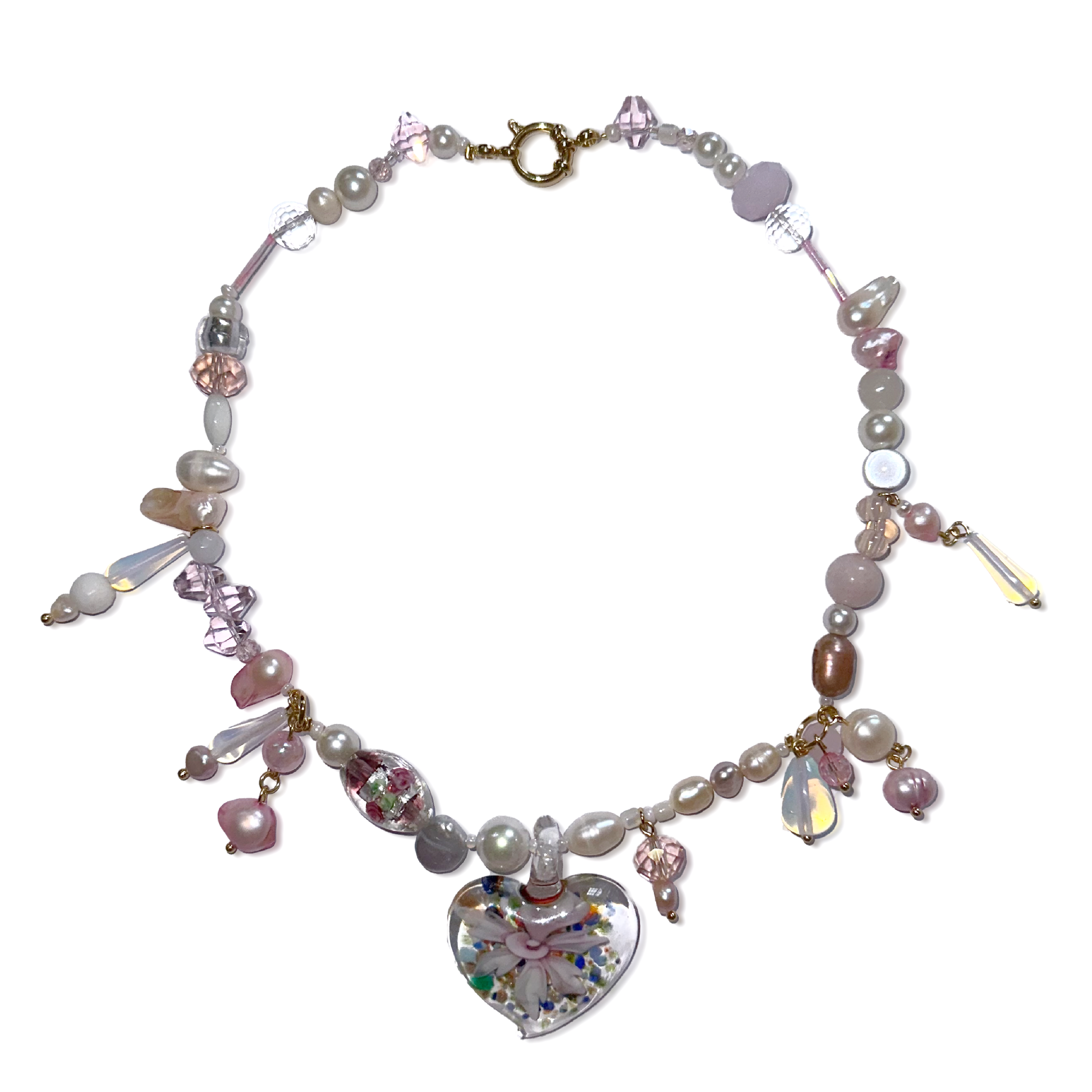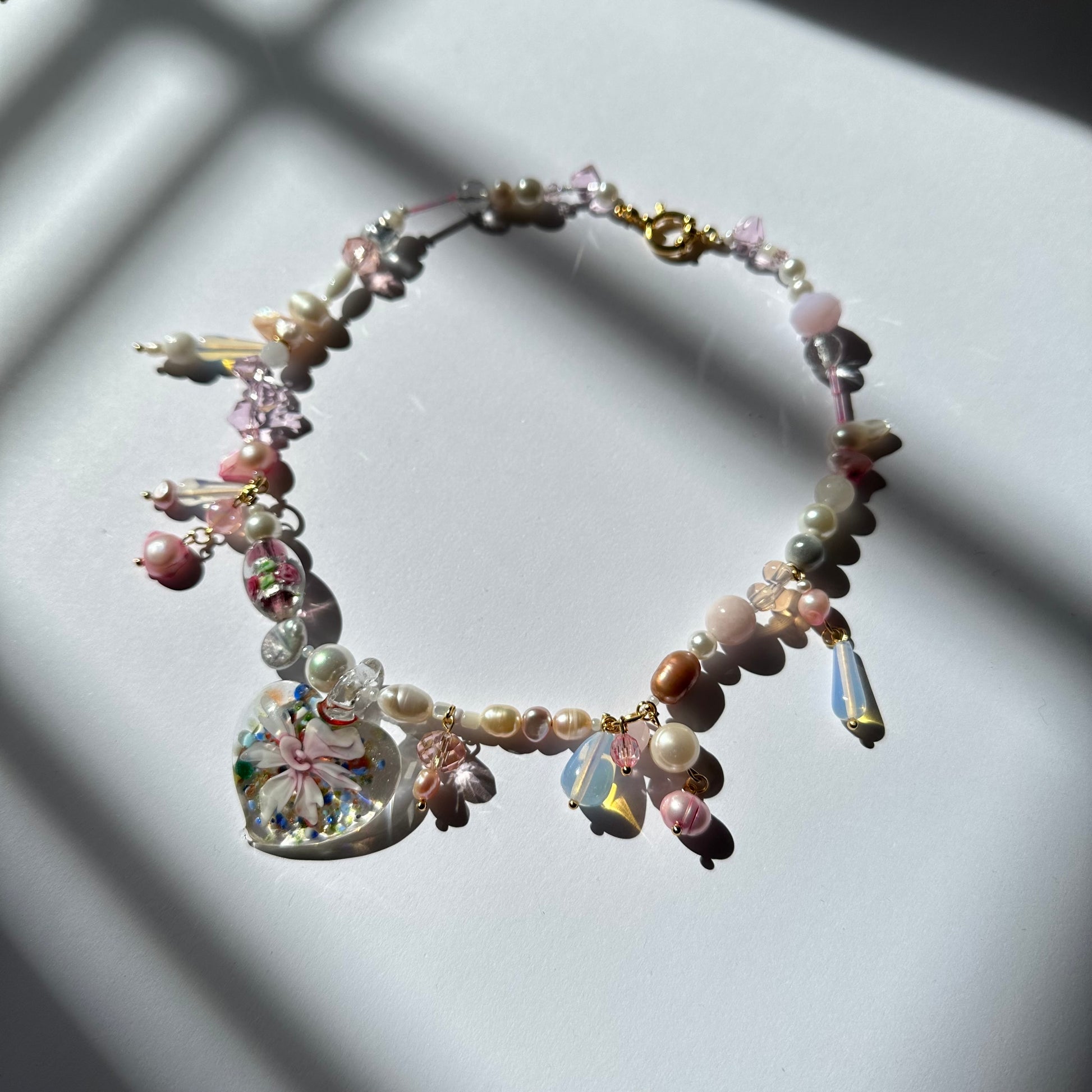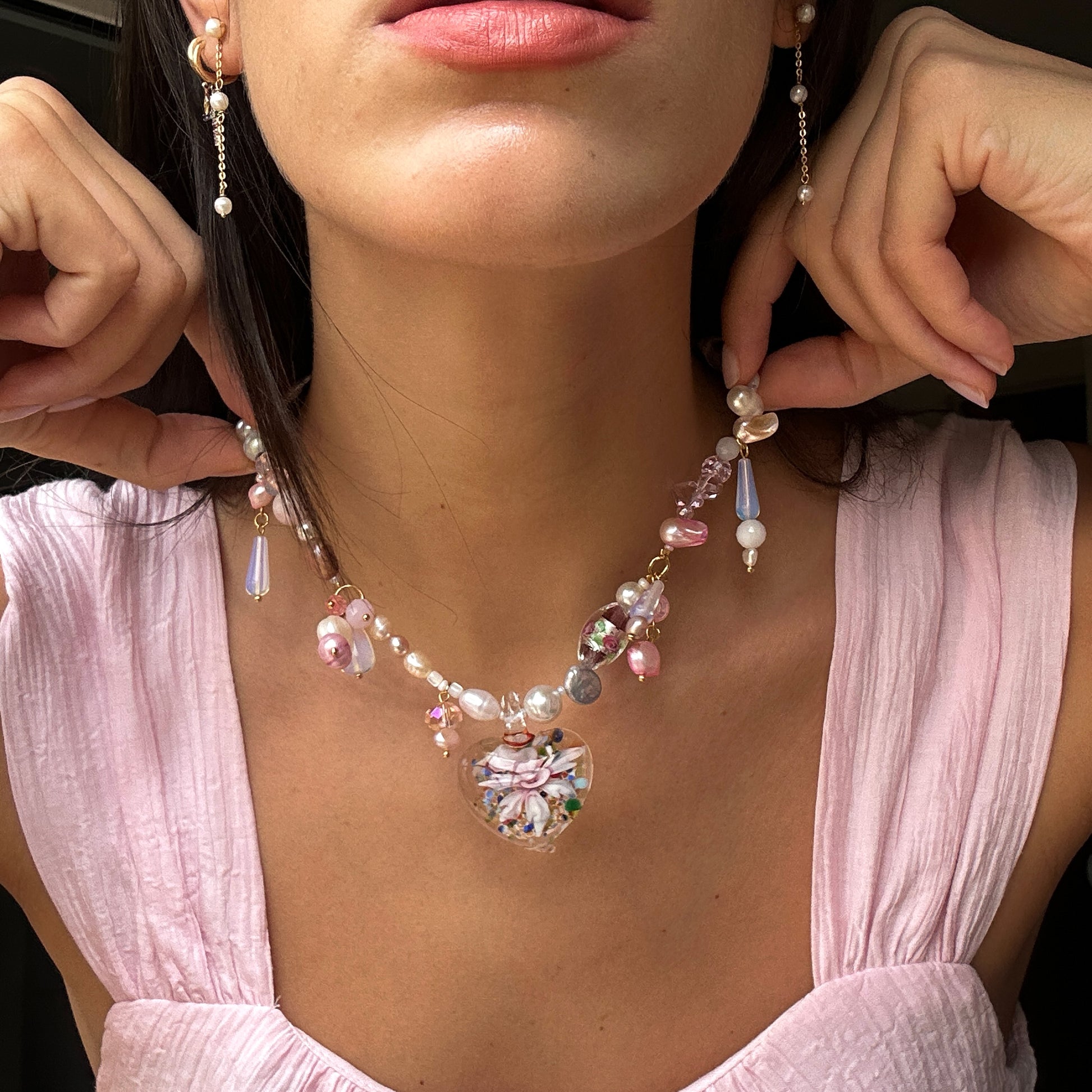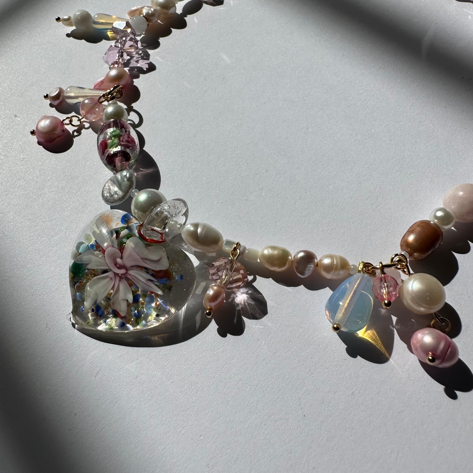 New design & type of heart glass pendant, with a flower inside, seed beads, real freshwater pearls, crystal beads, little cute hanging beads that add dimension and volume, stainless steel golden clasp.