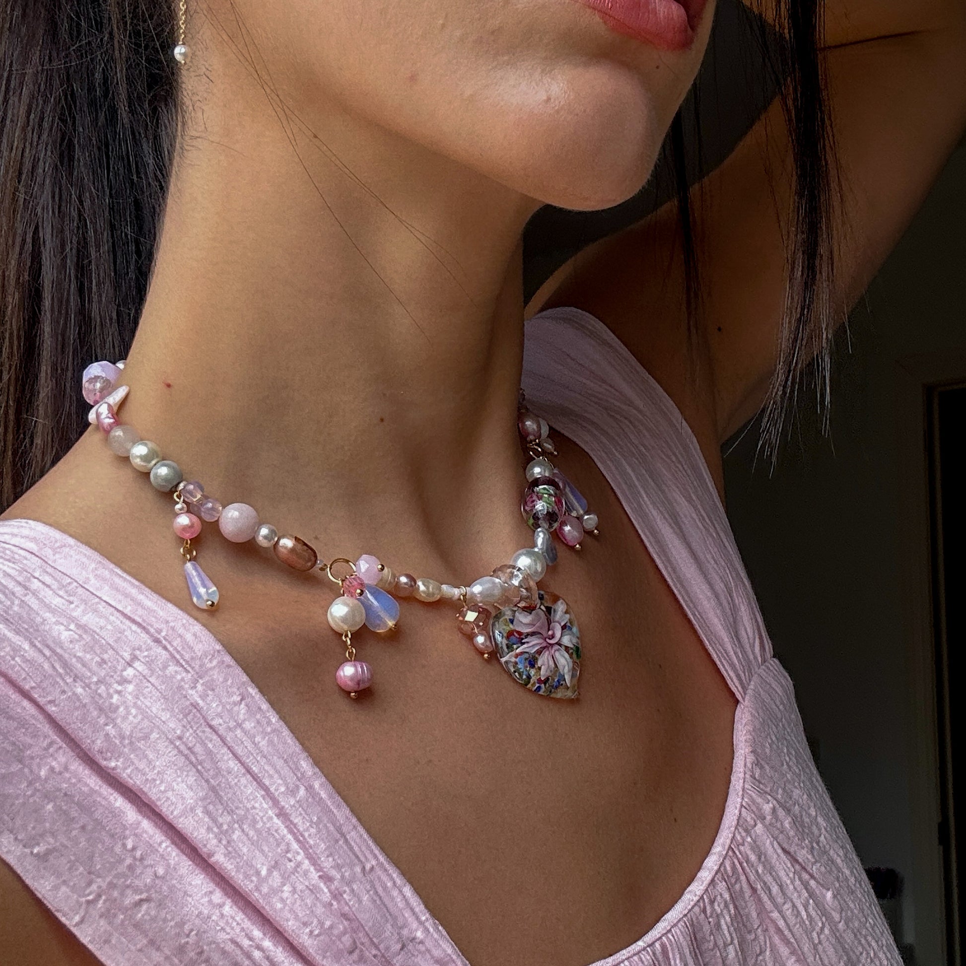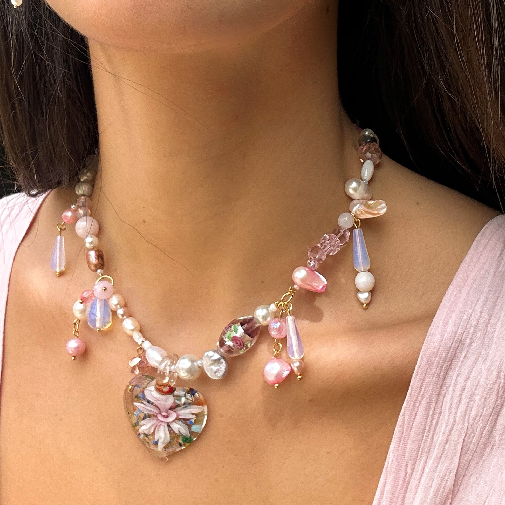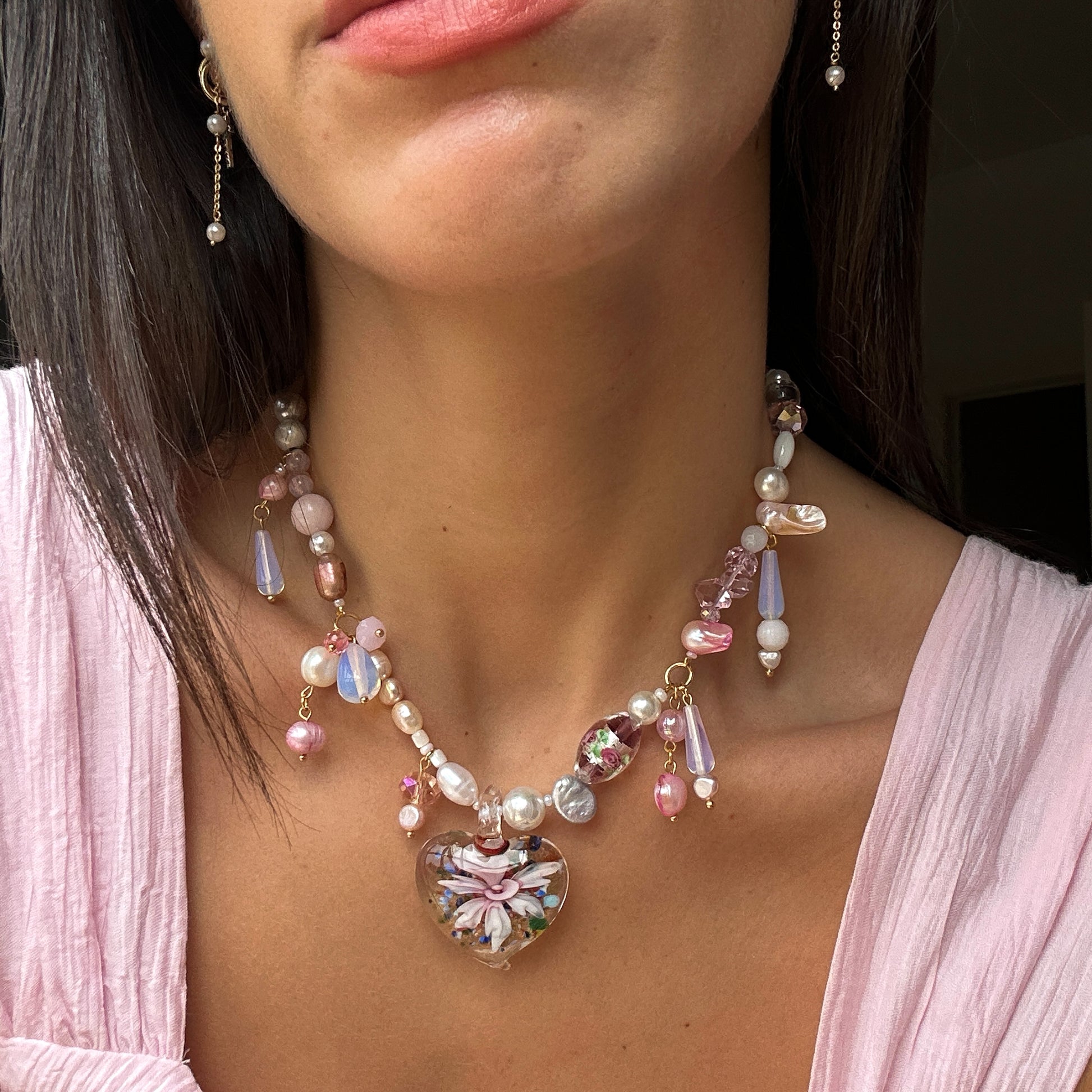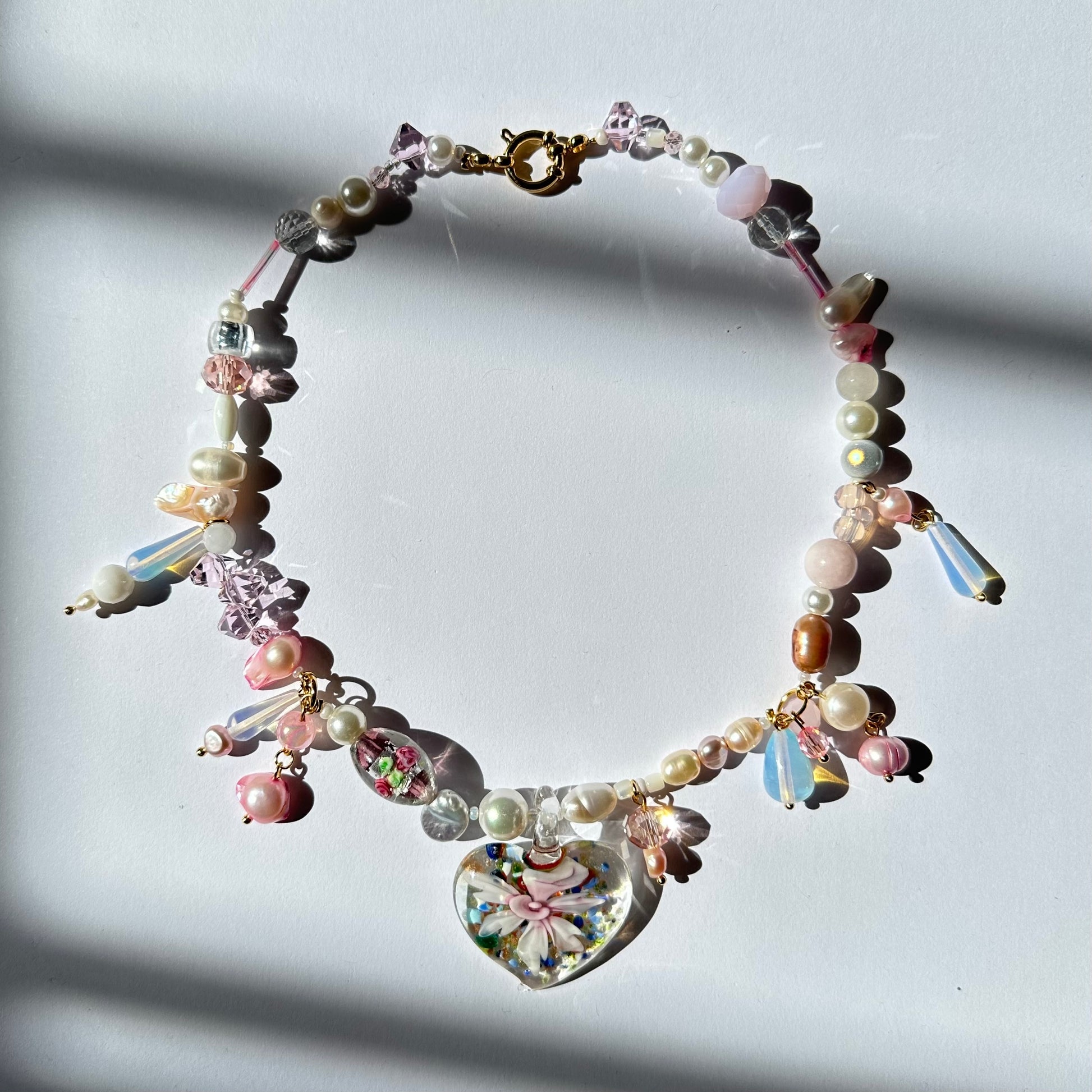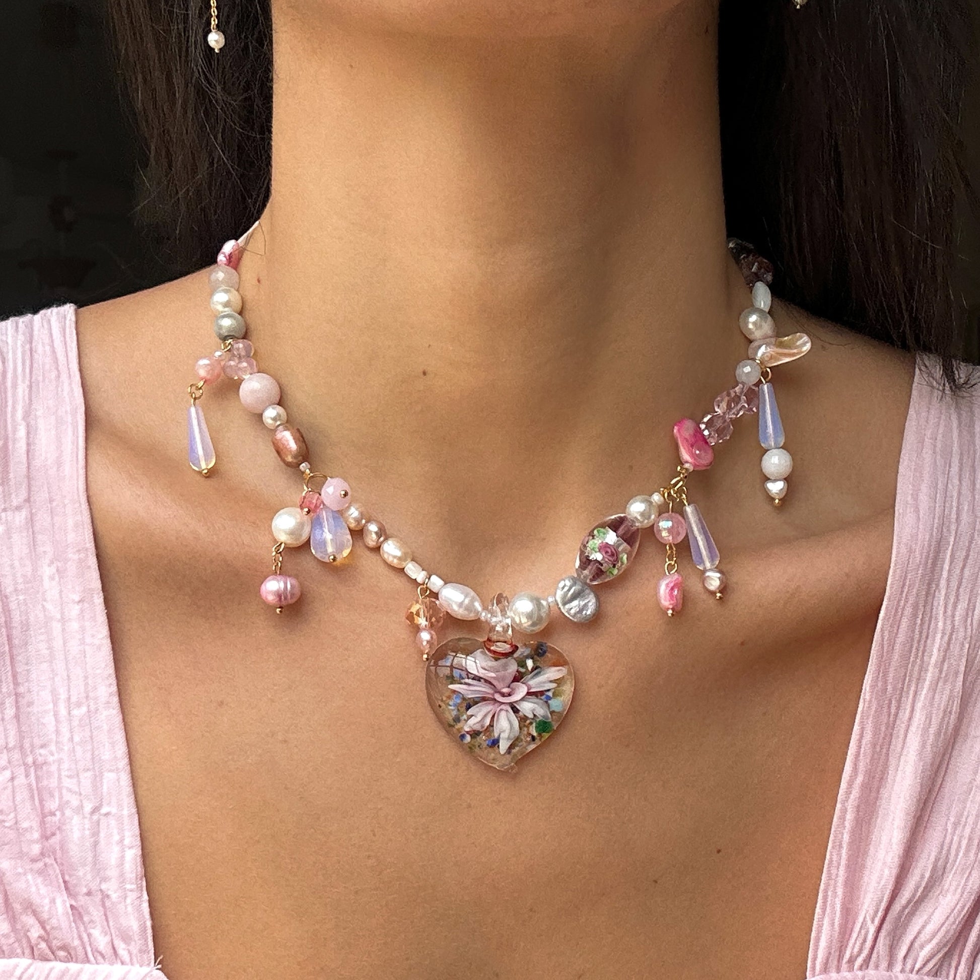 New design & type of heart glass pendant, with a flower inside, seed beads, real freshwater pearls, crystal beads, little cute hanging beads that add dimension and volume, stainless steel golden clasp.