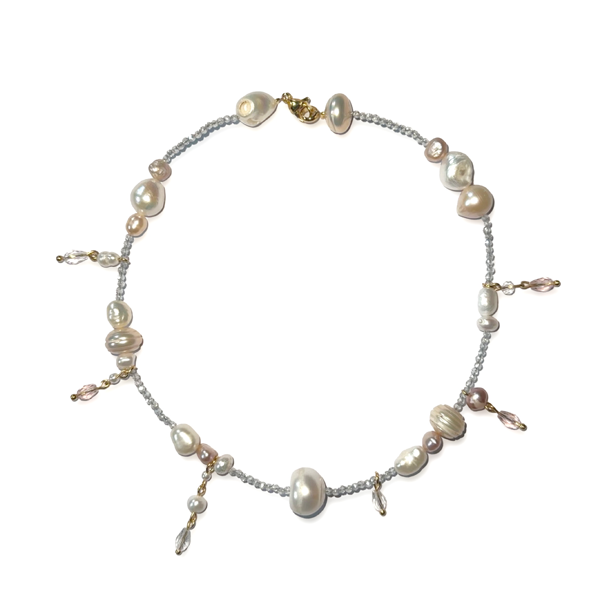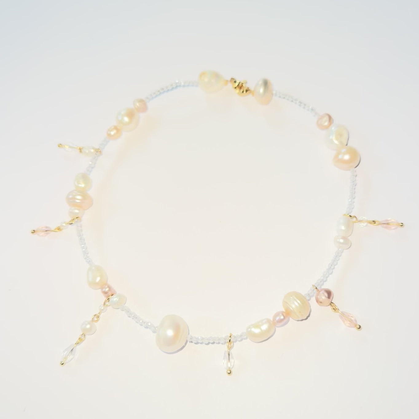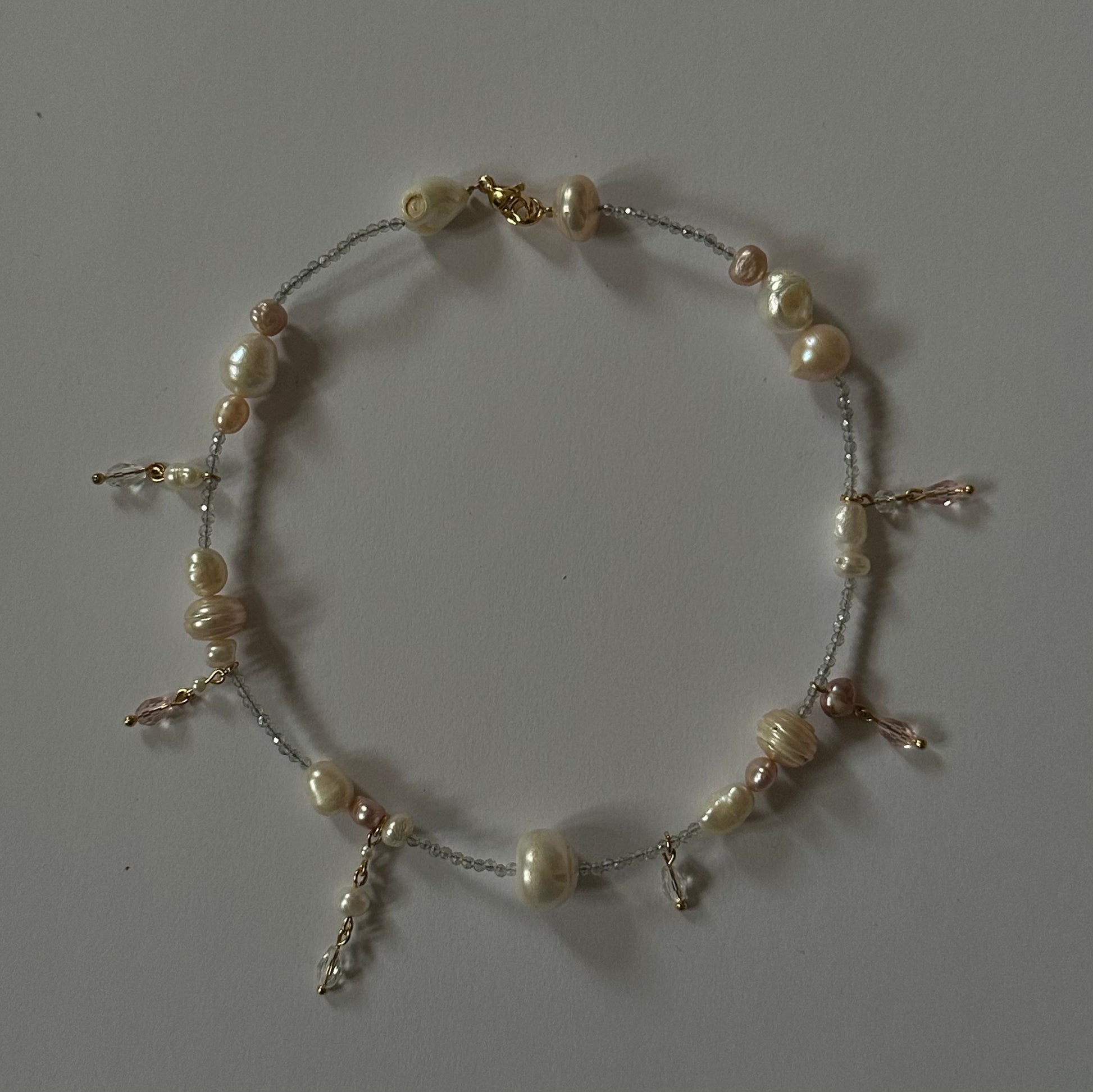 Little dainty pearl necklace, and small little drop crystals, Swarovski crystals, stainless steel golden clasp