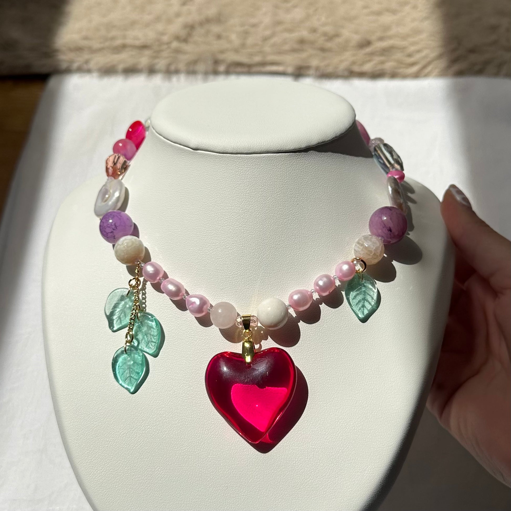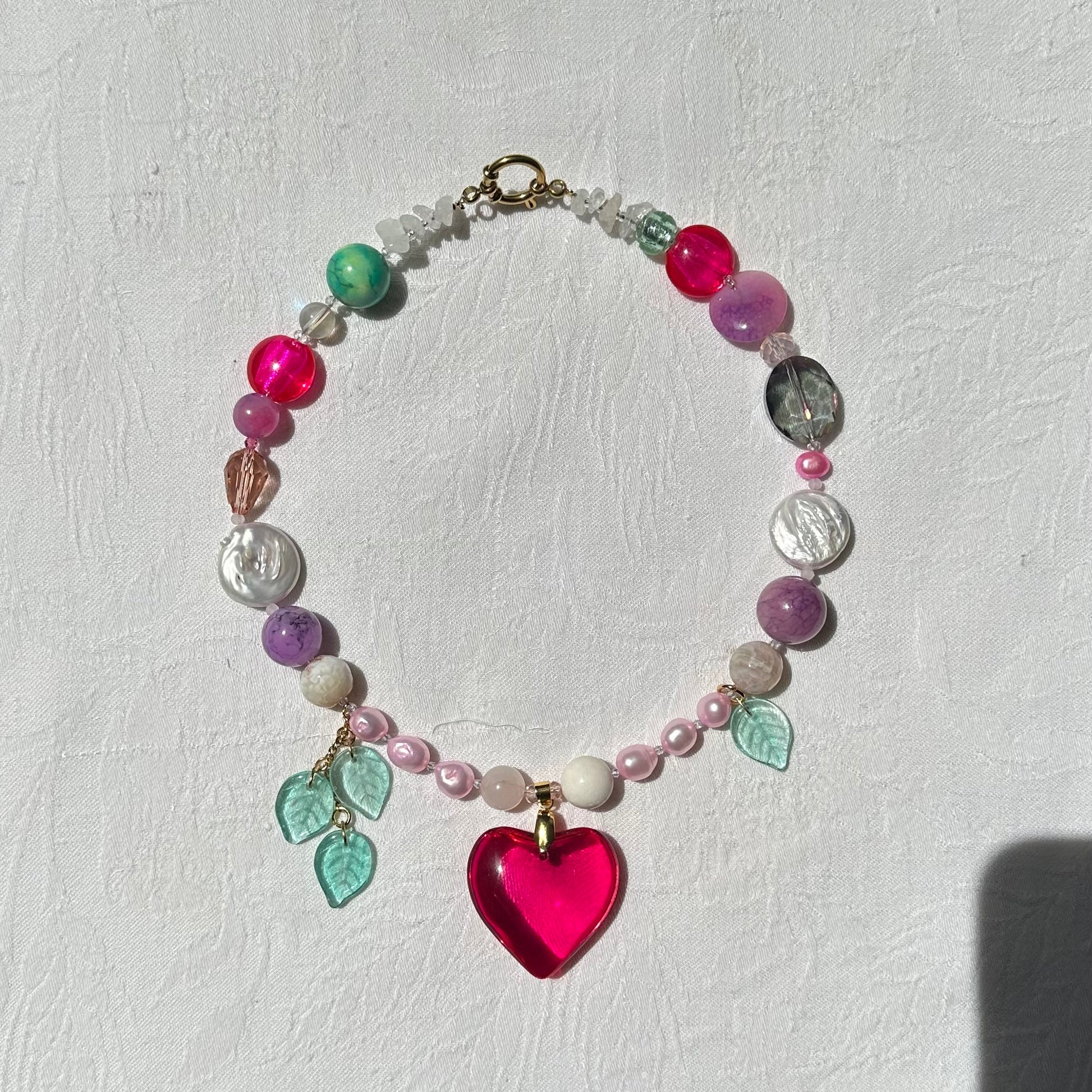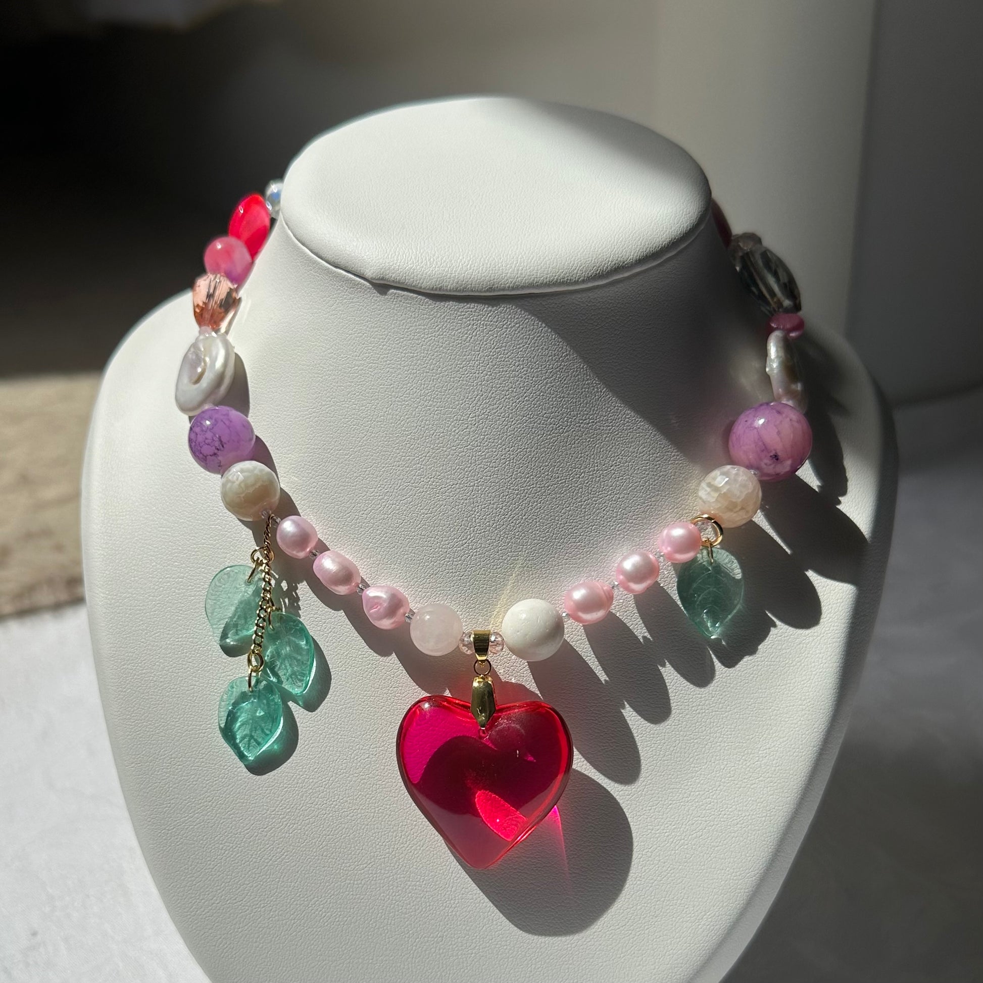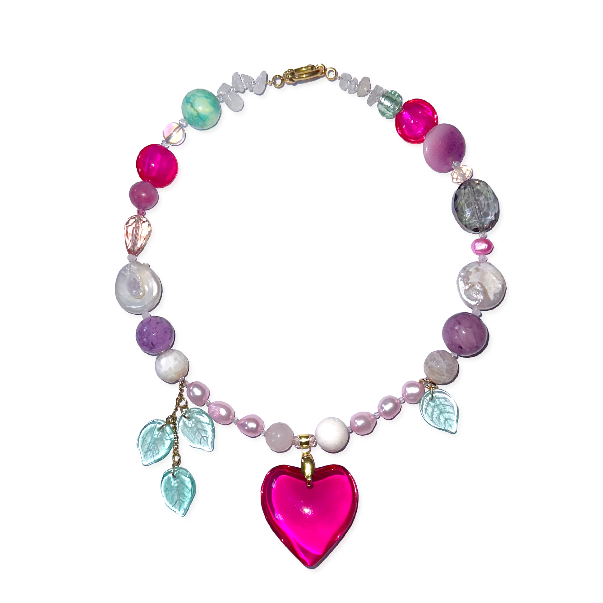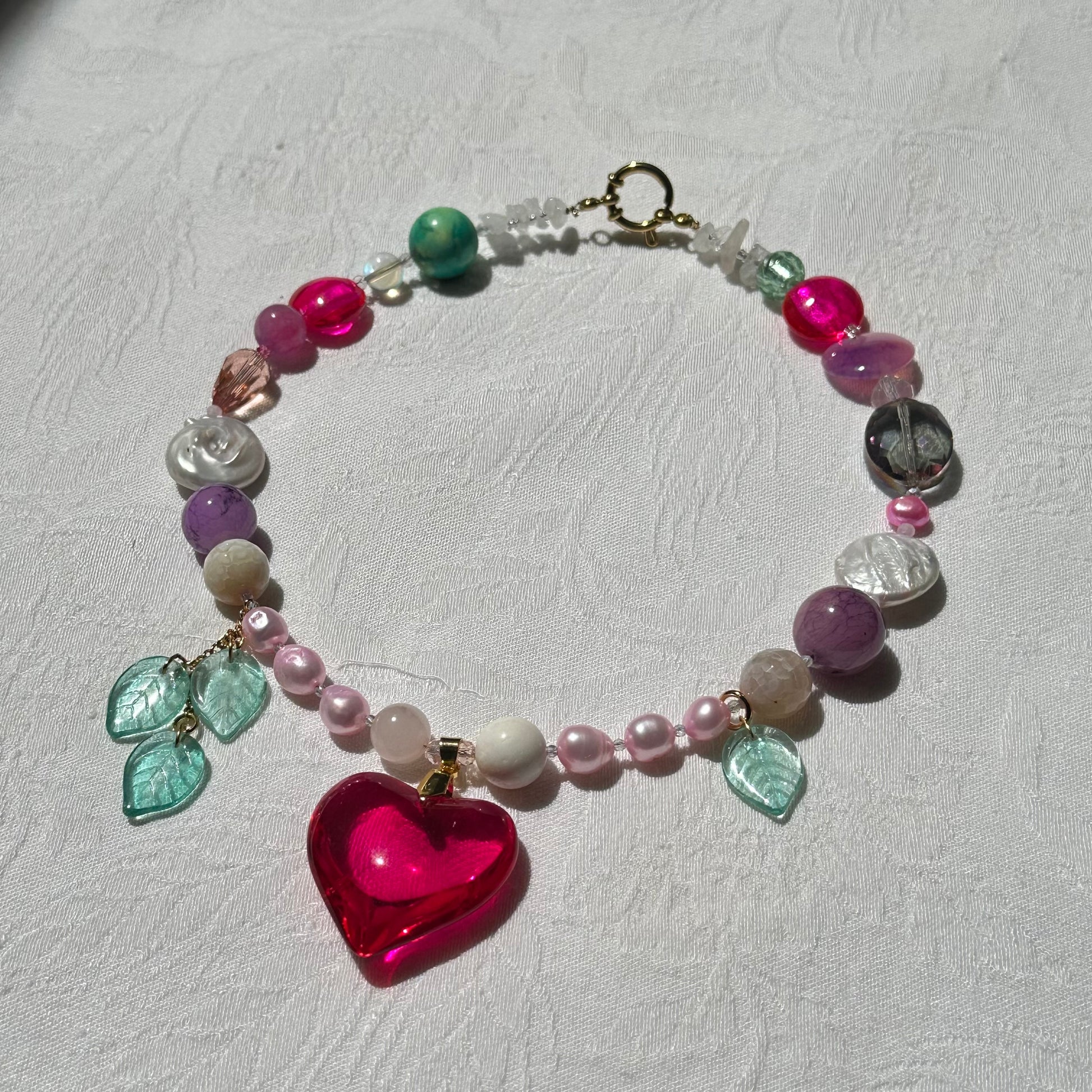 Handmade bright pink (fuscia) heart glass necklace, made with freshwater pearls, and crystal glass beads, crystal leaf beads, stainless steel golden clasp.