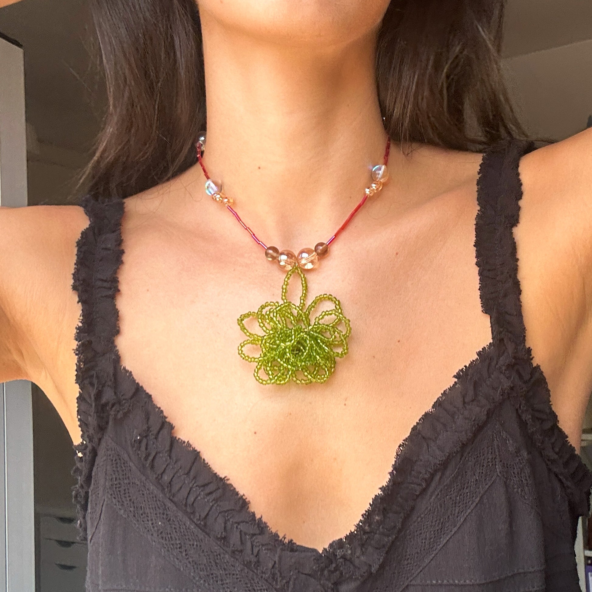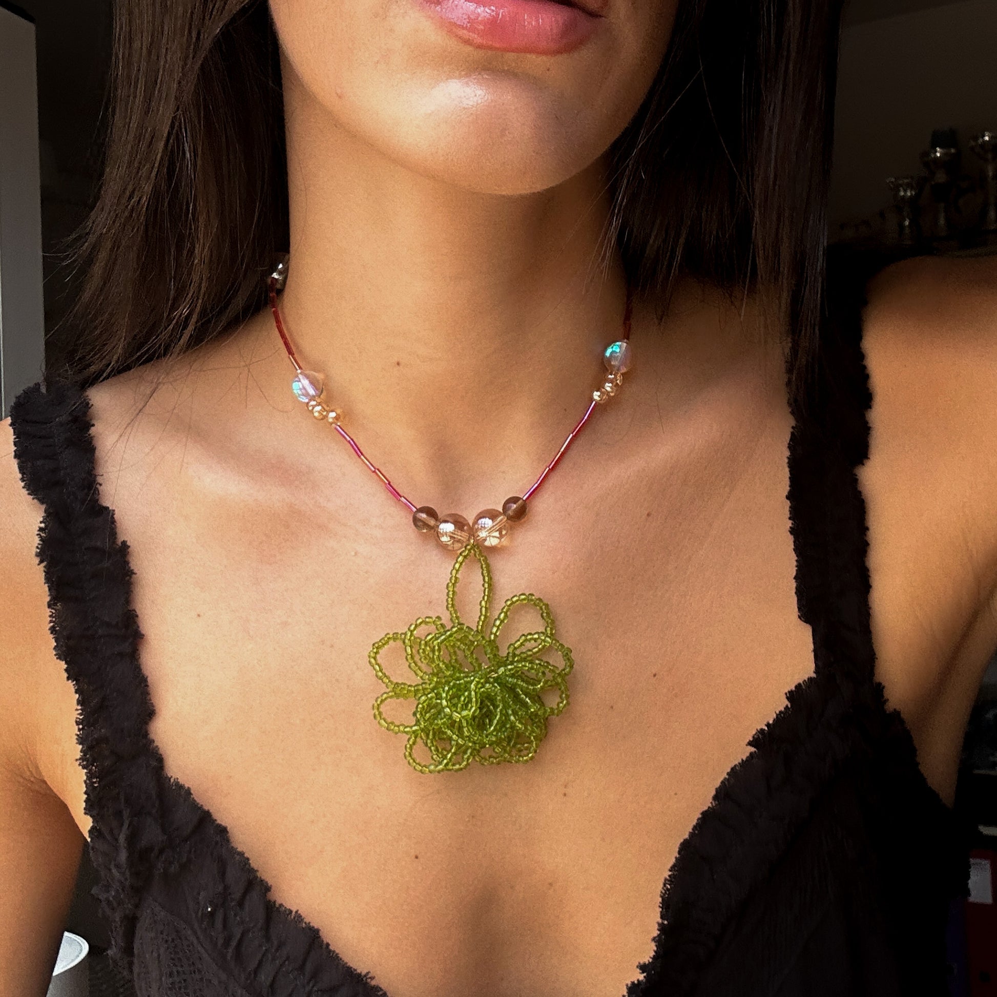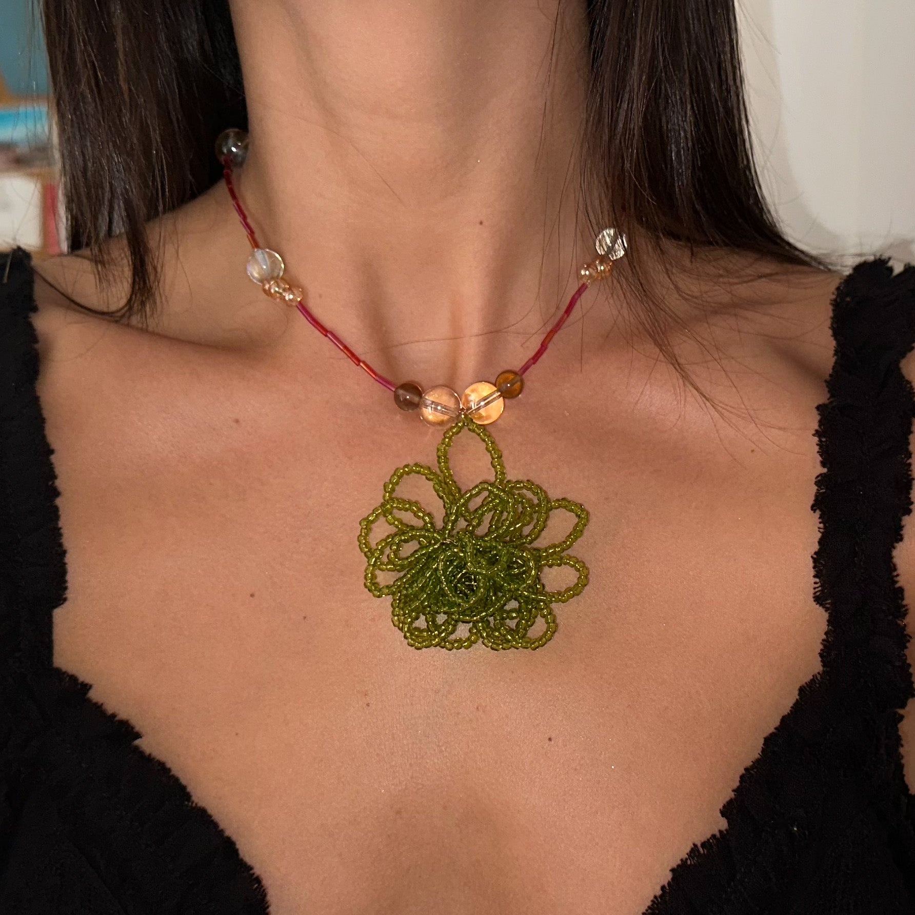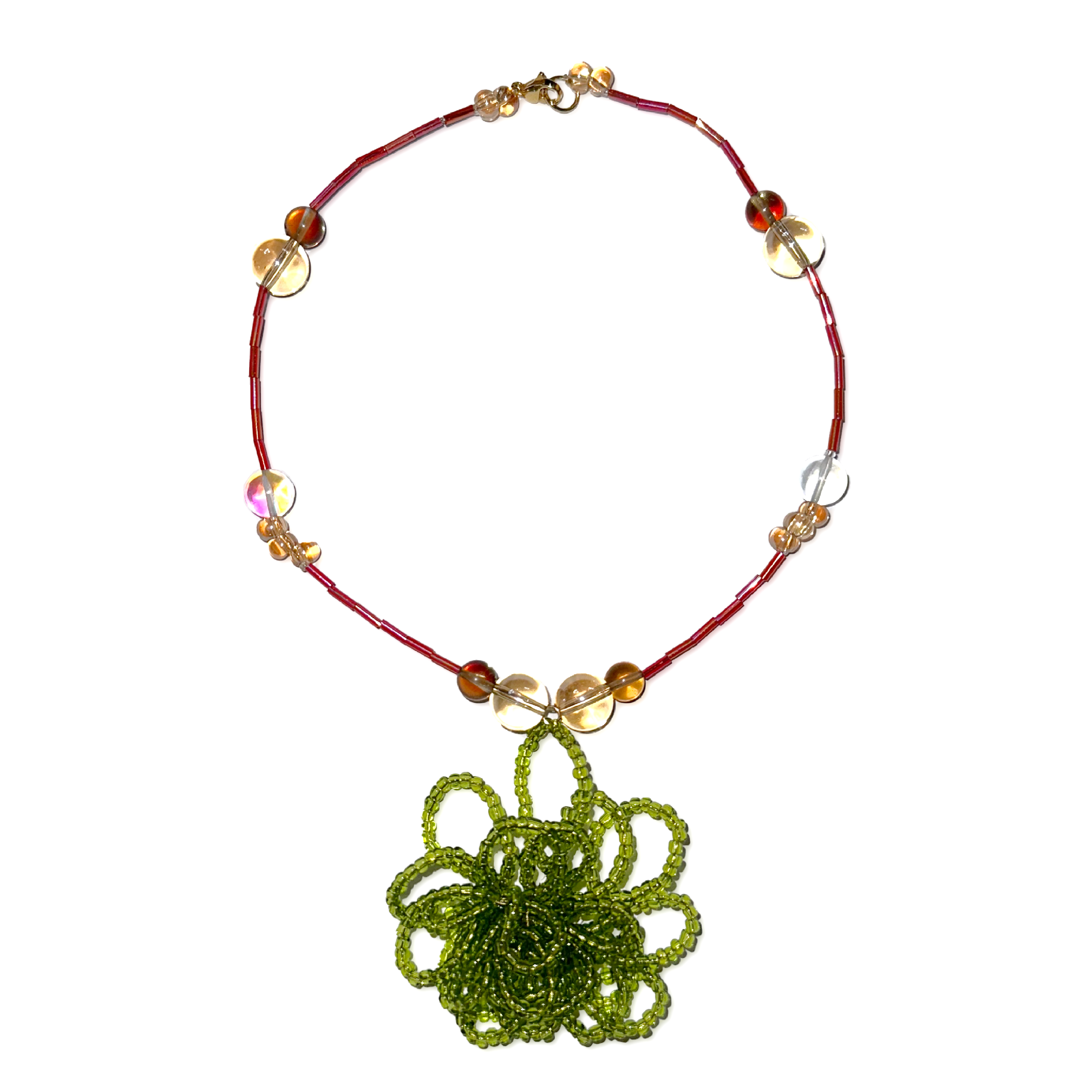 handmade green beaded flower pendant, tube beads, crystal iridescent beads in two different sizes, stainless steel golden clasp.