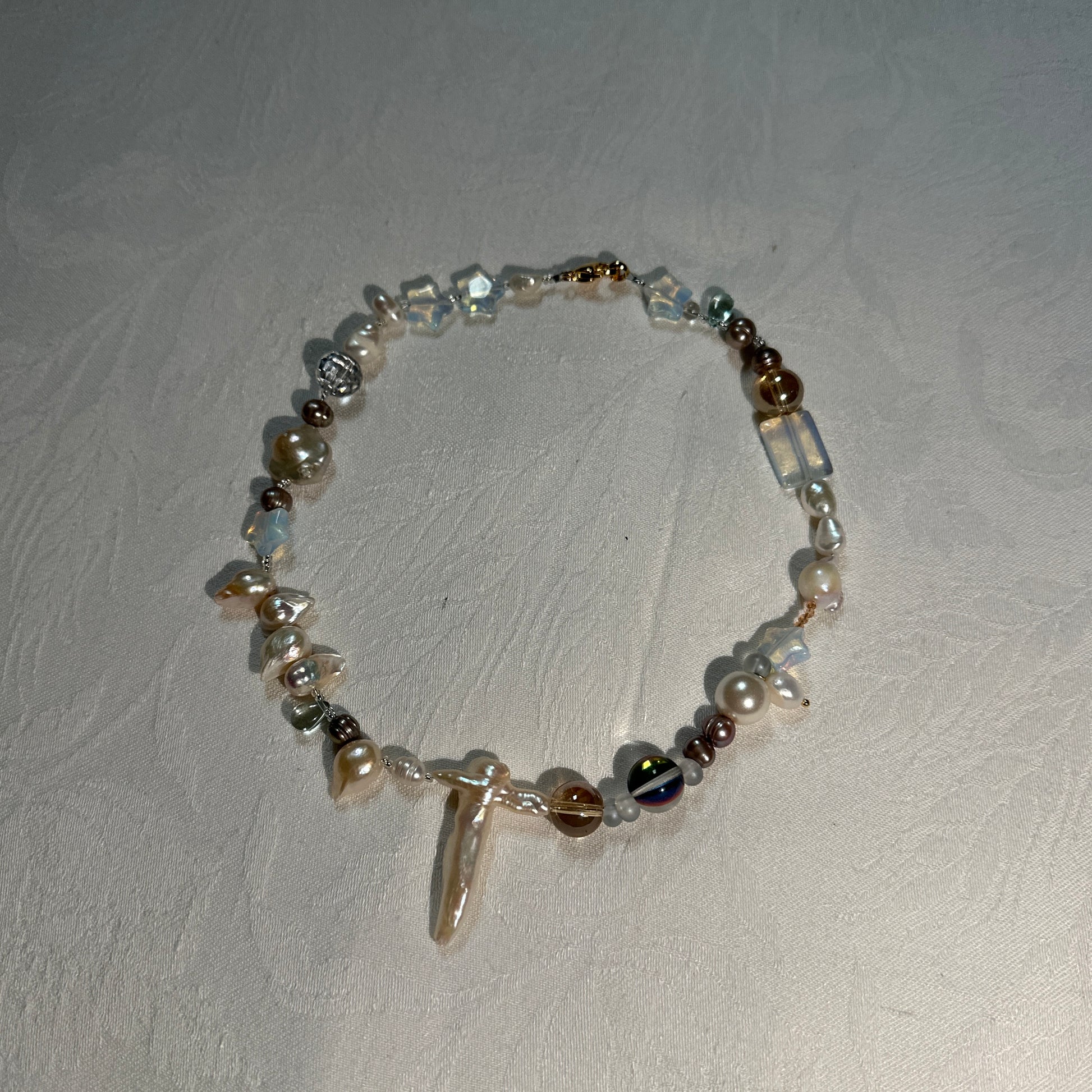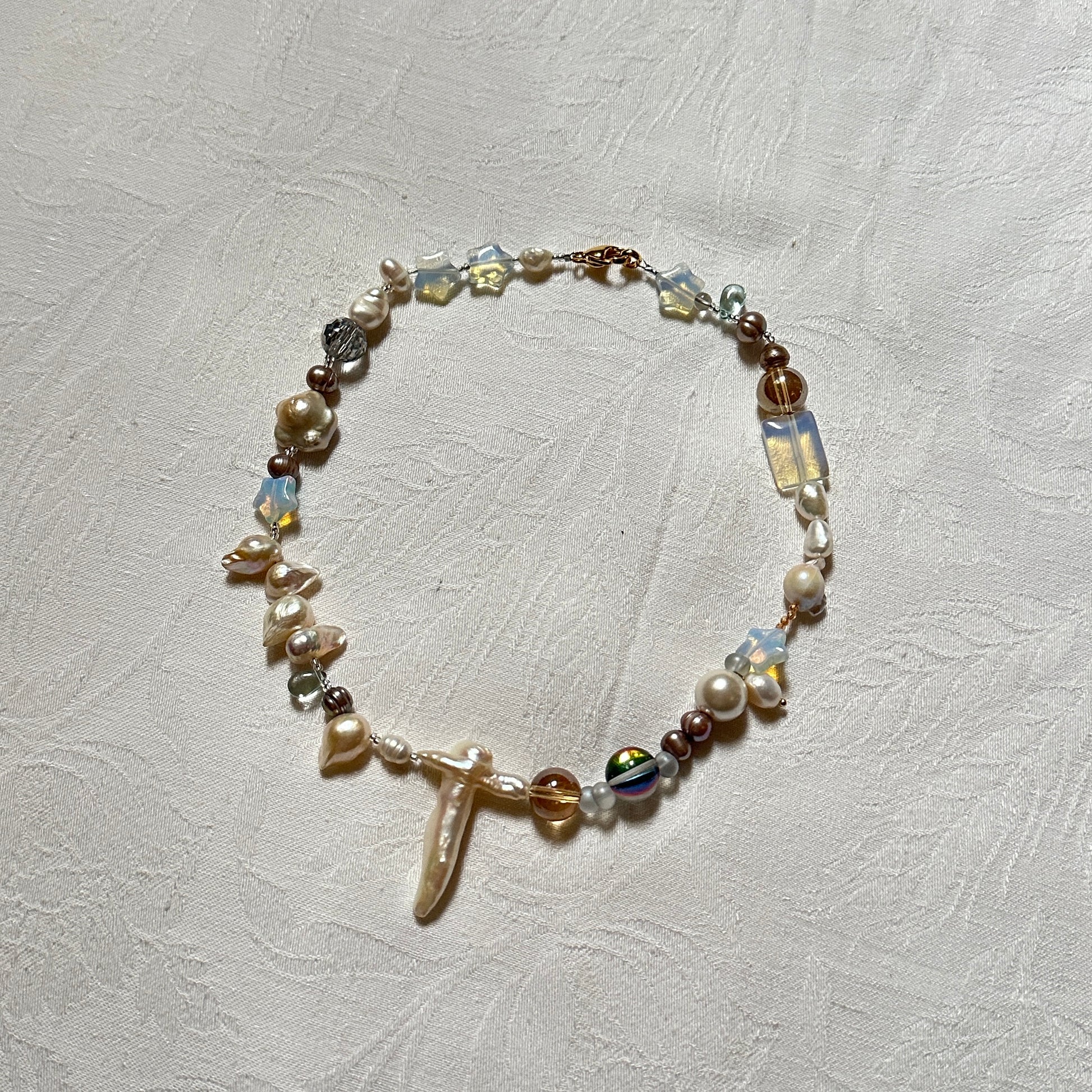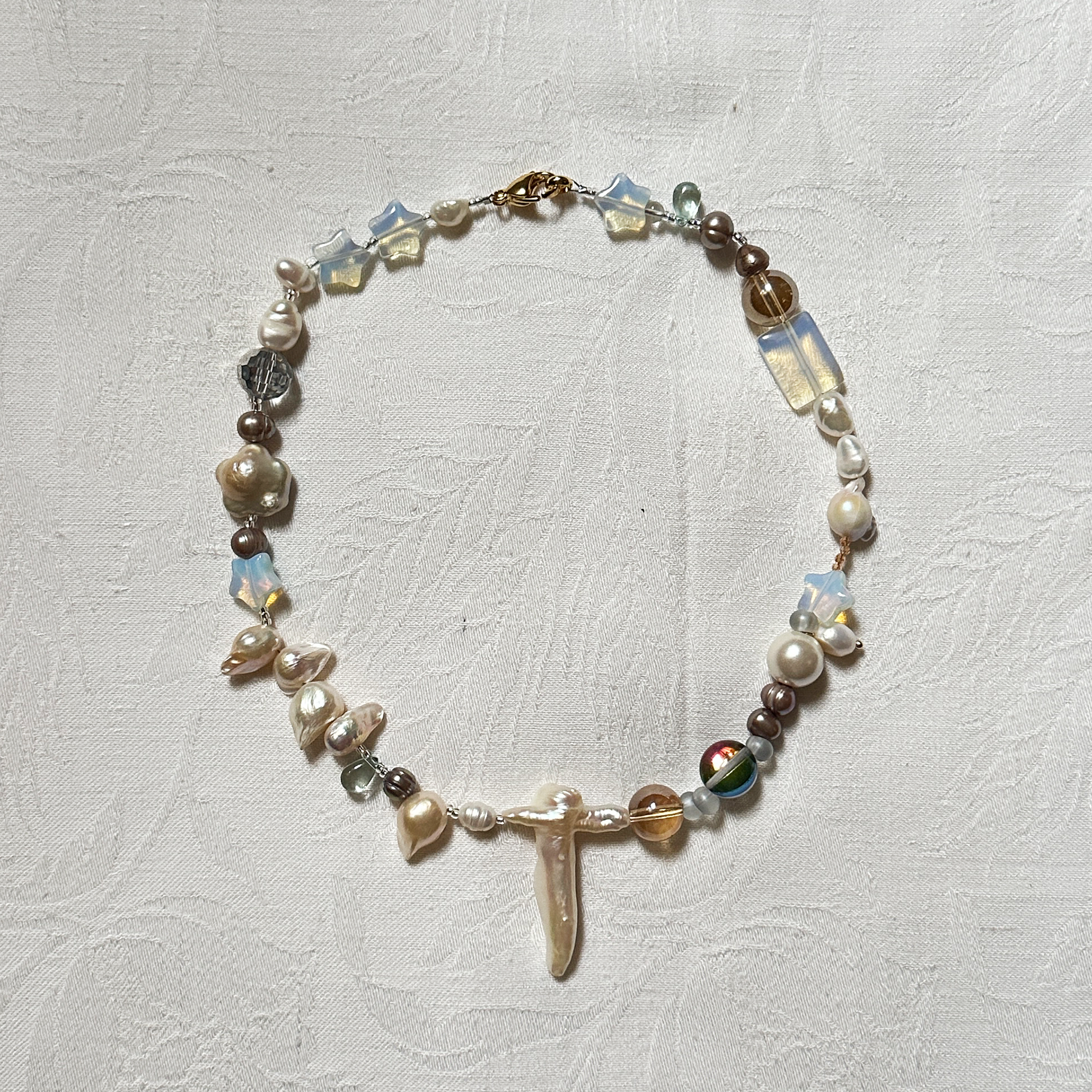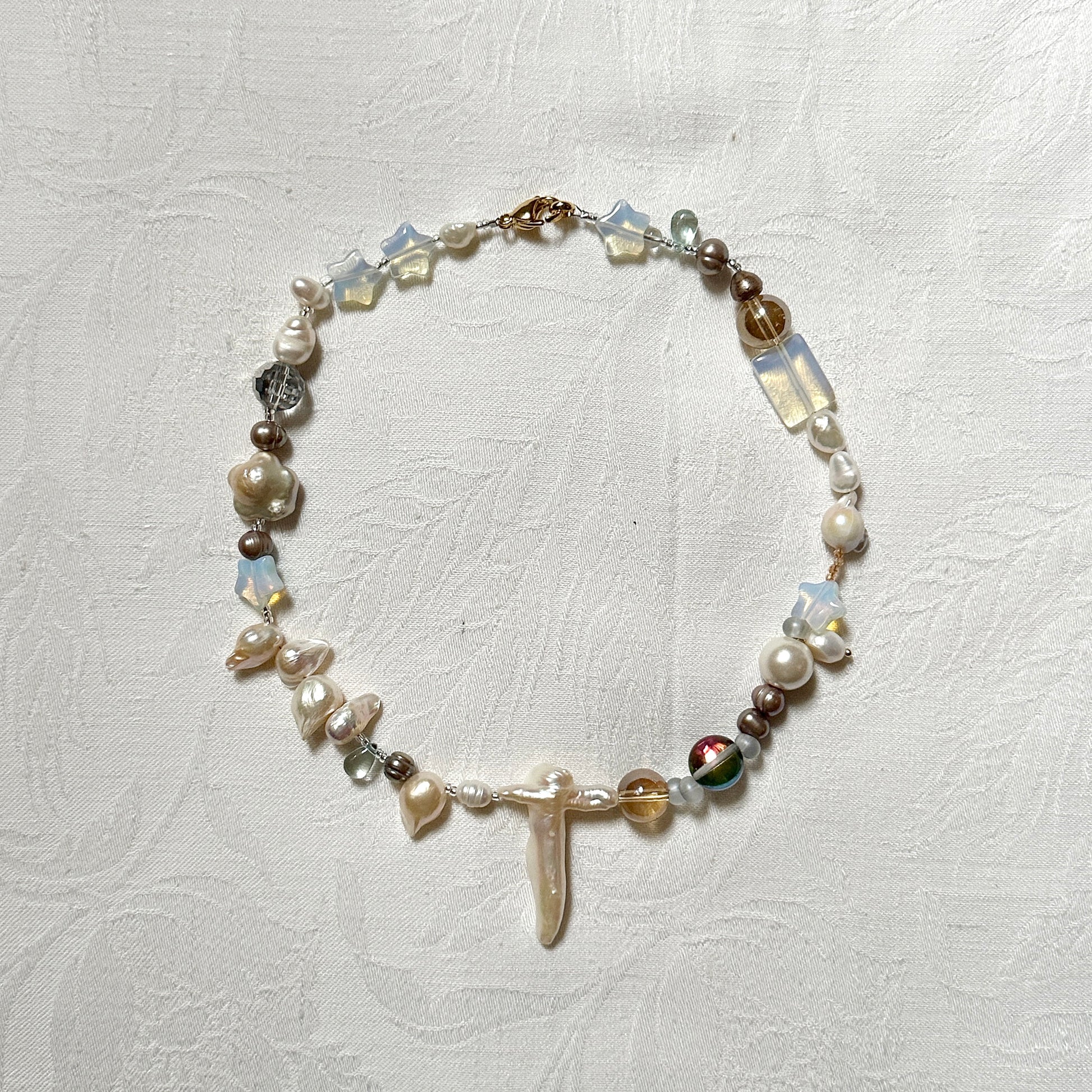 Handmade necklace made out of beads and freshwater pearls, big cross pearl in the middle, stainless steel golden clasp