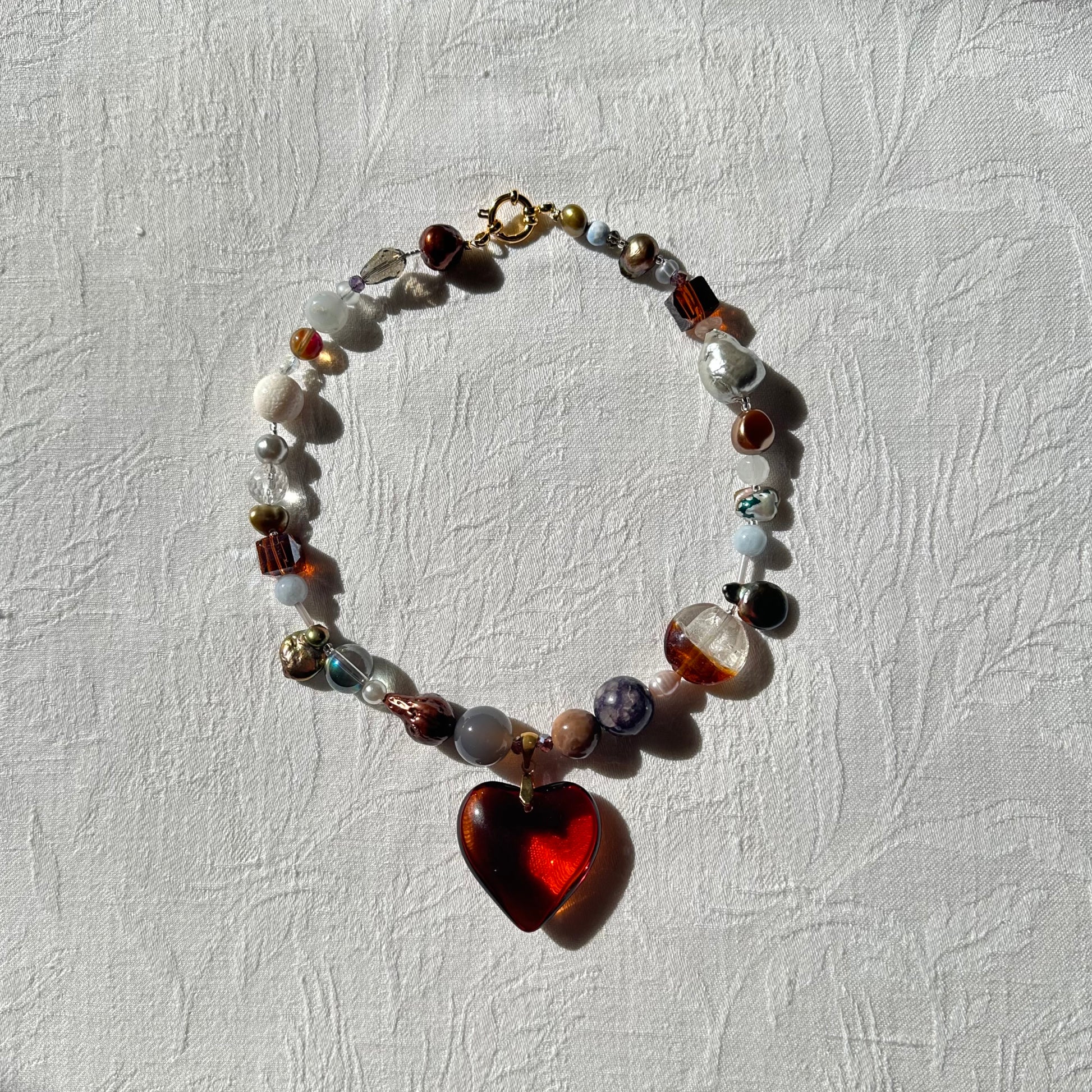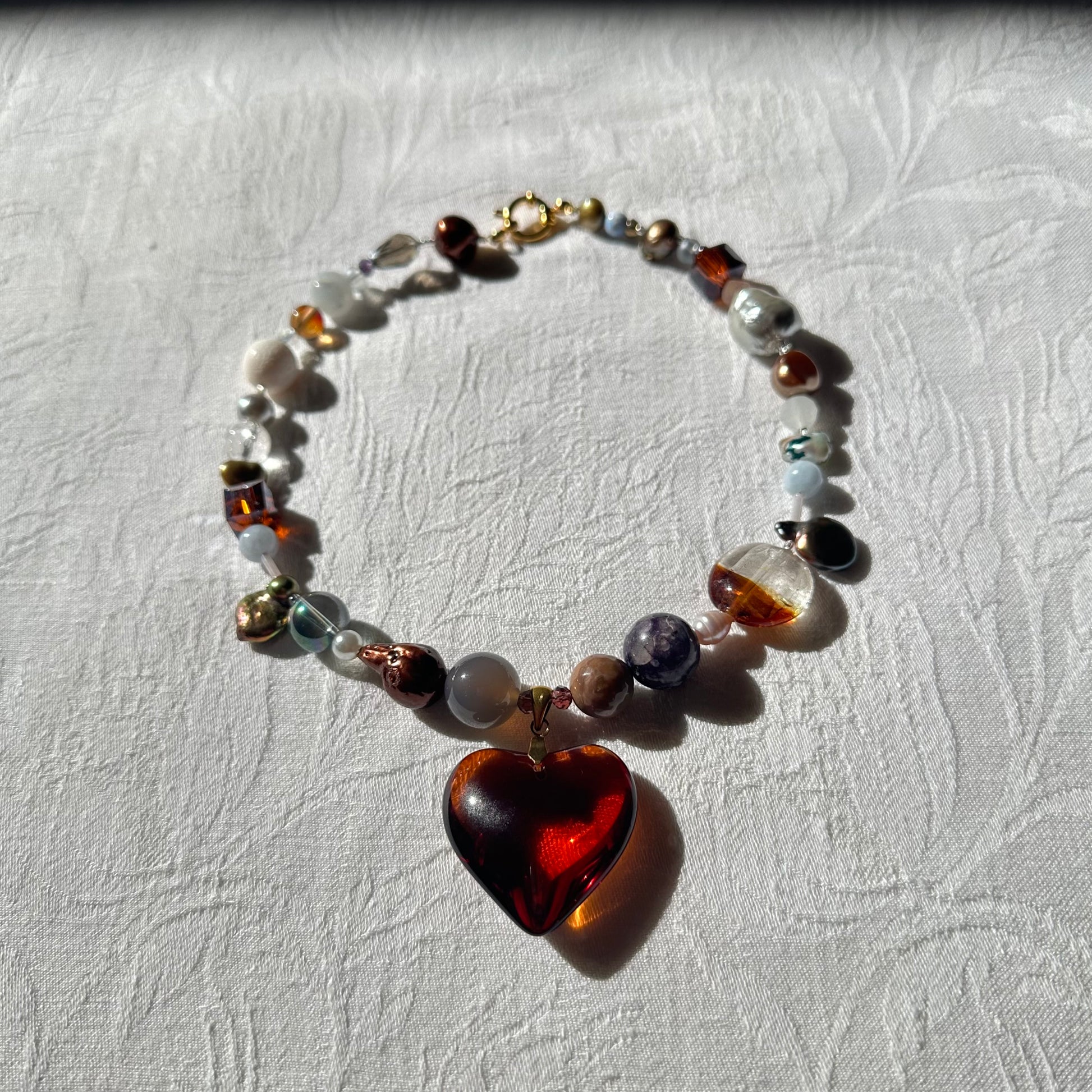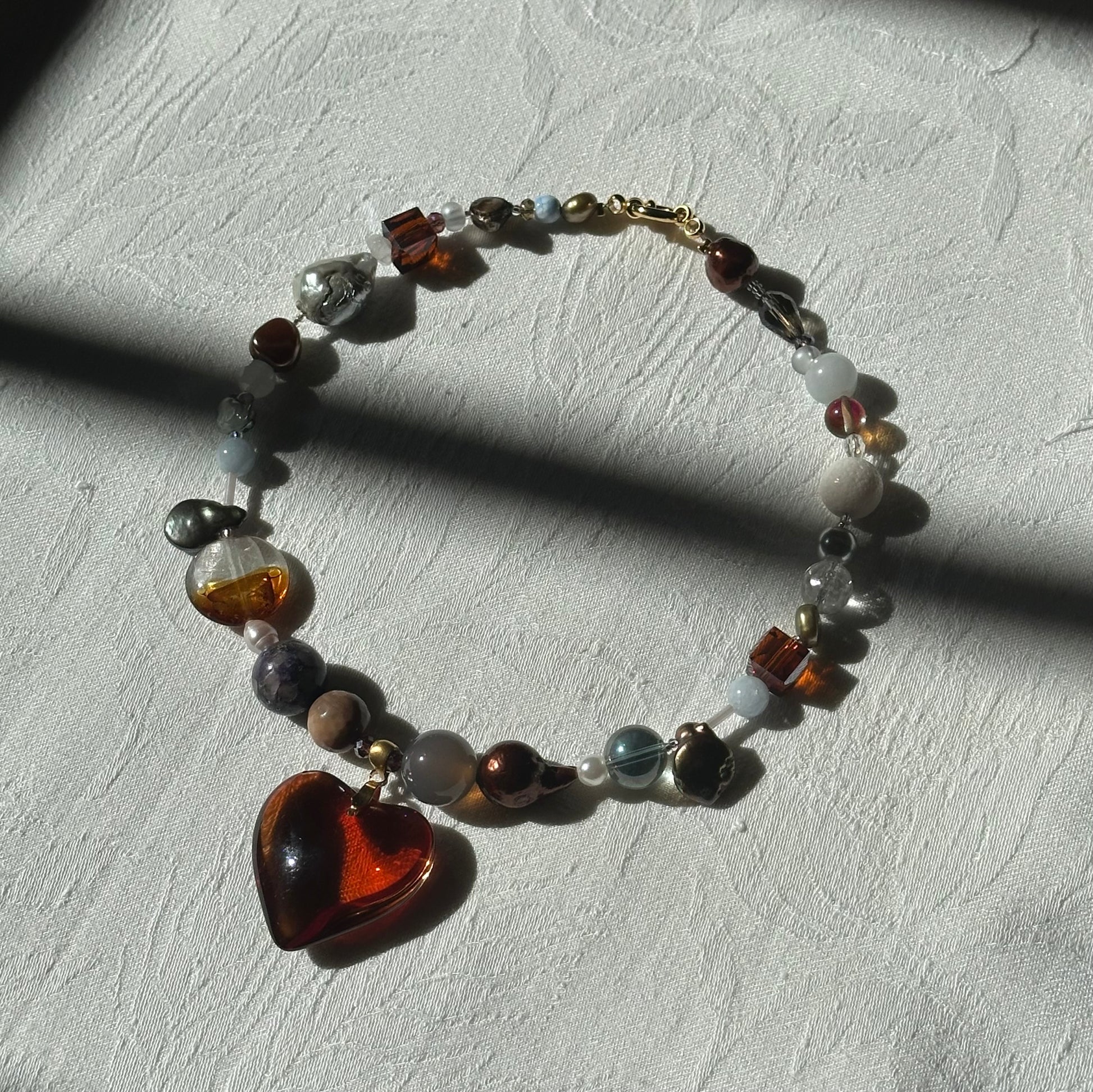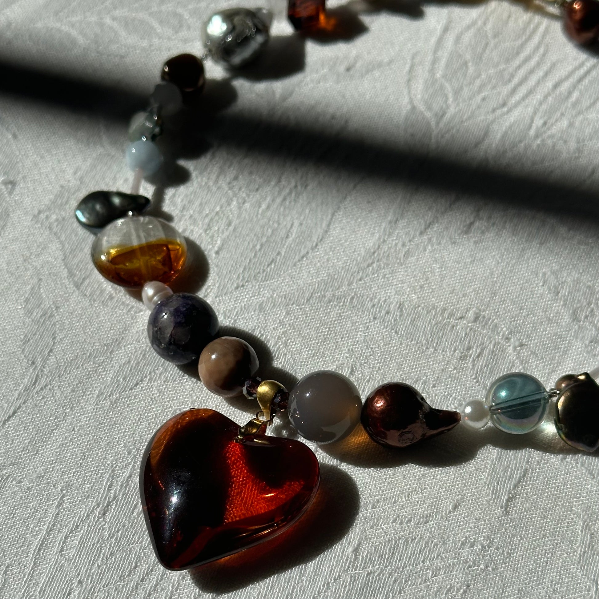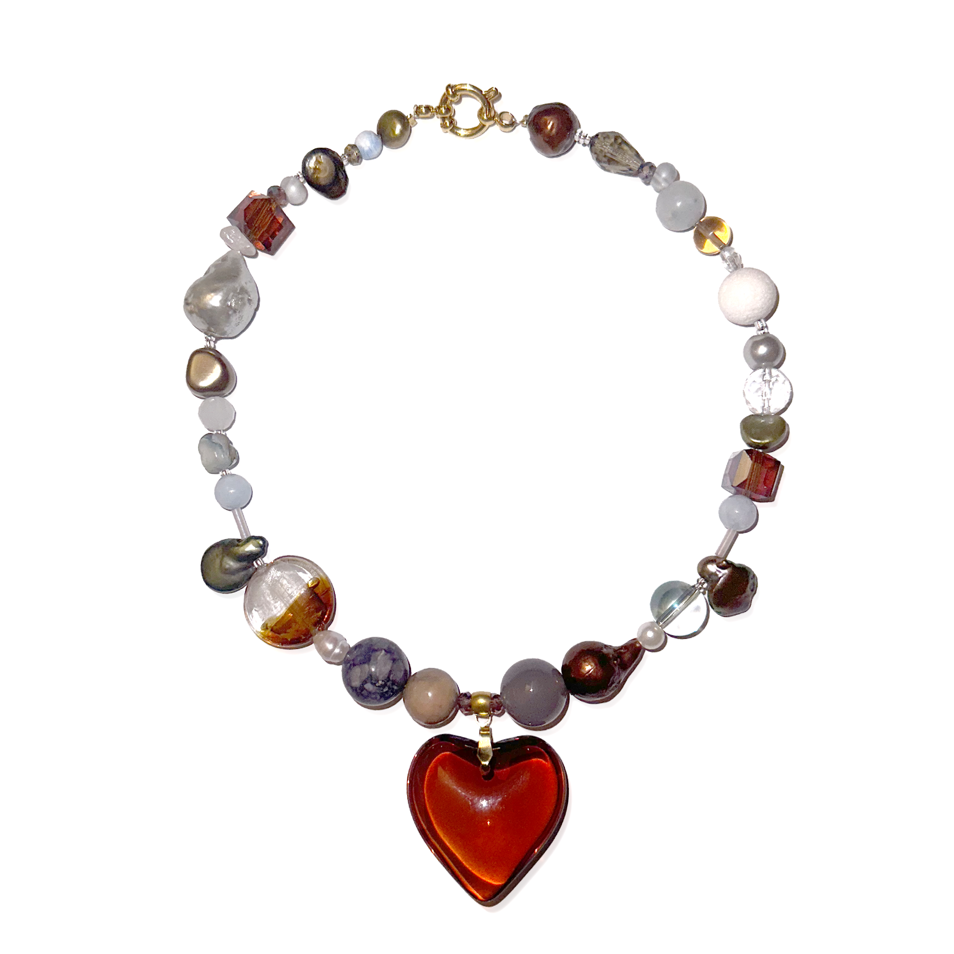Brownish glass heart pendant, real freshwater pearls, ceramic beads, seed beads, crystal beads, regular pearls, stainless steel golden clasp.