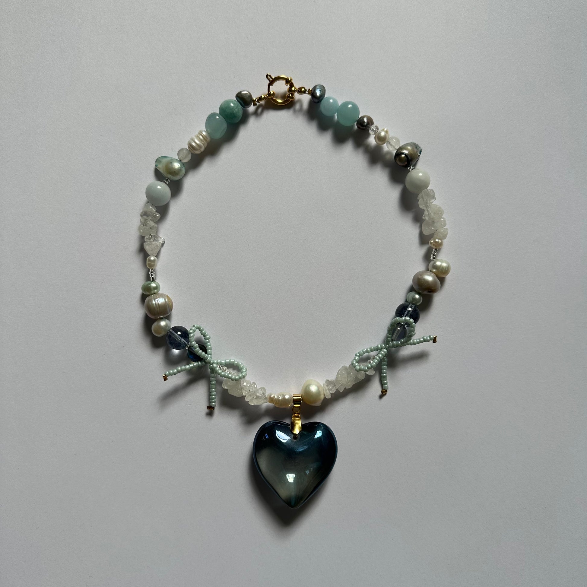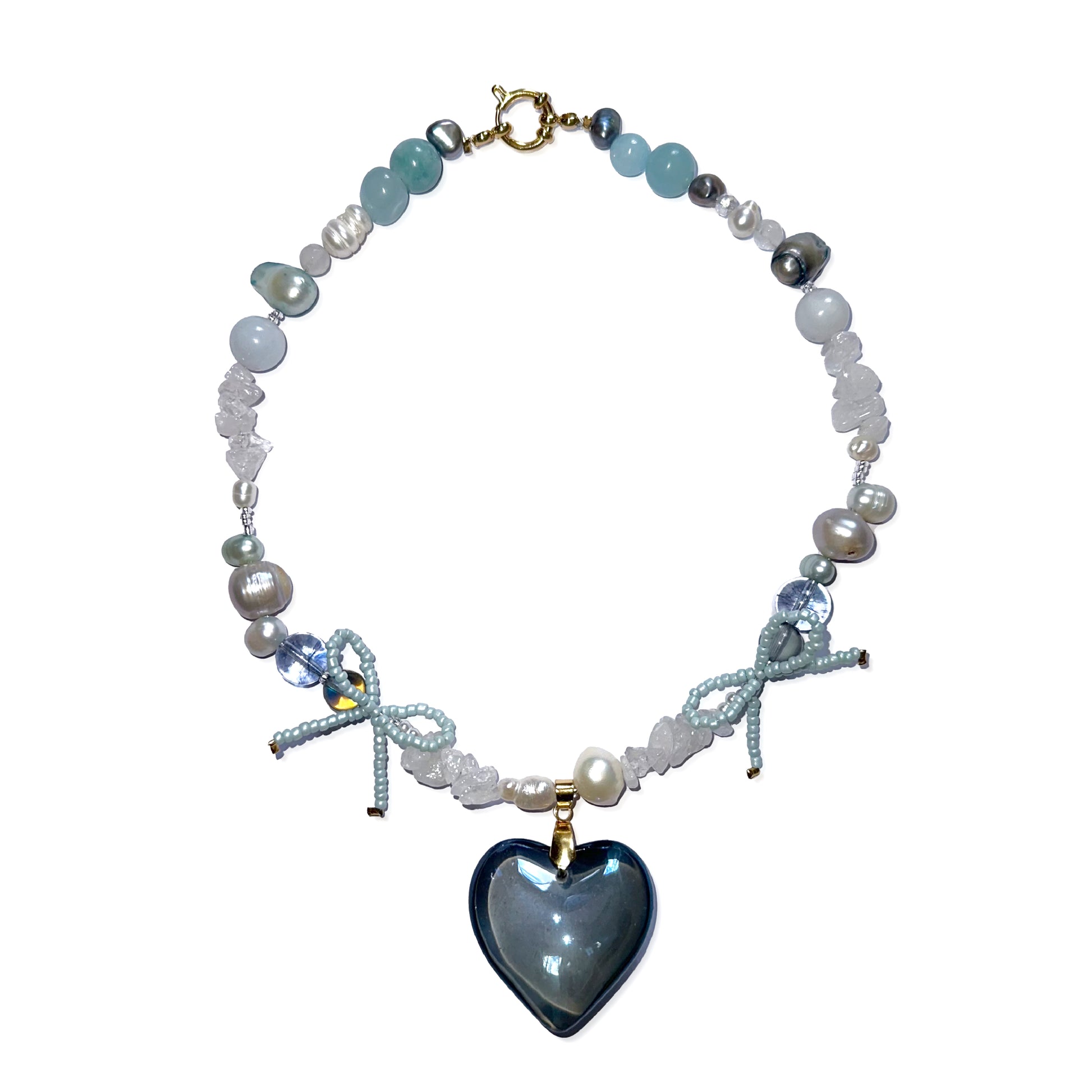 Handmade necklace made with a glass chrome blue heart, handmade little beaded bows, freshwater pearls, and stainless steel golden clasp
