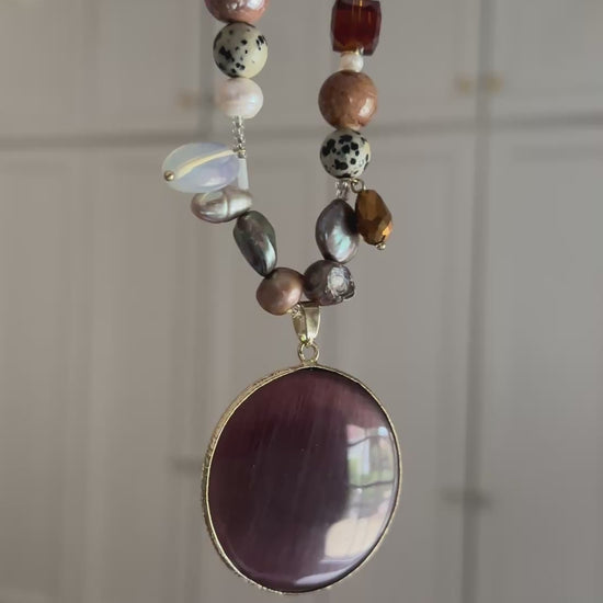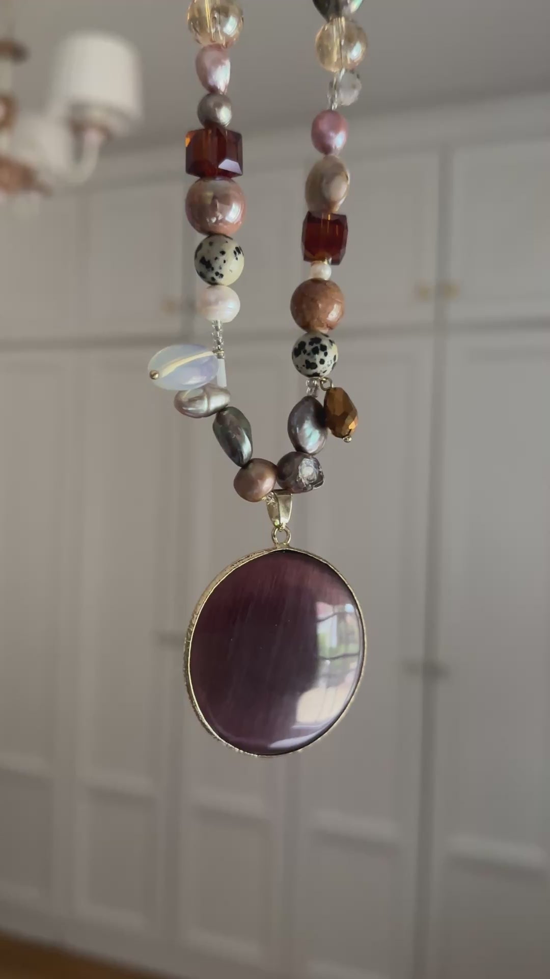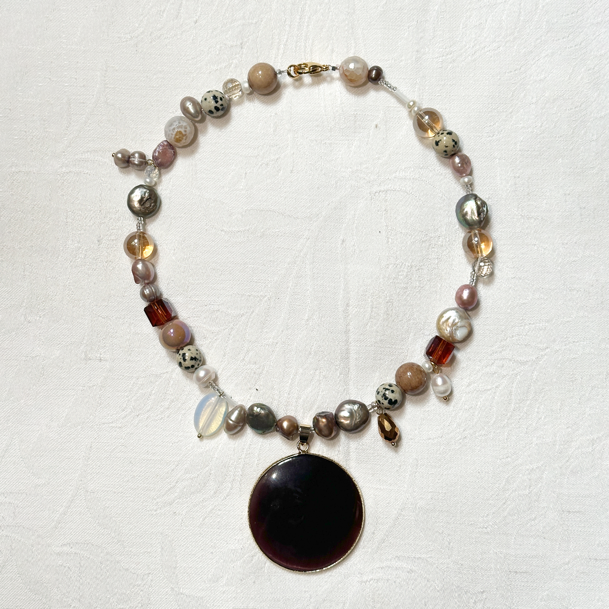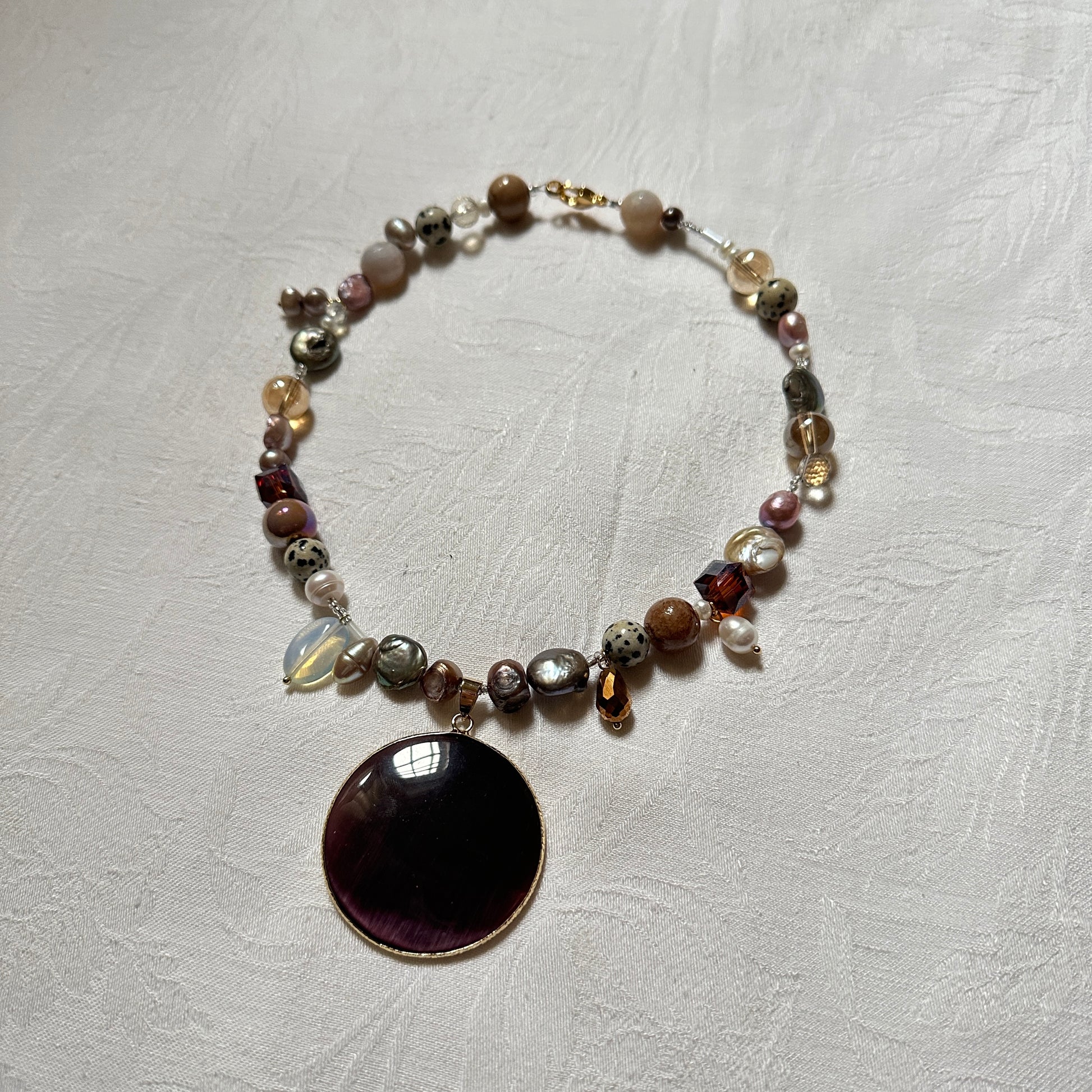 Handmade necklace made with hanging beads, crystal beads, freshwater pearls, and stainless steel golden clasp