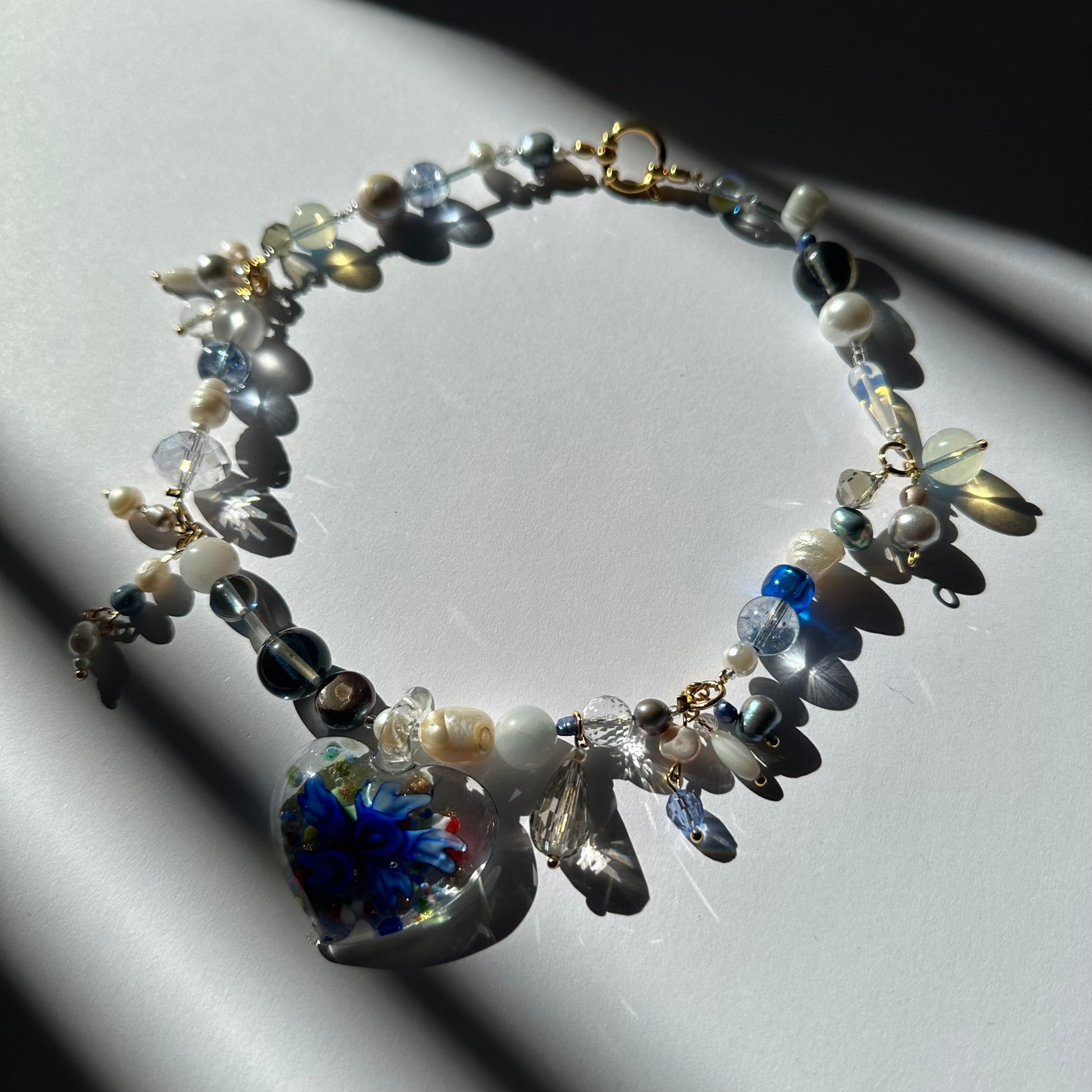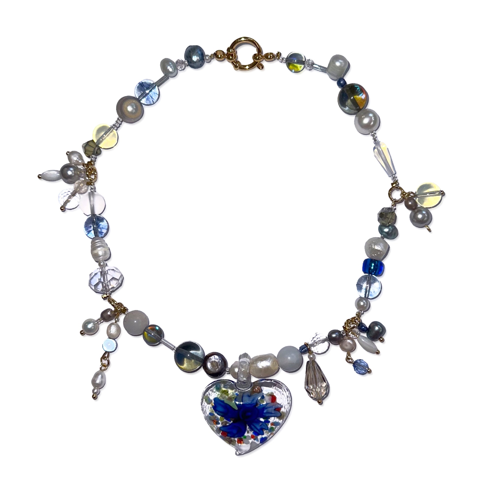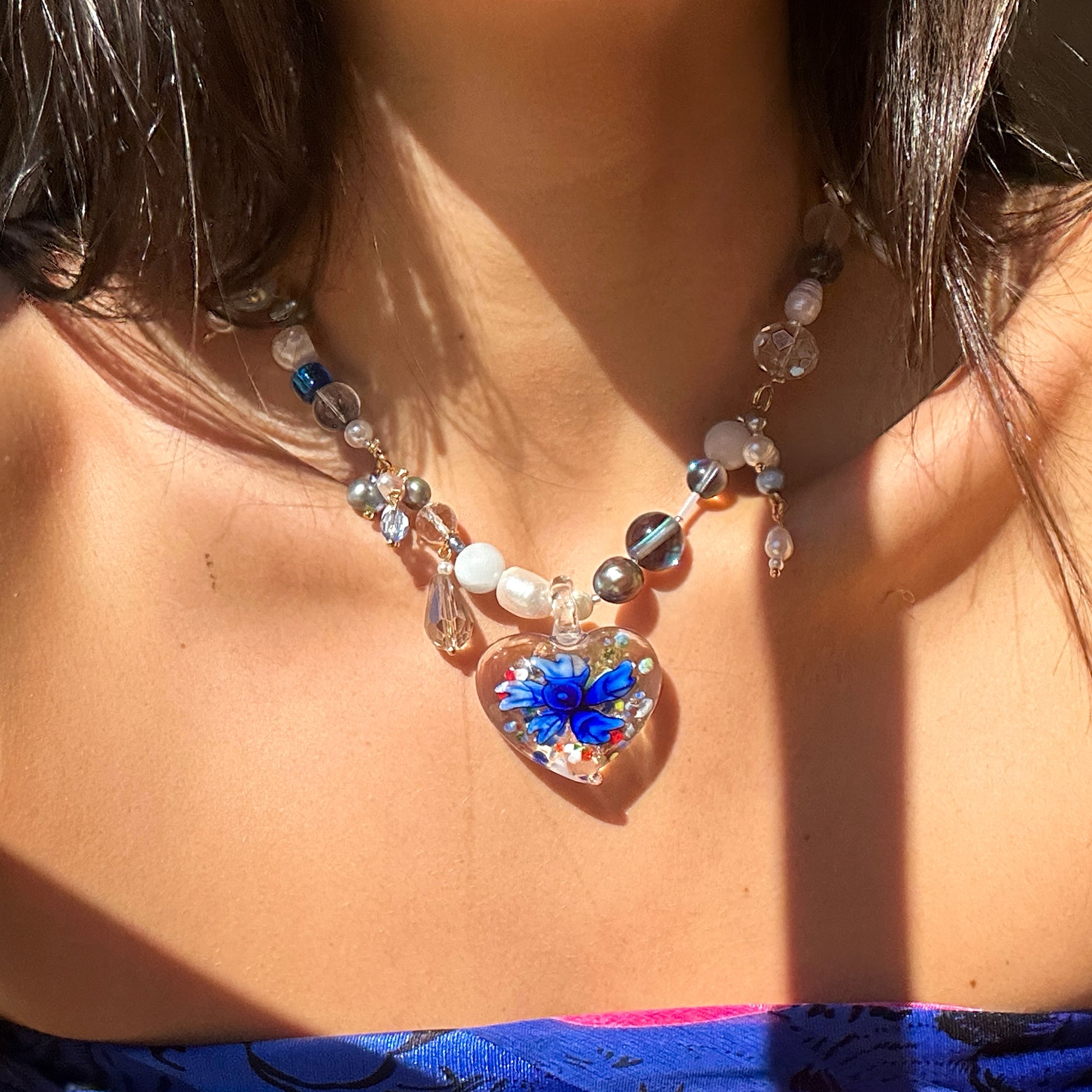 New design & type of heart glass pendant, with a flower inside, seed beads, real freshwater pearls, crystal beads, little cute hanging beads that add dimension and volume, stainless steel golden clasp.