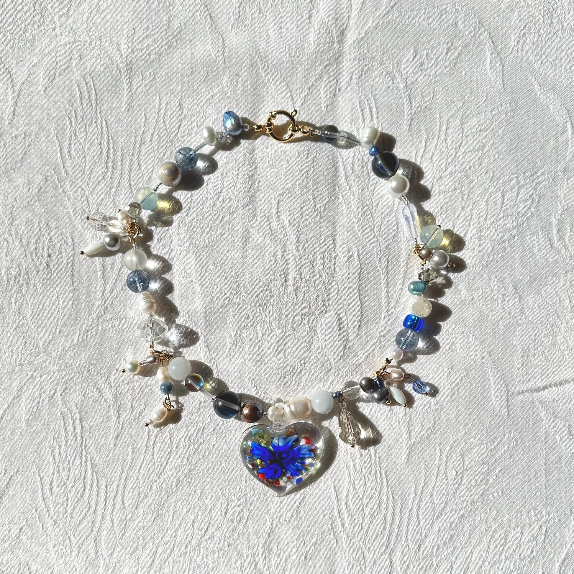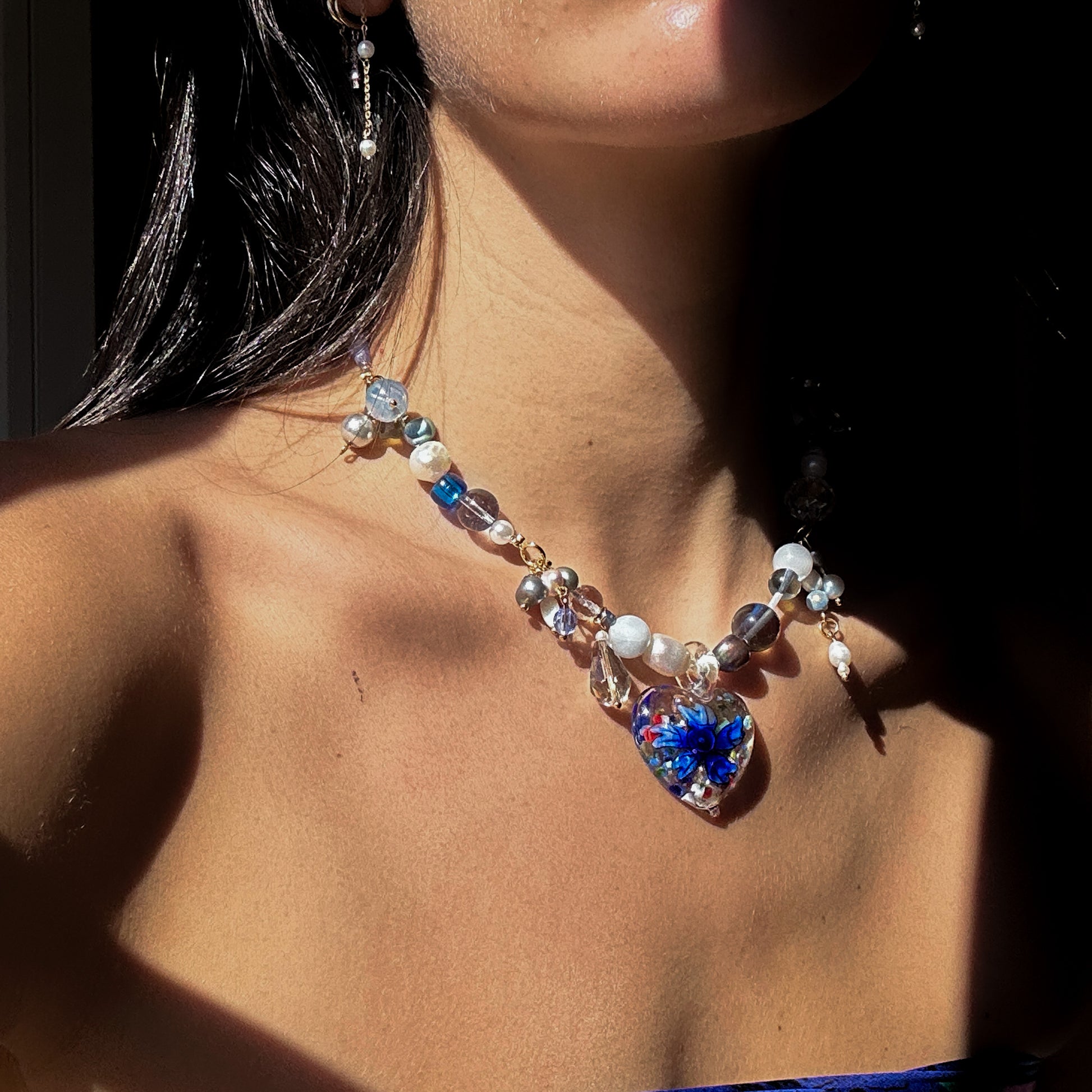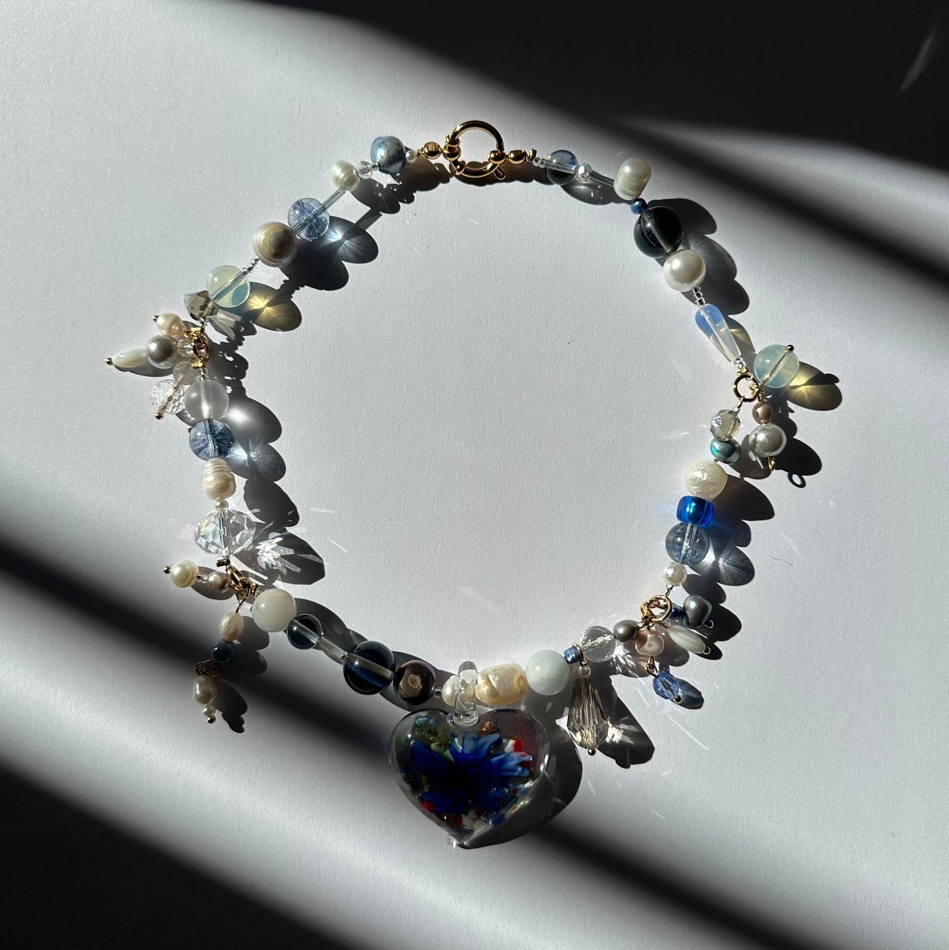New design & type of heart glass pendant, with a flower inside, seed beads, real freshwater pearls, crystal beads, little cute hanging beads that add dimension and volume, stainless steel golden clasp.