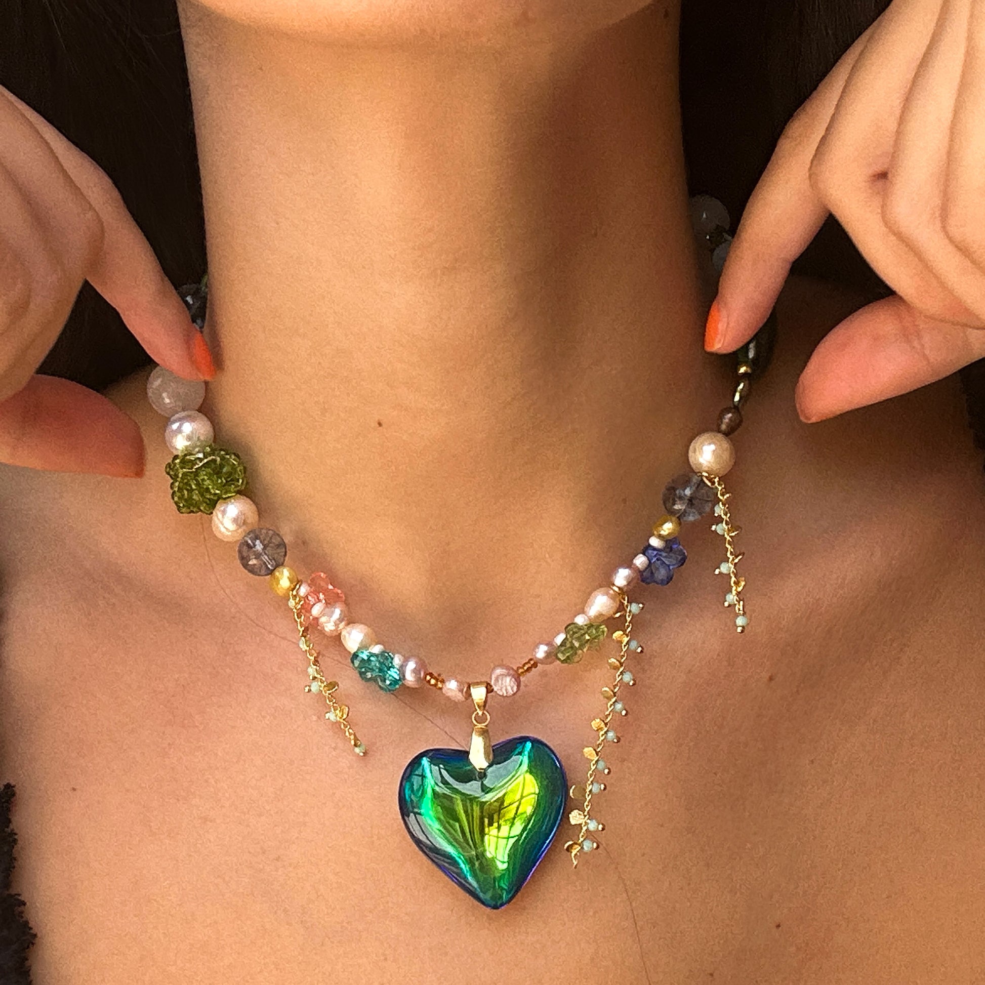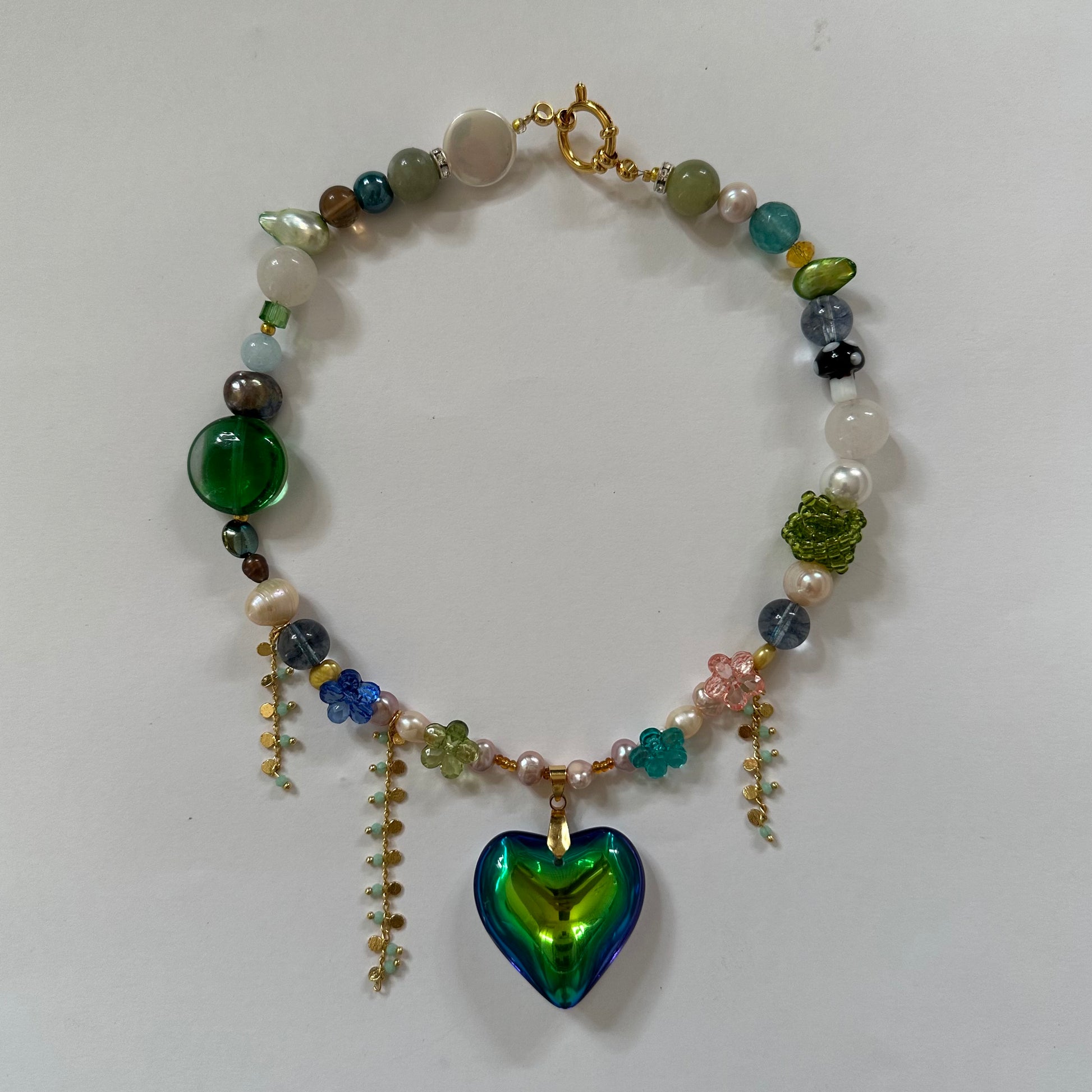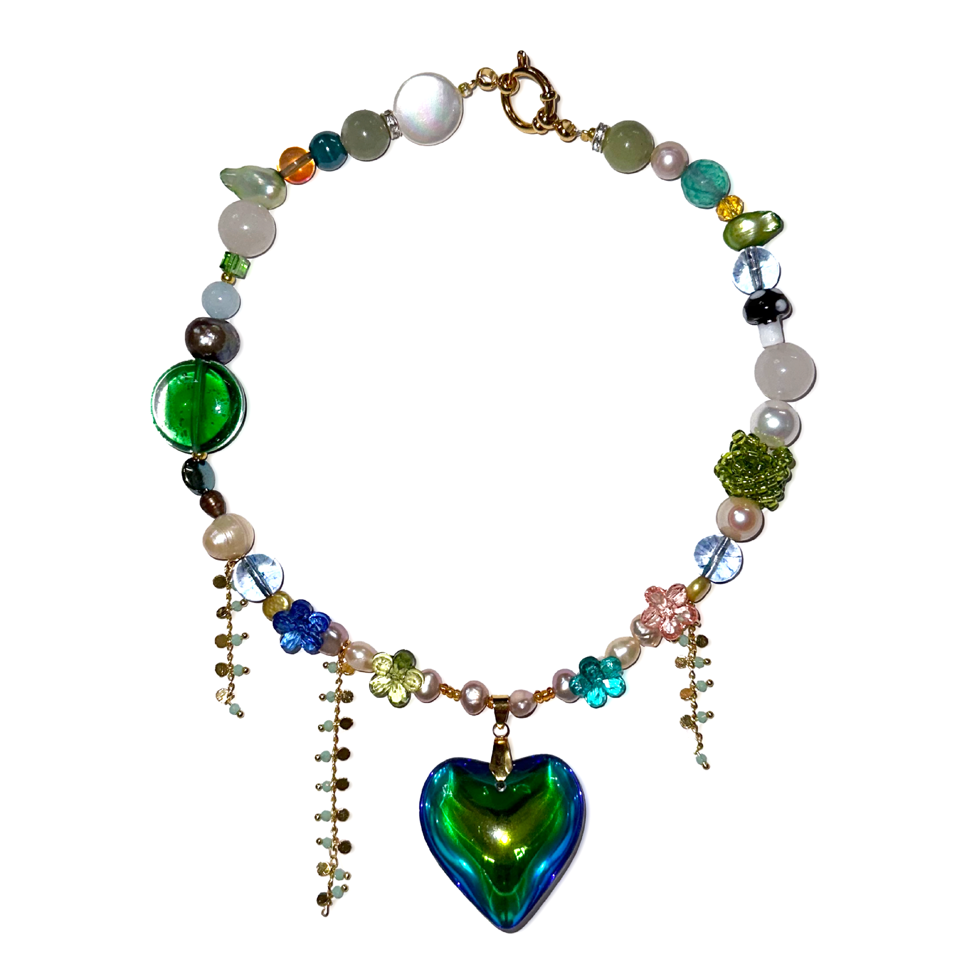 glass chrome heart, hanging chains, plastic flowers, seed pink pearls, freshwater pearls, colored pearls, coin beads, handmade bead, litttle black mushroom, crystal beads, and a stainless steel golden clasp.