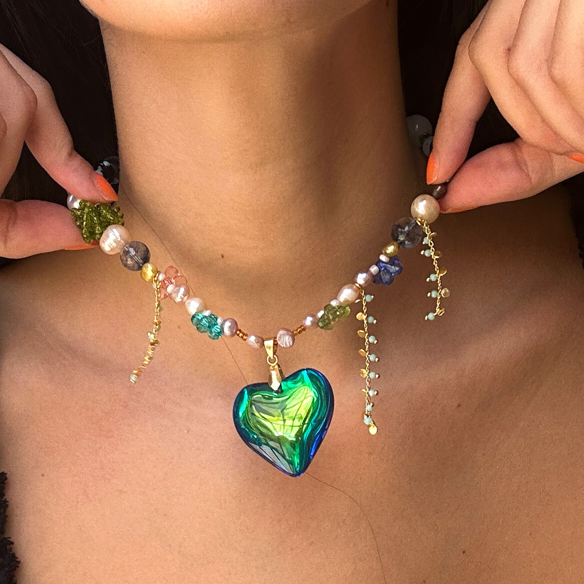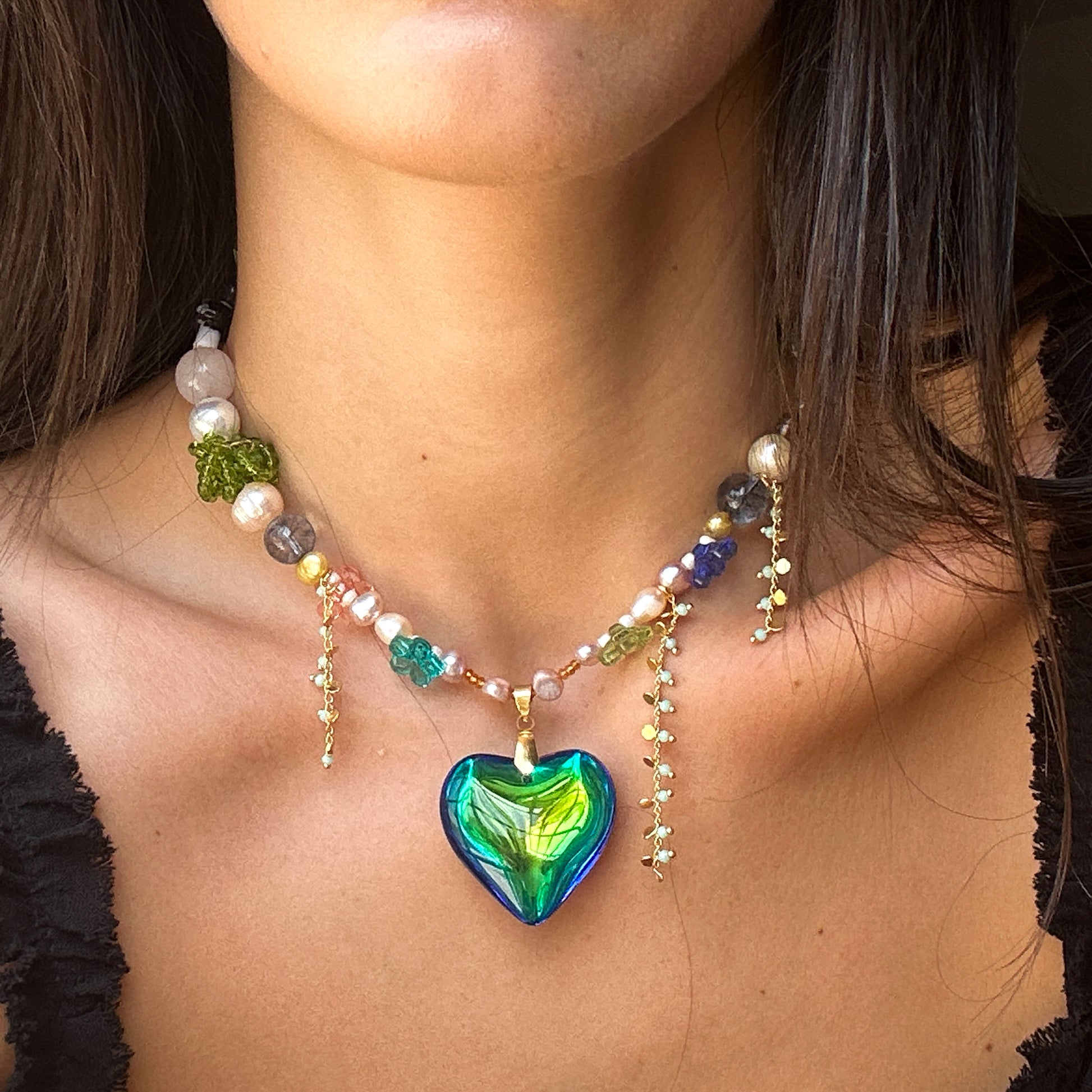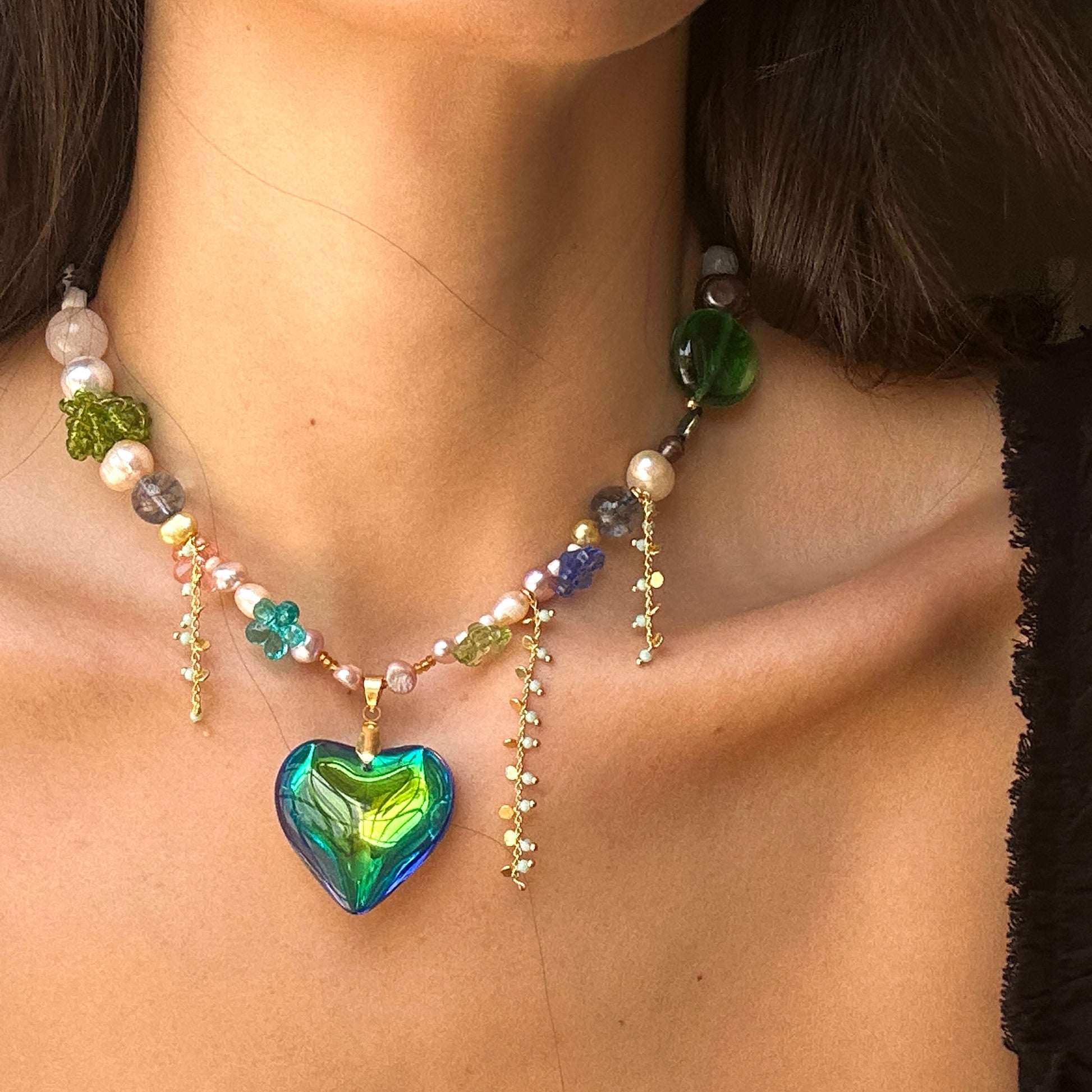 glass chrome heart, hanging chains, plastic flowers, seed pink pearls, freshwater pearls, colored pearls, coin beads, handmade bead, litttle black mushroom, crystal beads, and a stainless steel golden clasp.