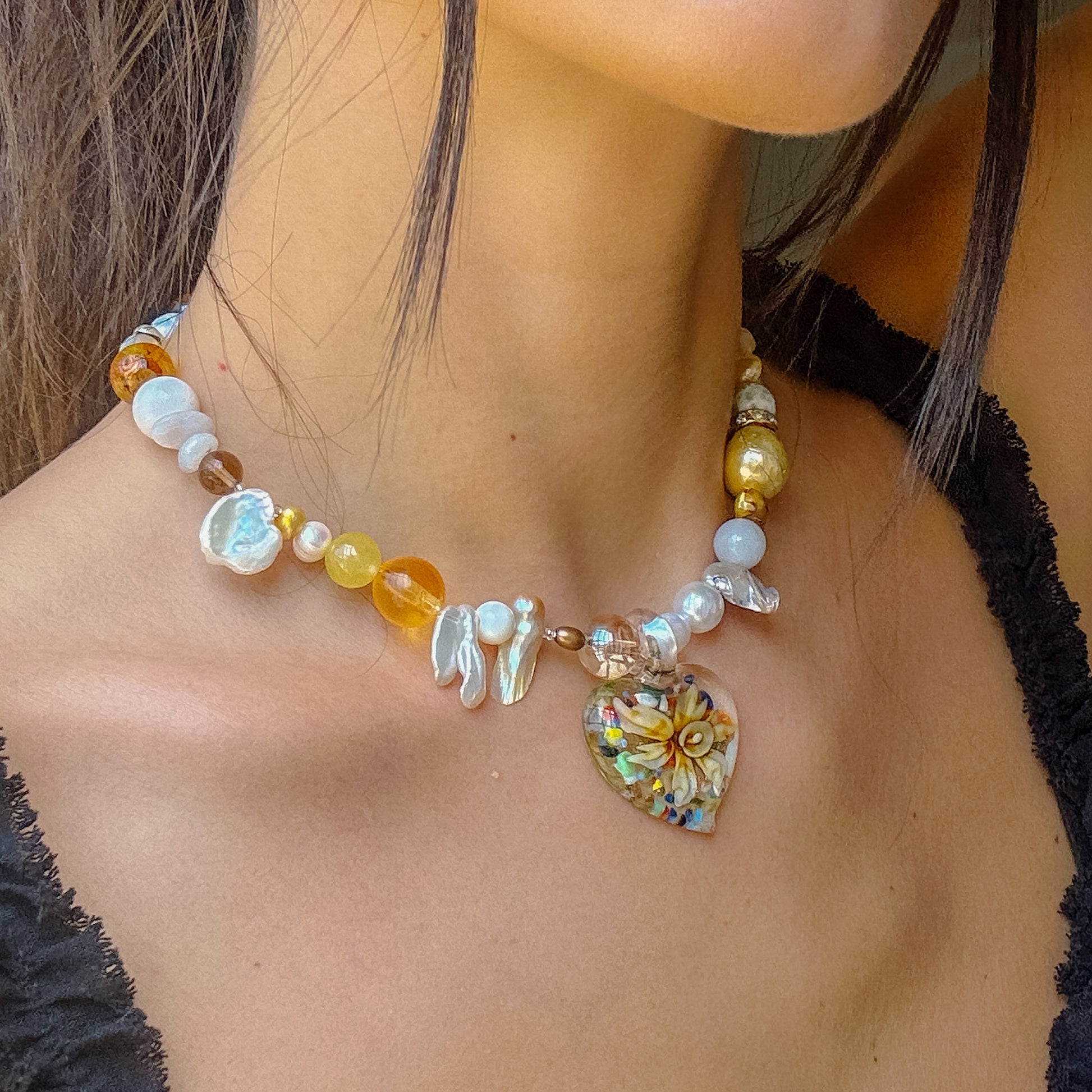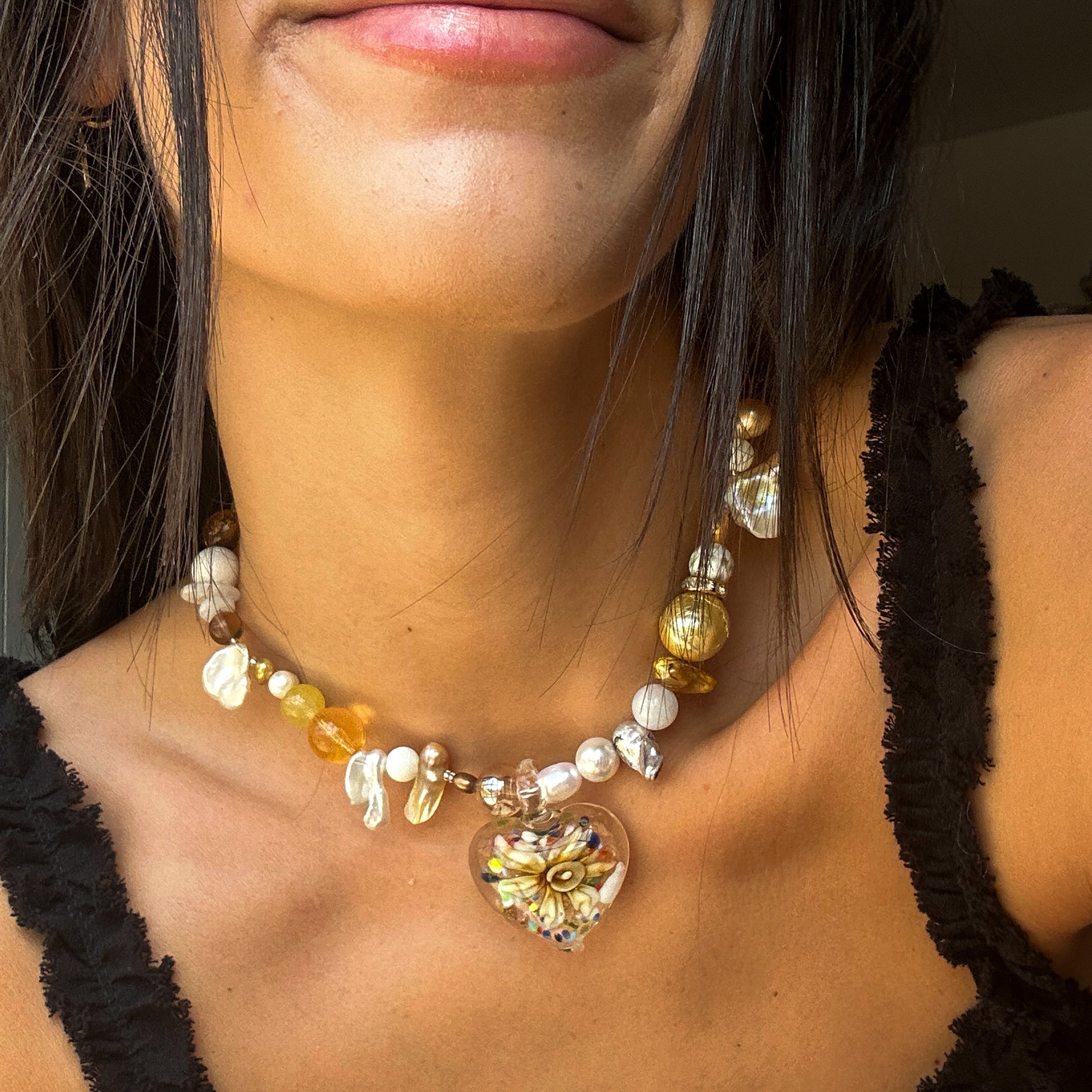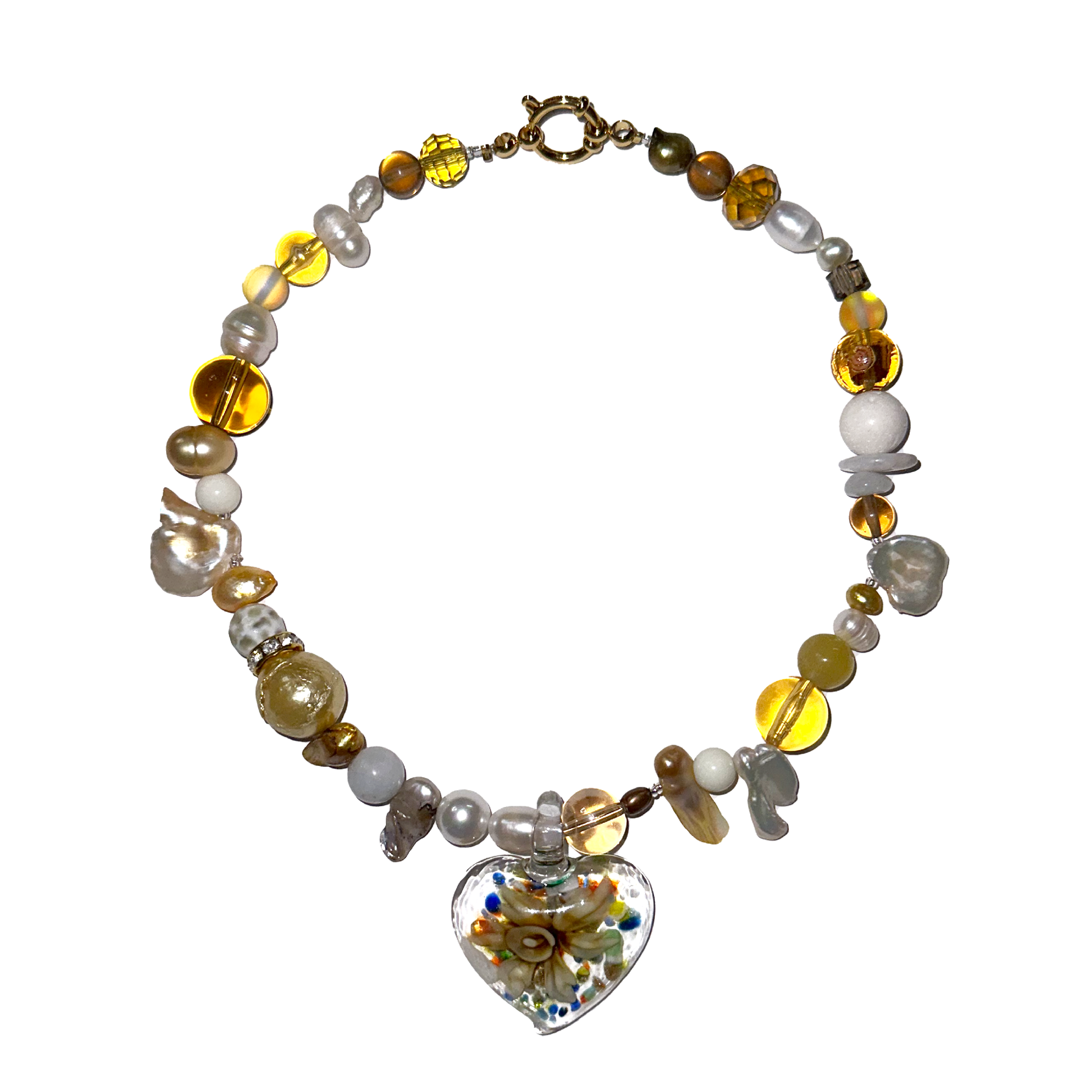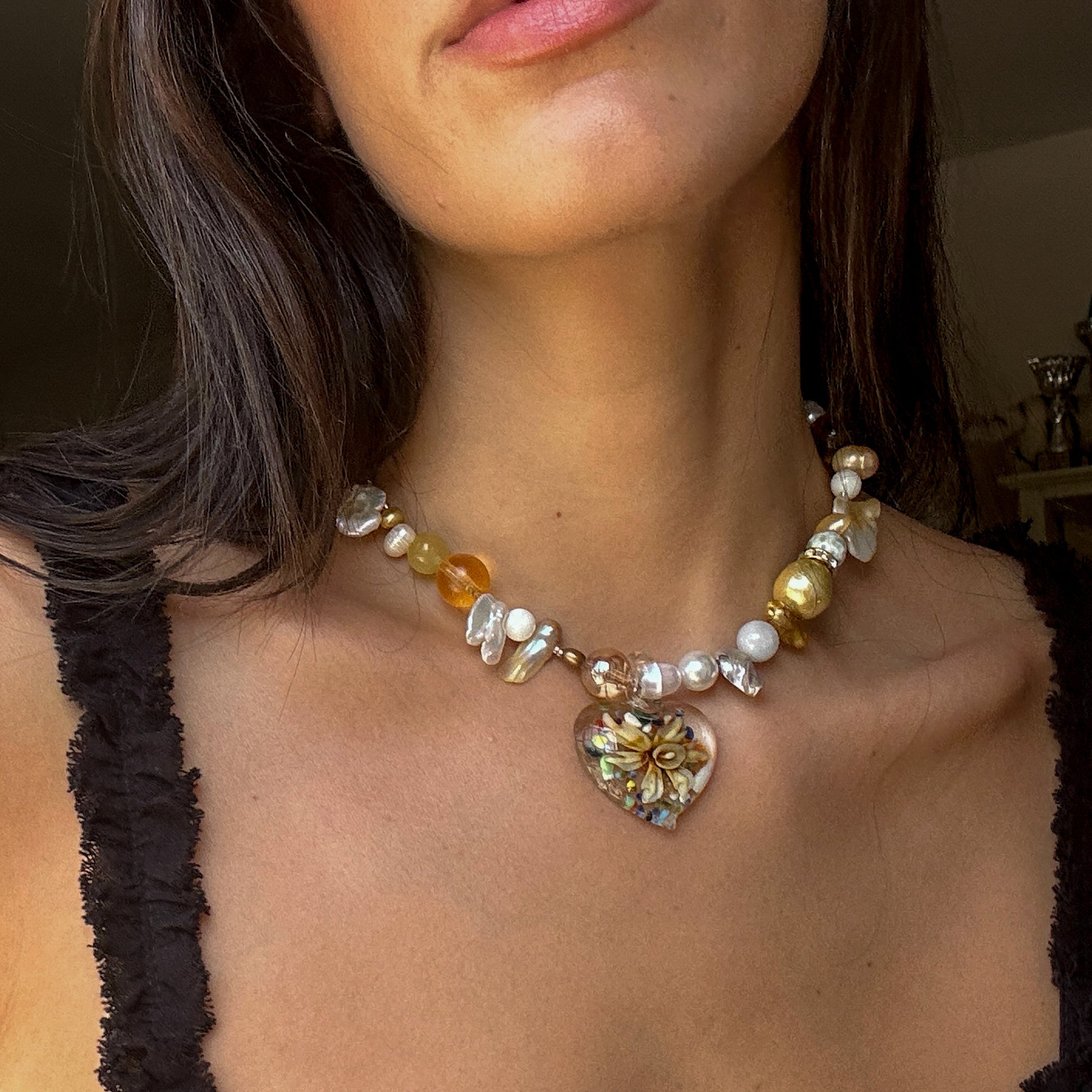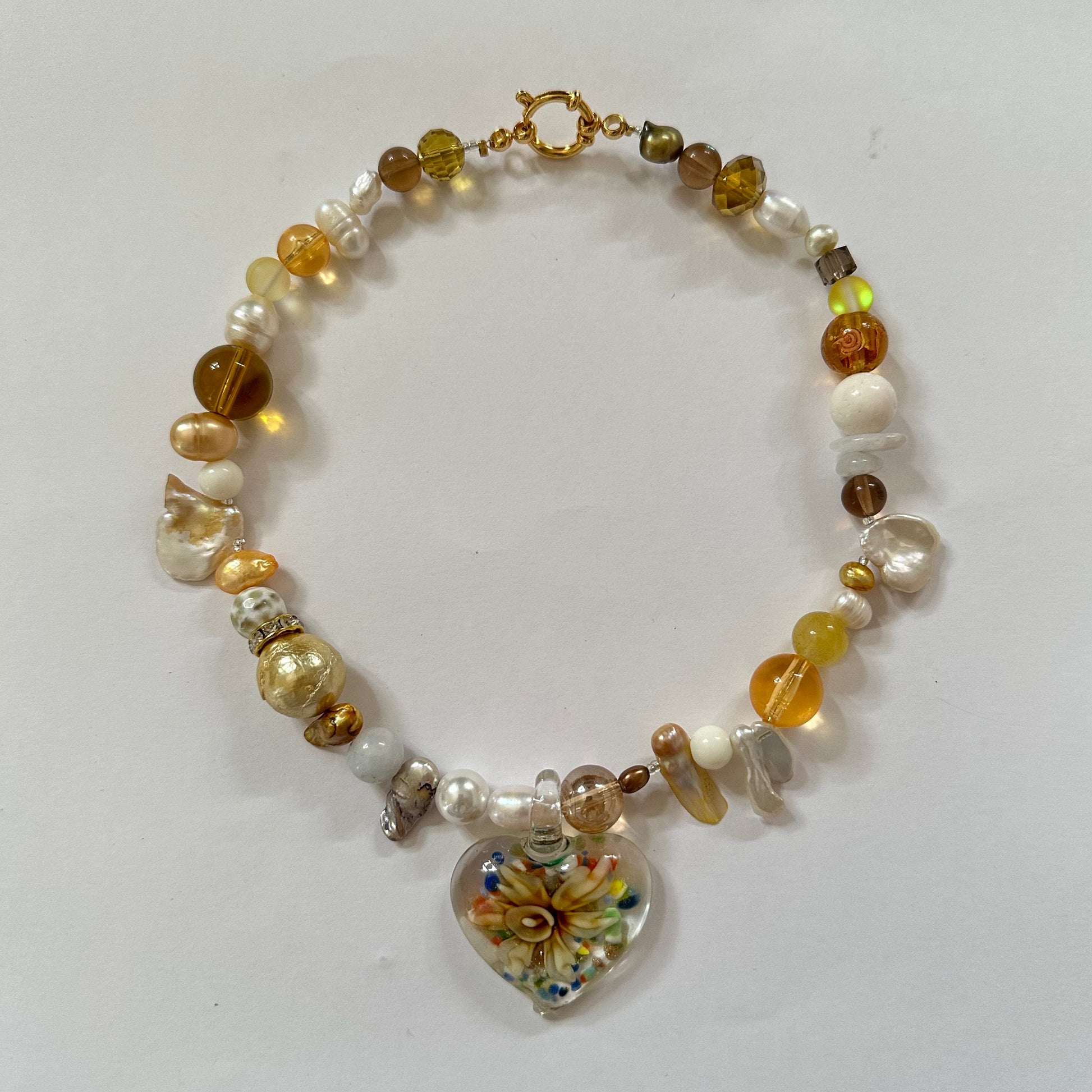 new type of heart glass pendant with a flower inside, seed beads, real freshwater pearls, baroque pearl, crystal beads, stainless steel golden clasp.