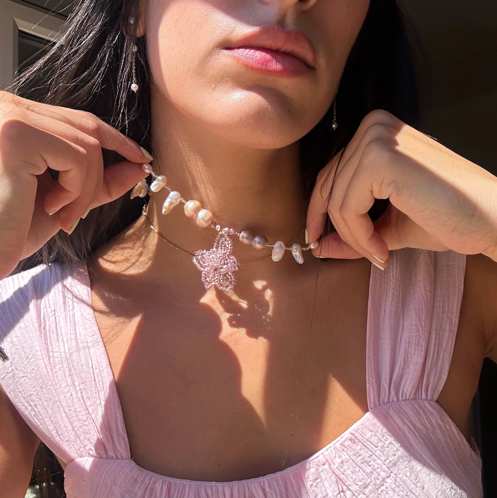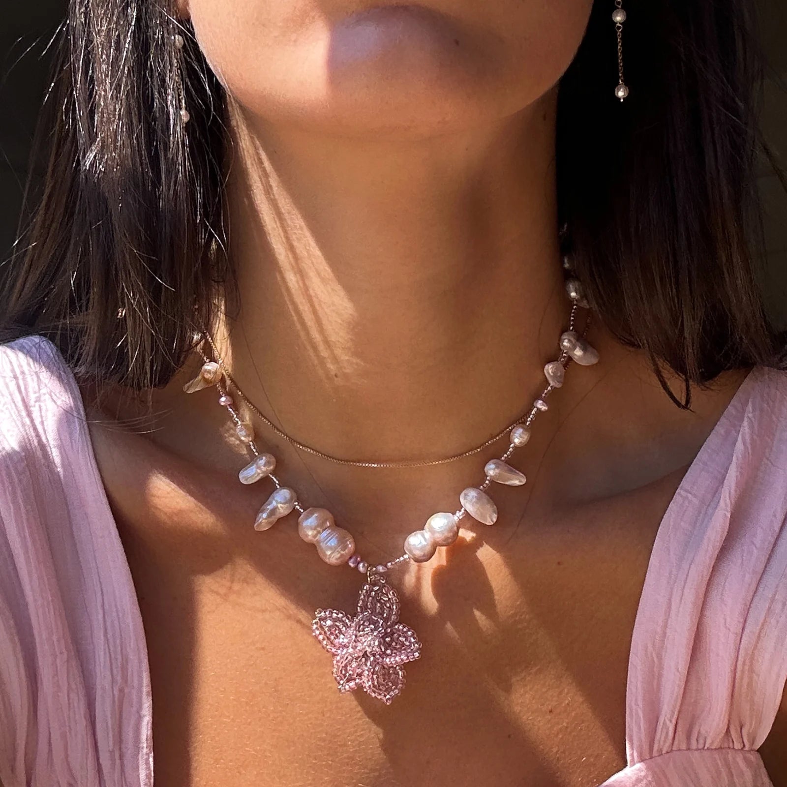 handmade beaded flower, real pink freshwater pearls, little seed pink beads, stainless steel gold clasp