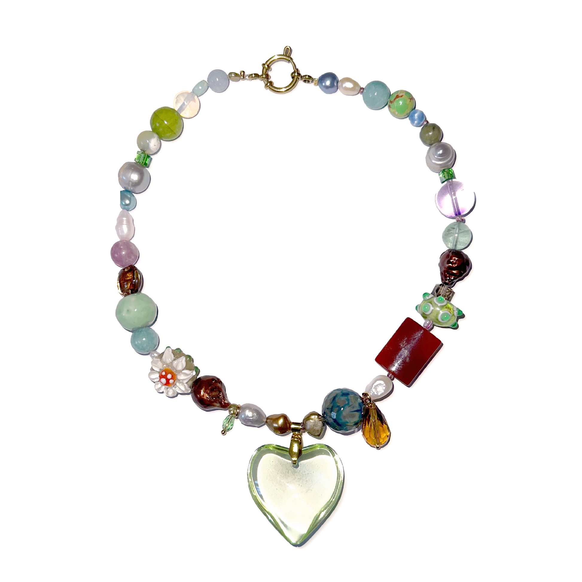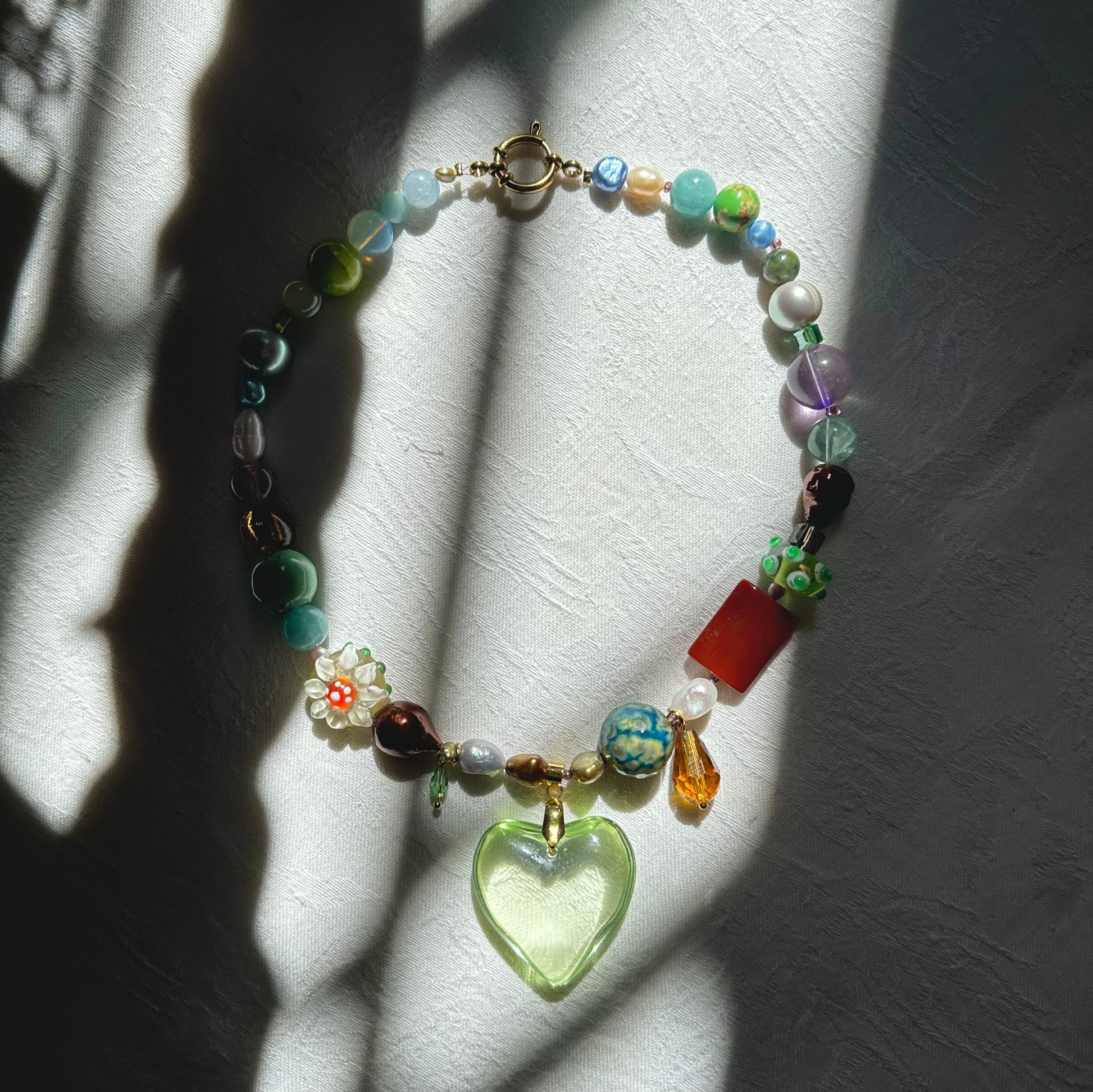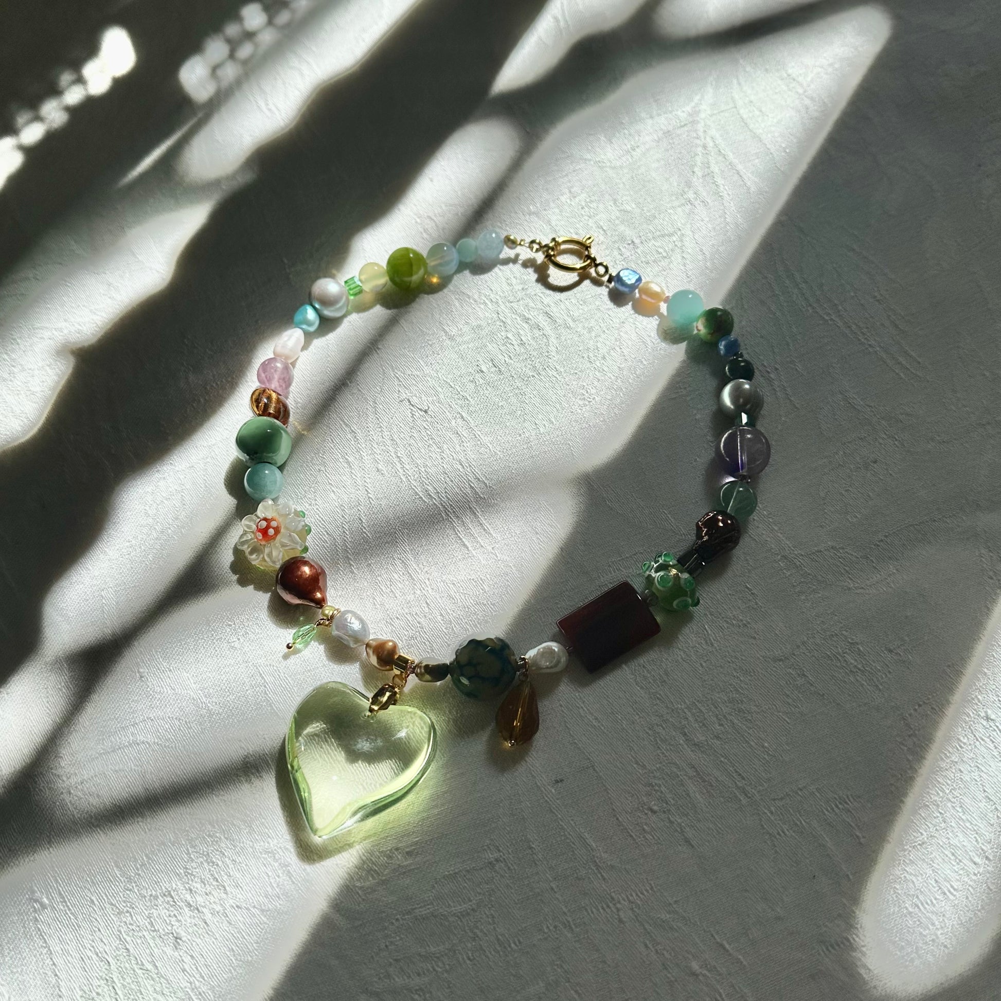 Glass lime heart pendant, hanging little crystals, big round beads, stainless steel golden clasp