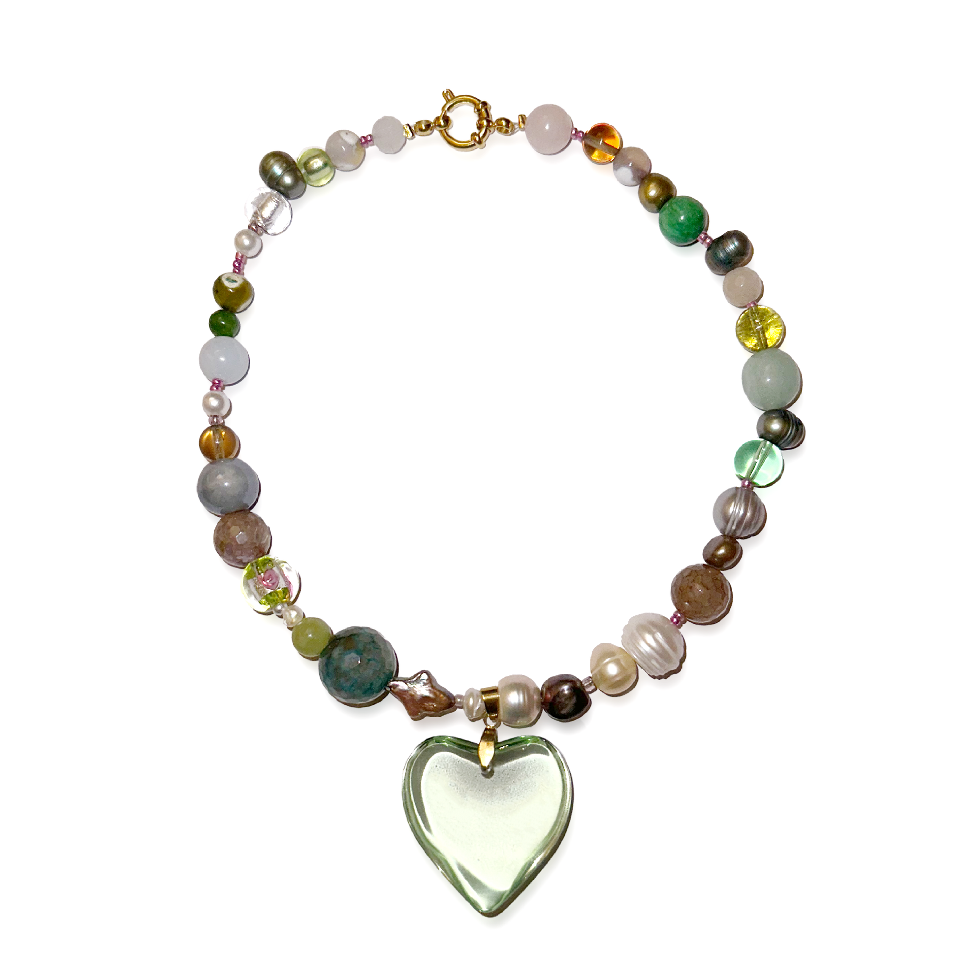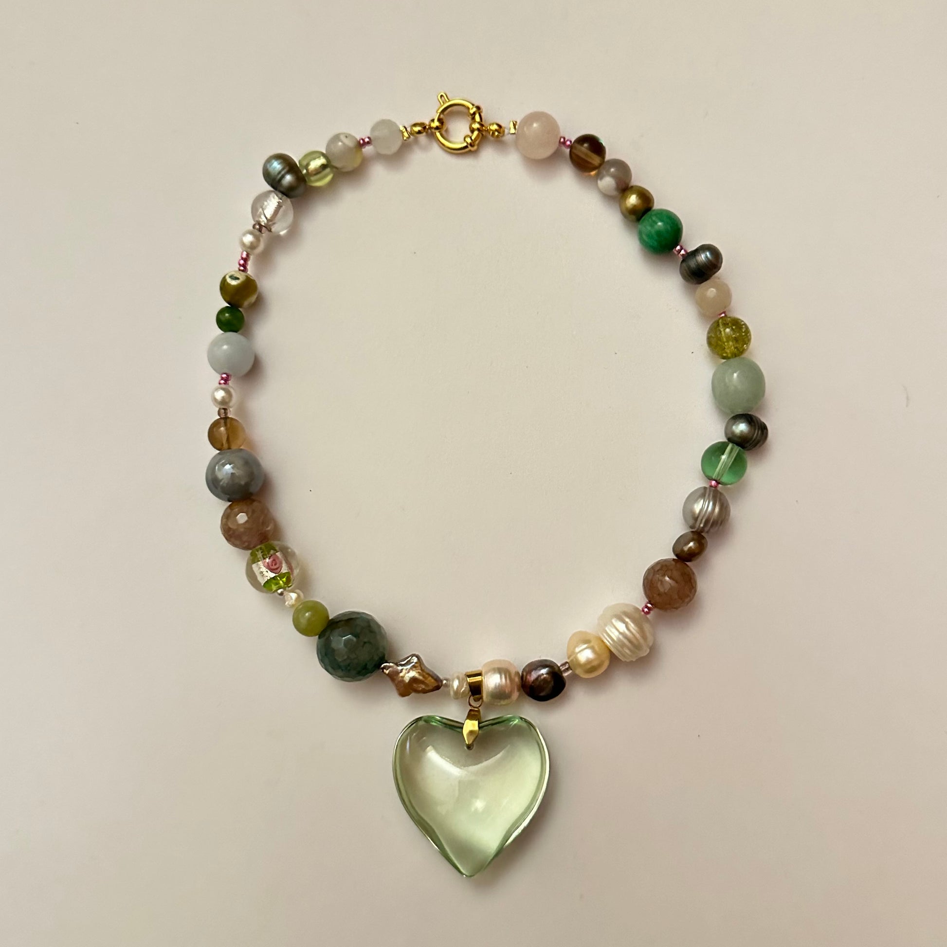 Month glass heart pendant, freshwater pearls, glass beads, crystal bead, seed beads and a golden stainless steel clasp