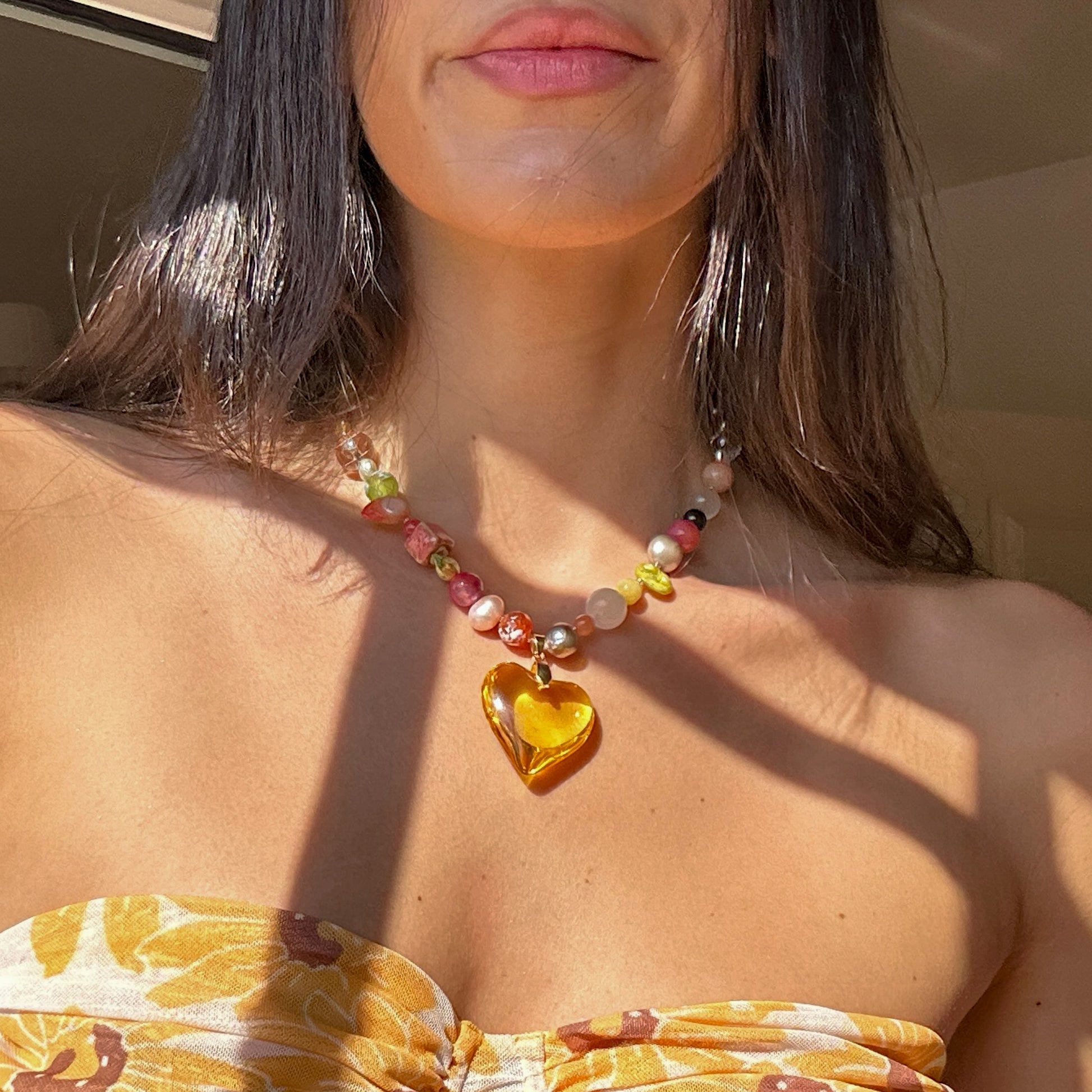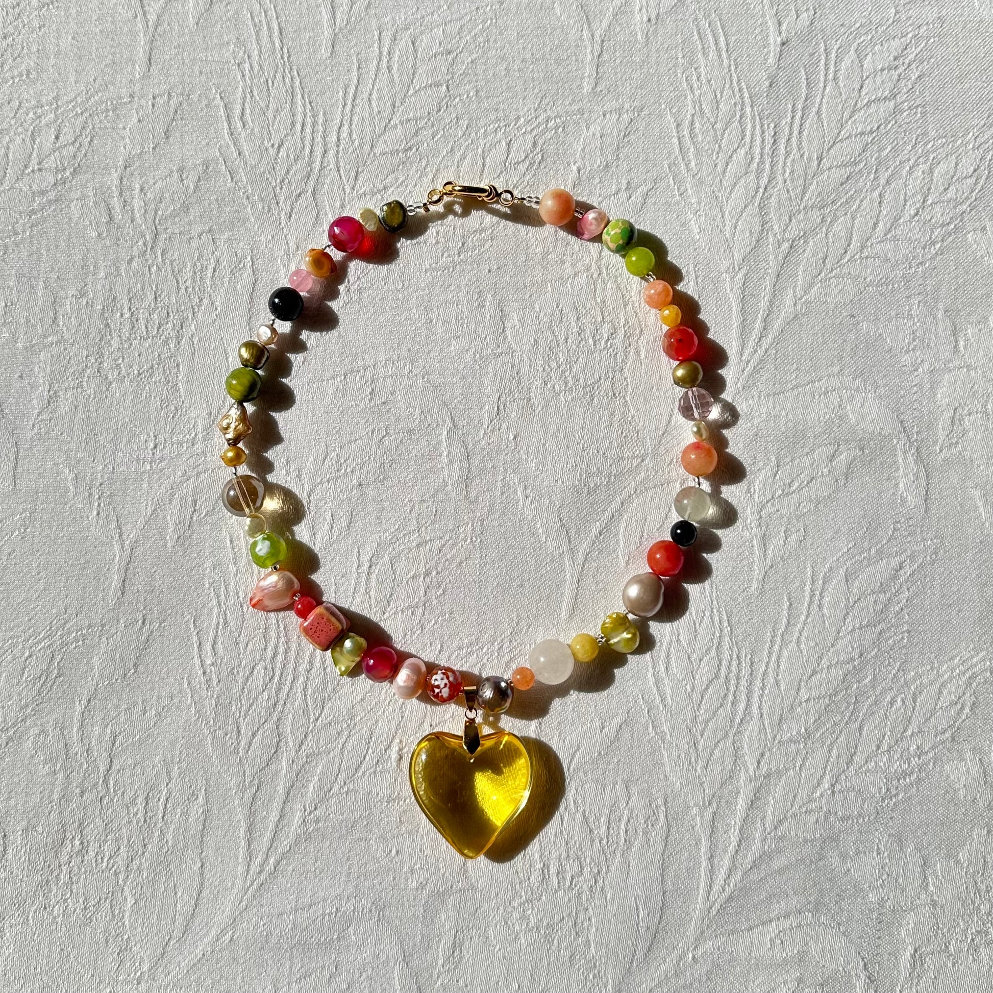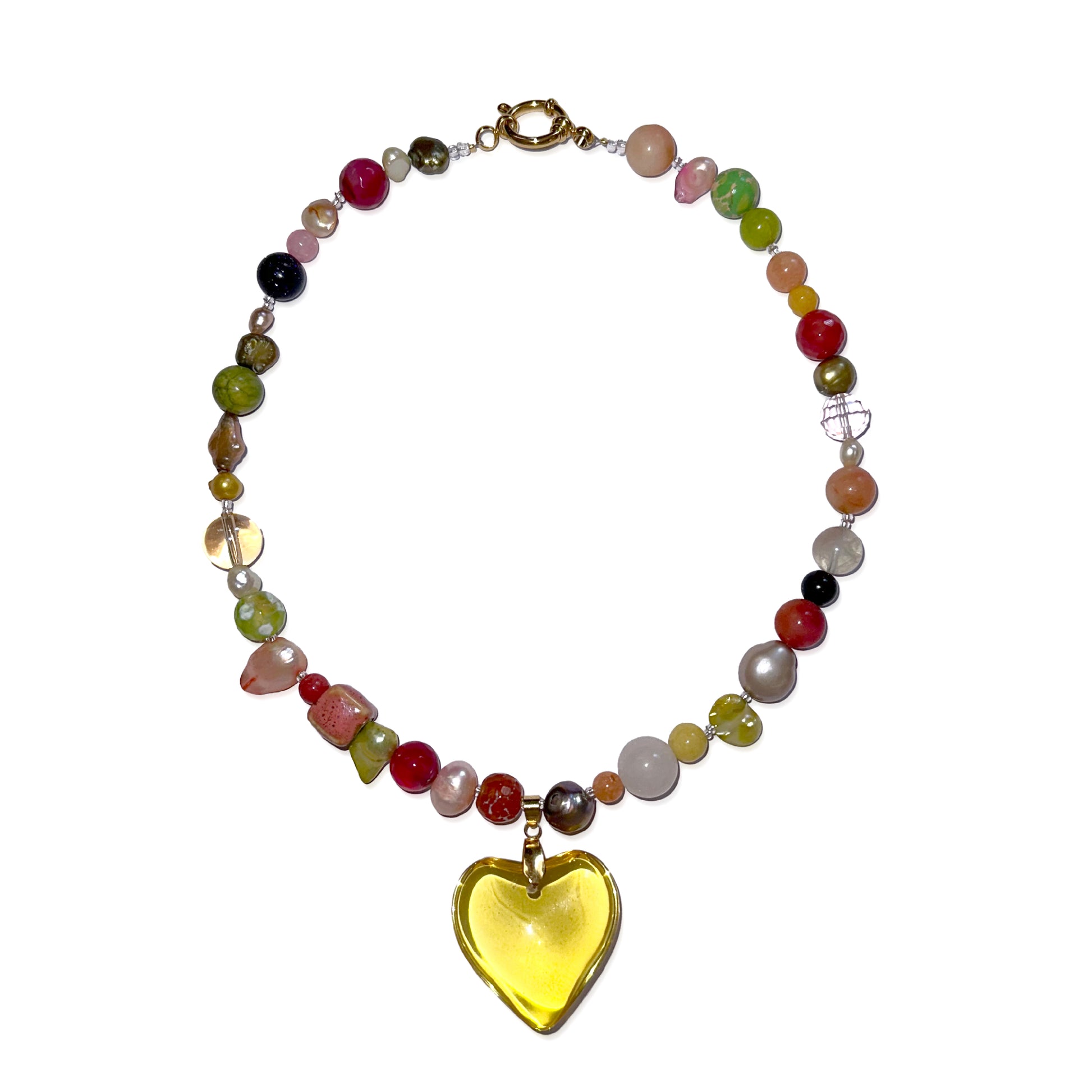 Handmade necklace, mix beads, little crystal pendant, seed beads, bright yellow glass pendant, real freshwater pearls, stainless steel golden clasp