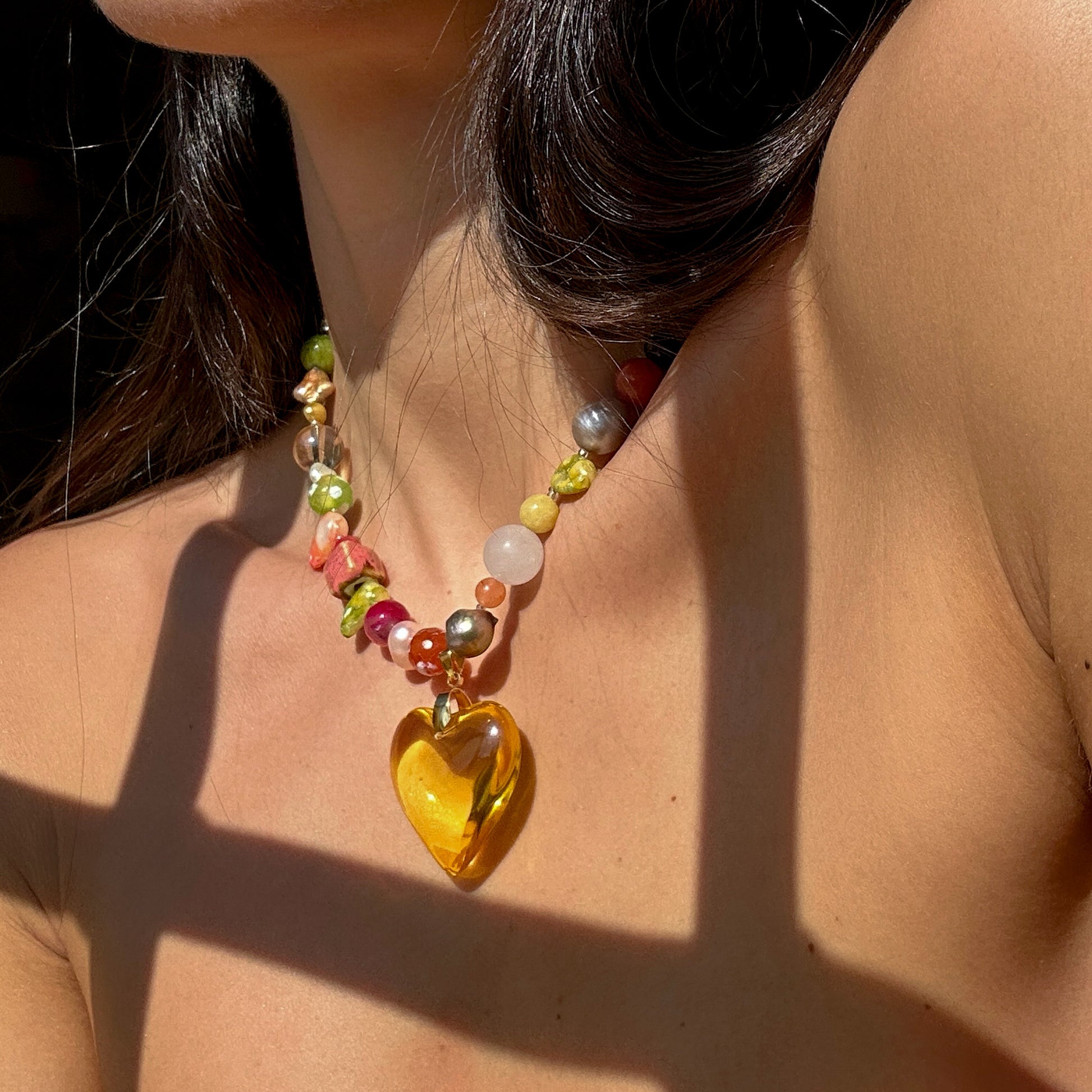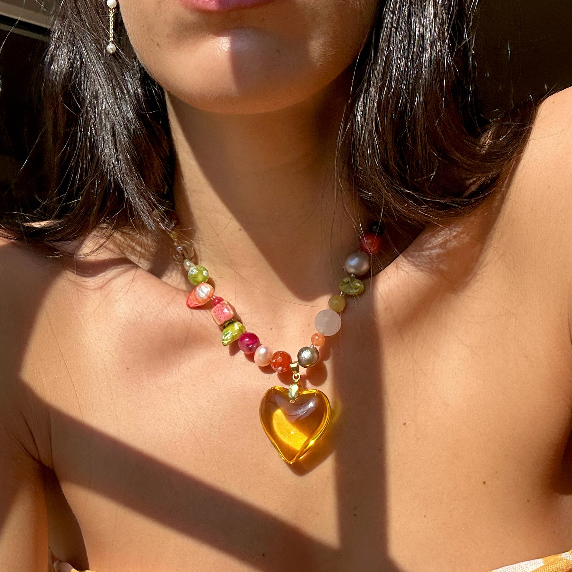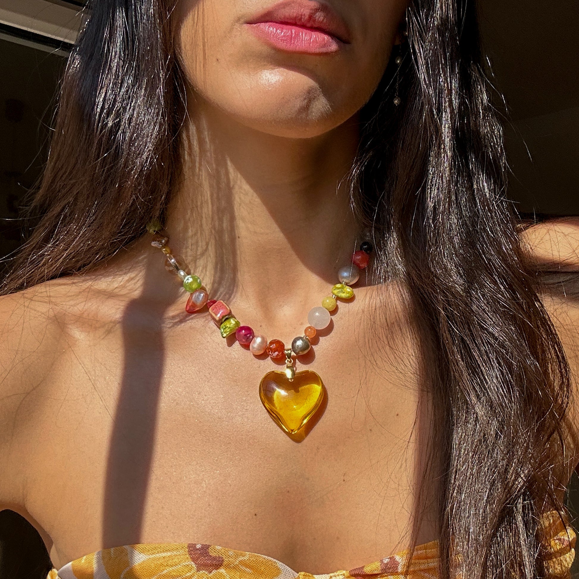 Handmade necklace, mix beads, little crystal pendant, seed beads, bright yellow glass pendant, real freshwater pearls, stainless steel golden clasp