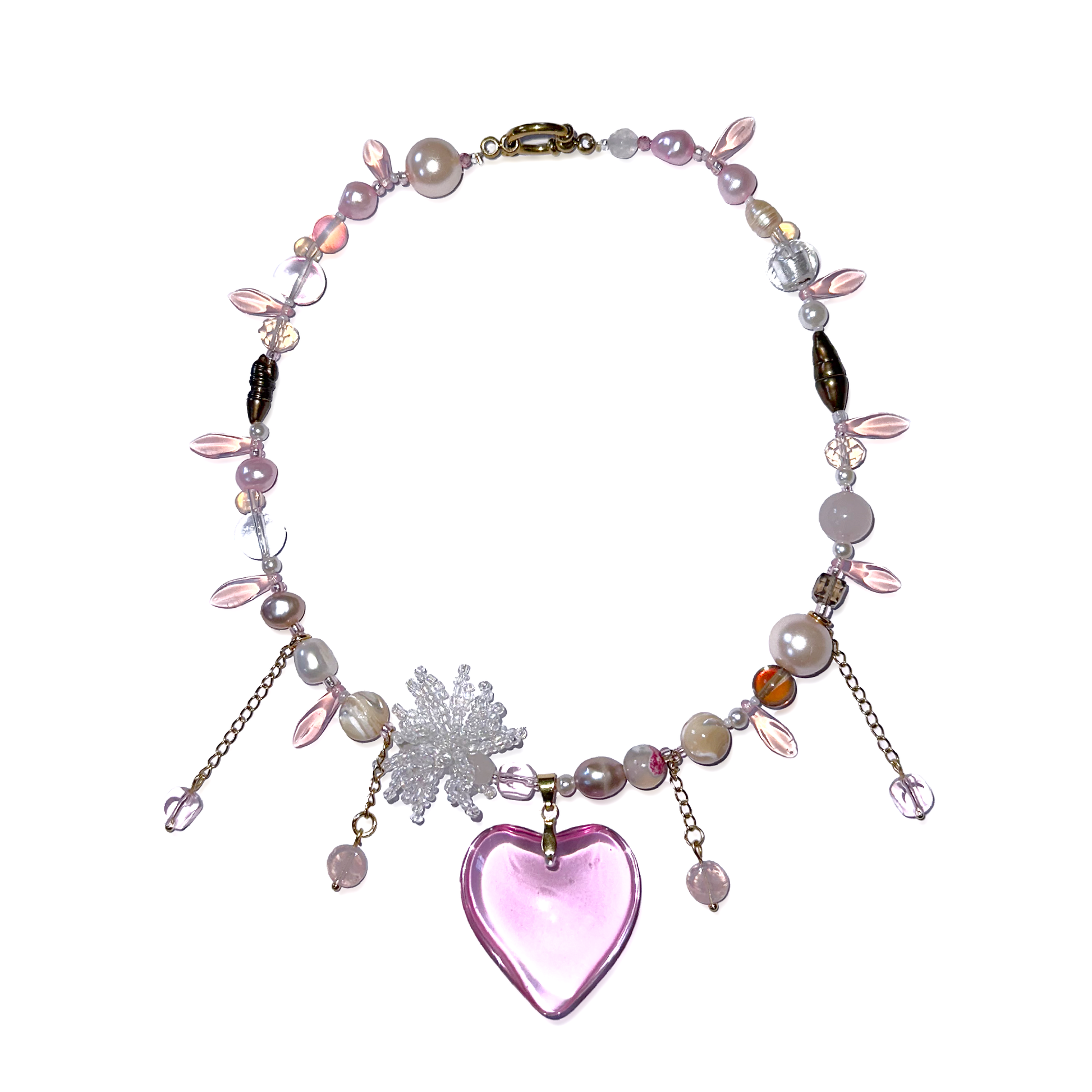 Handmade necklace made with a pink glass heart pendant, handmade beaded flower, spike freshwater pearls, natural pearls and colored ones, crystal beads, seed beads, hanging details, stainless steel golden clasp and chains.