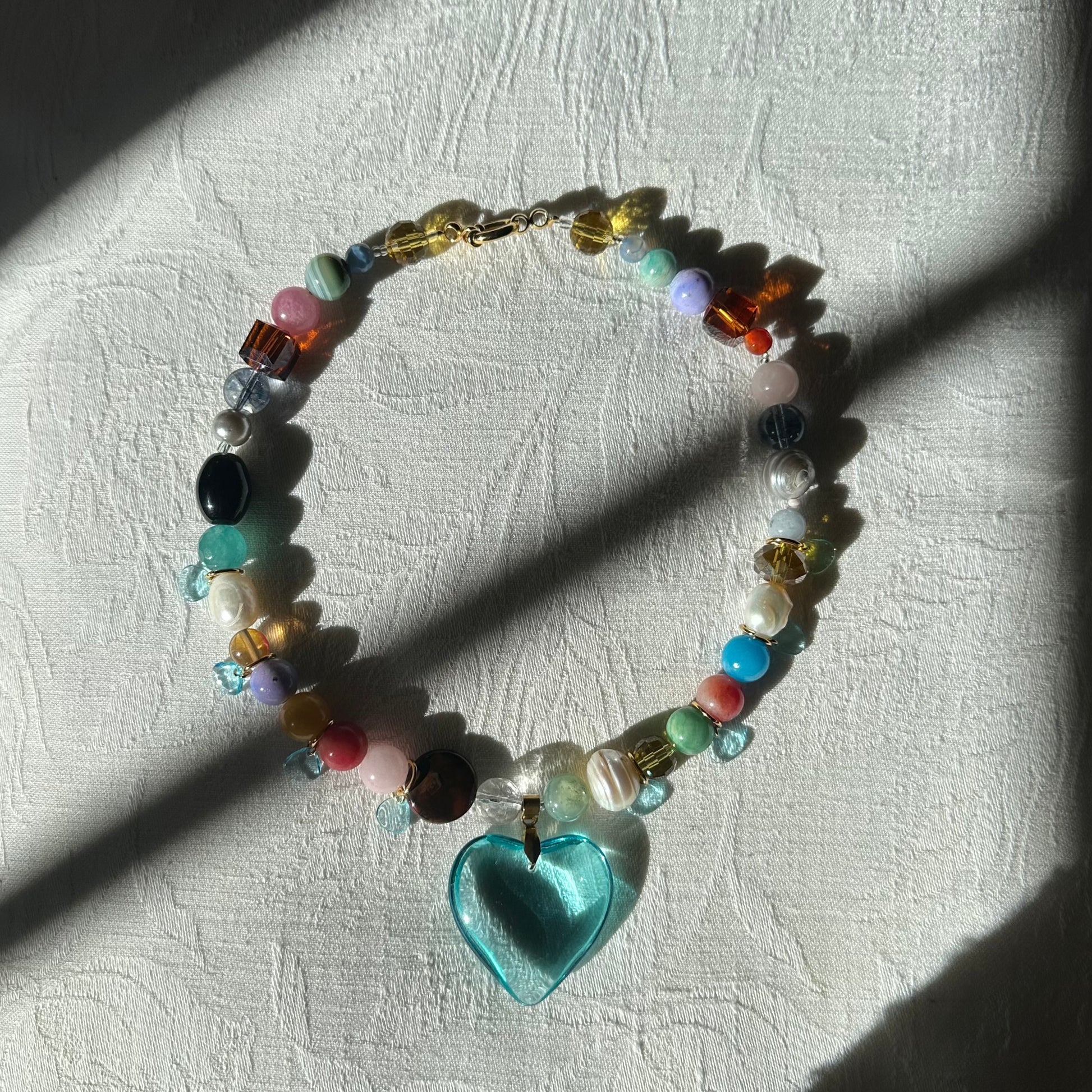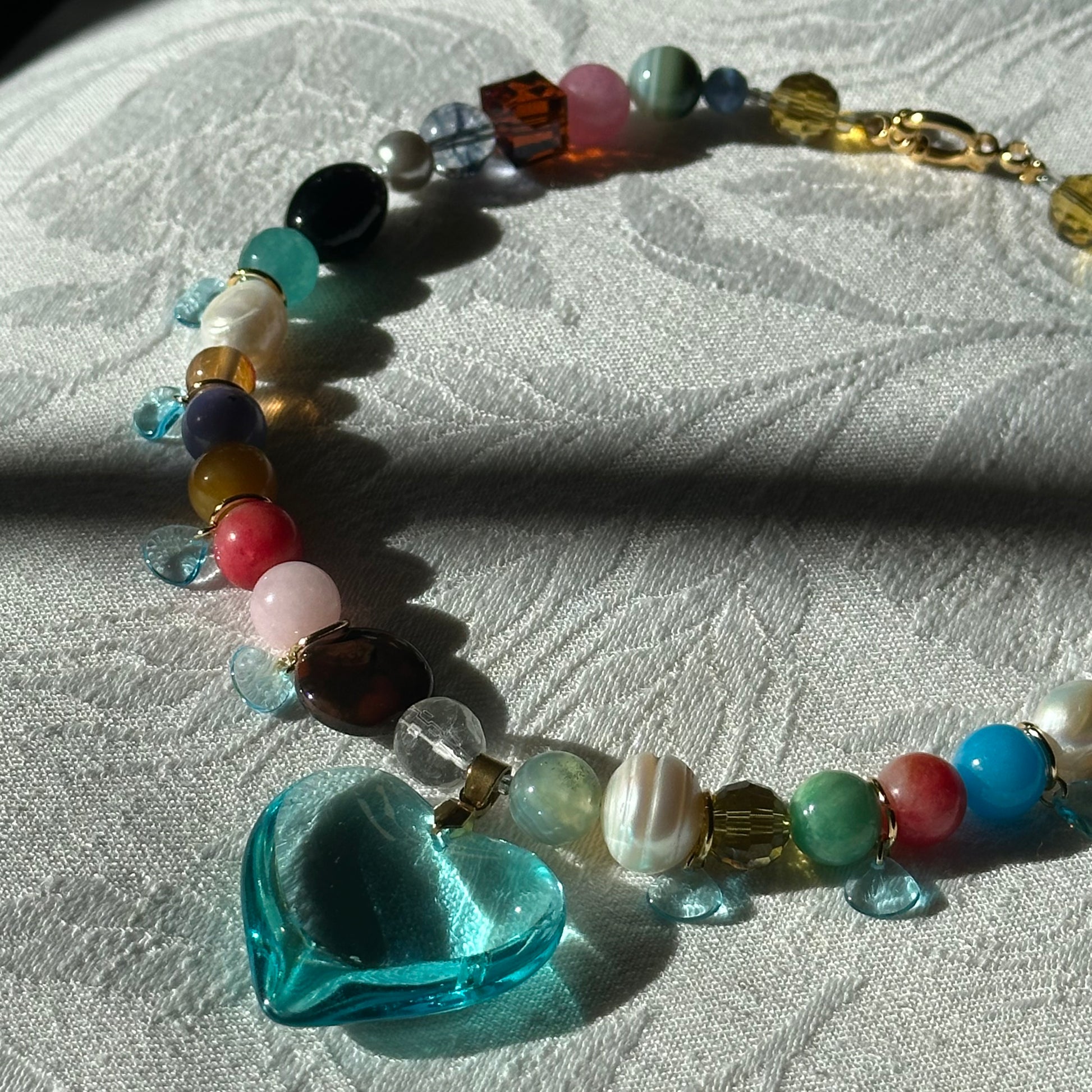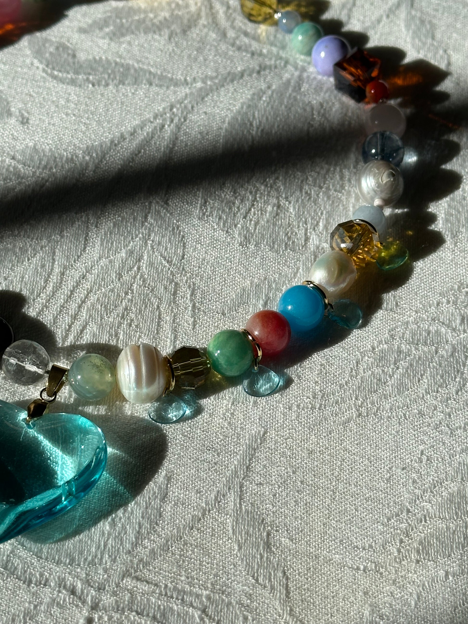 Turquoise heart pendant, freshwater pearls, hanging glass leaves, crystal beads, seed beads, stainless steel golden clasp.