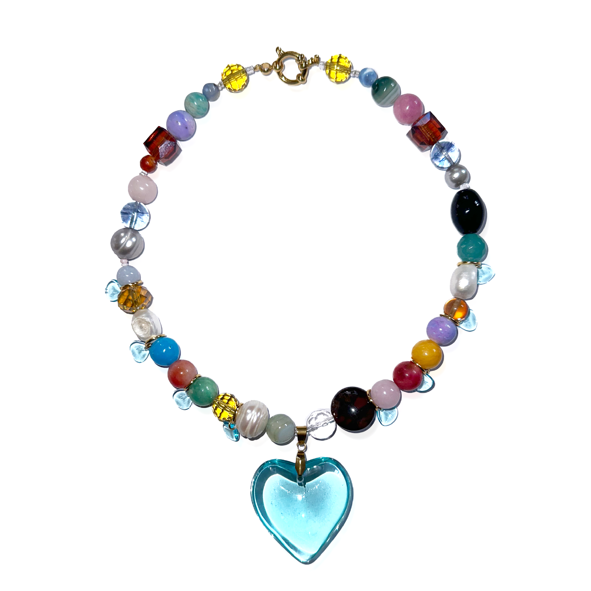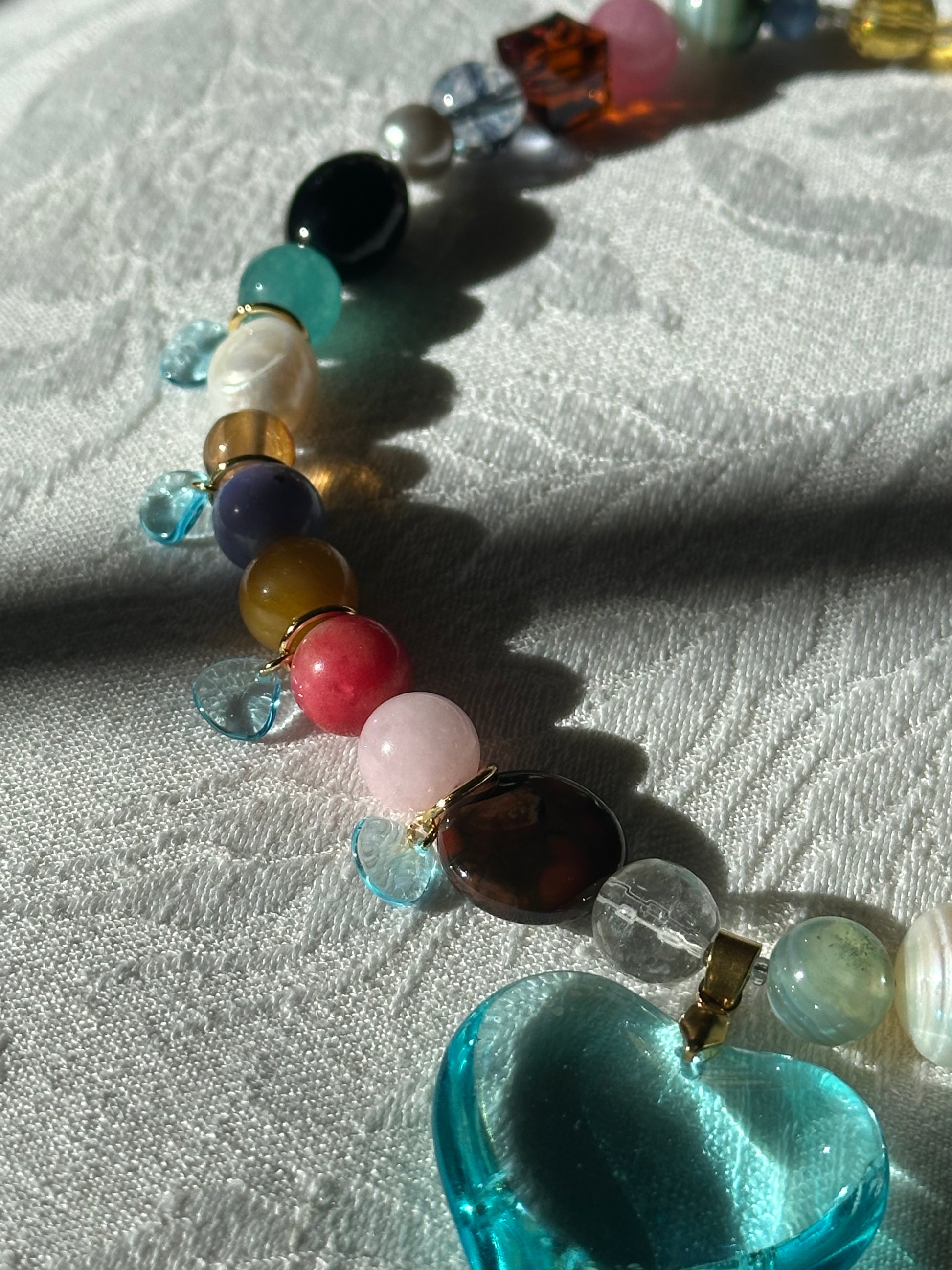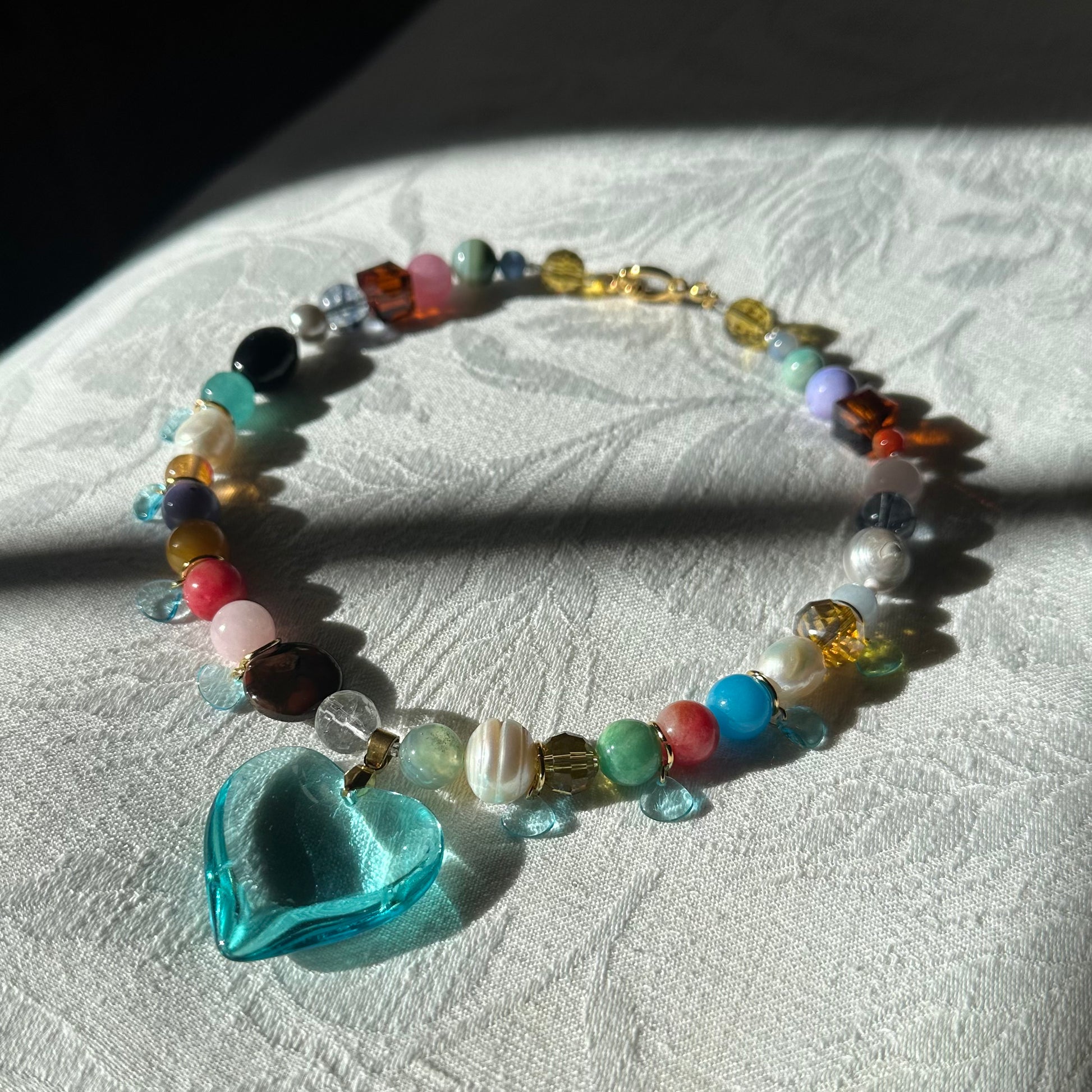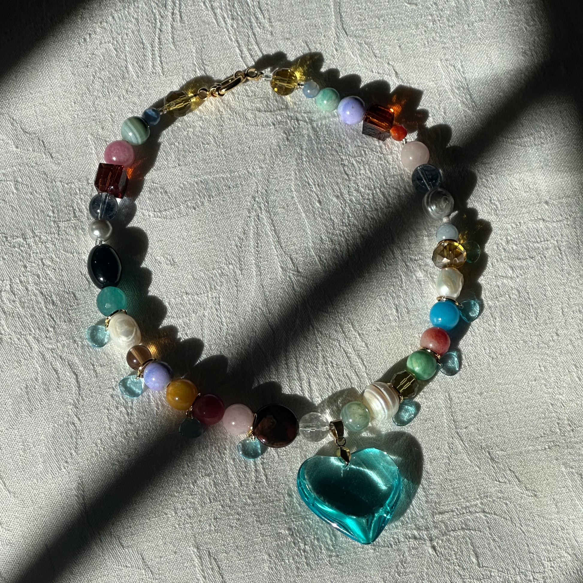 Turquoise heart pendant, freshwater pearls, hanging glass leaves, crystal beads, seed beads, stainless steel golden clasp.