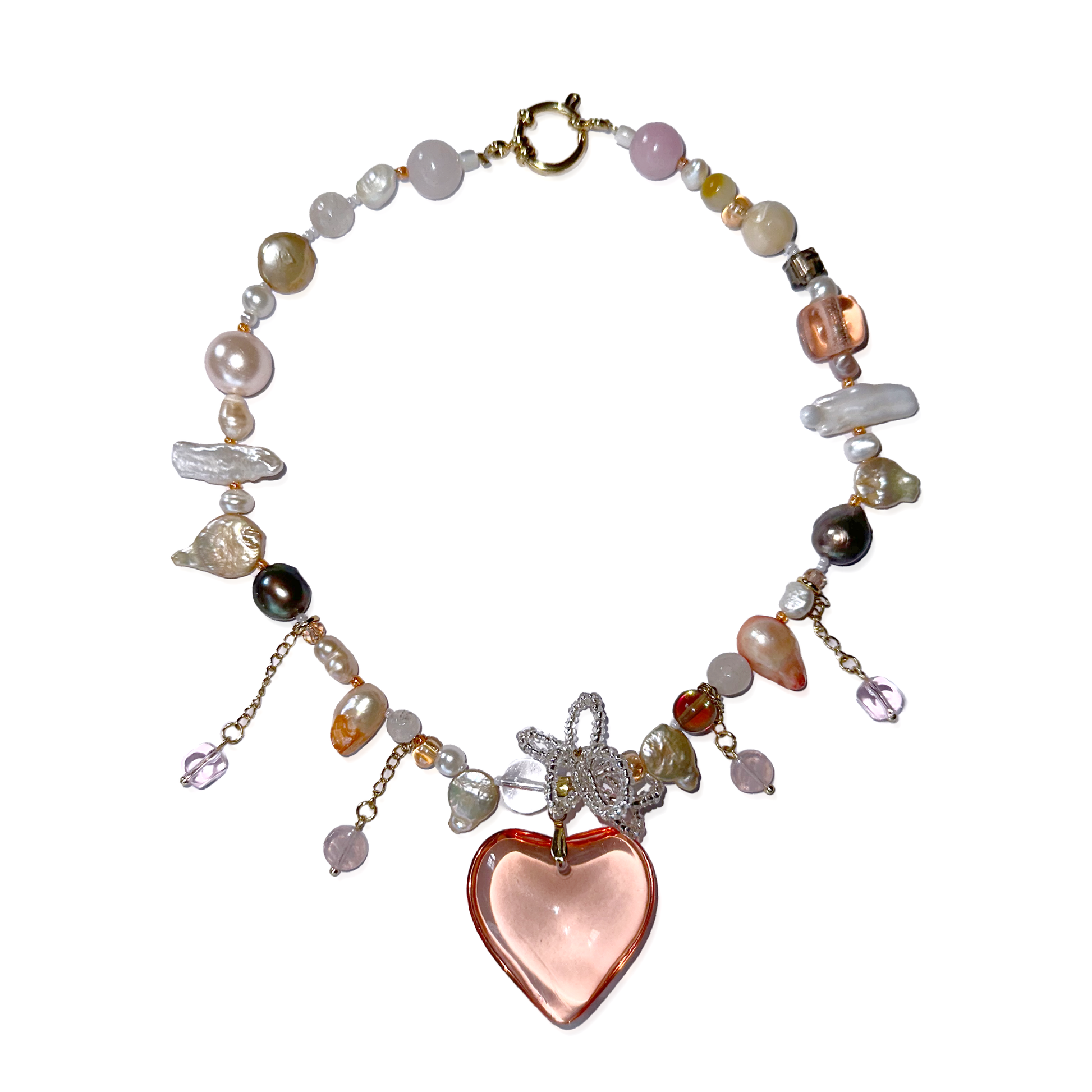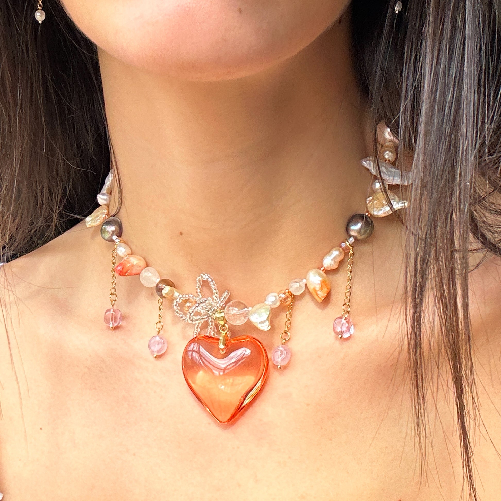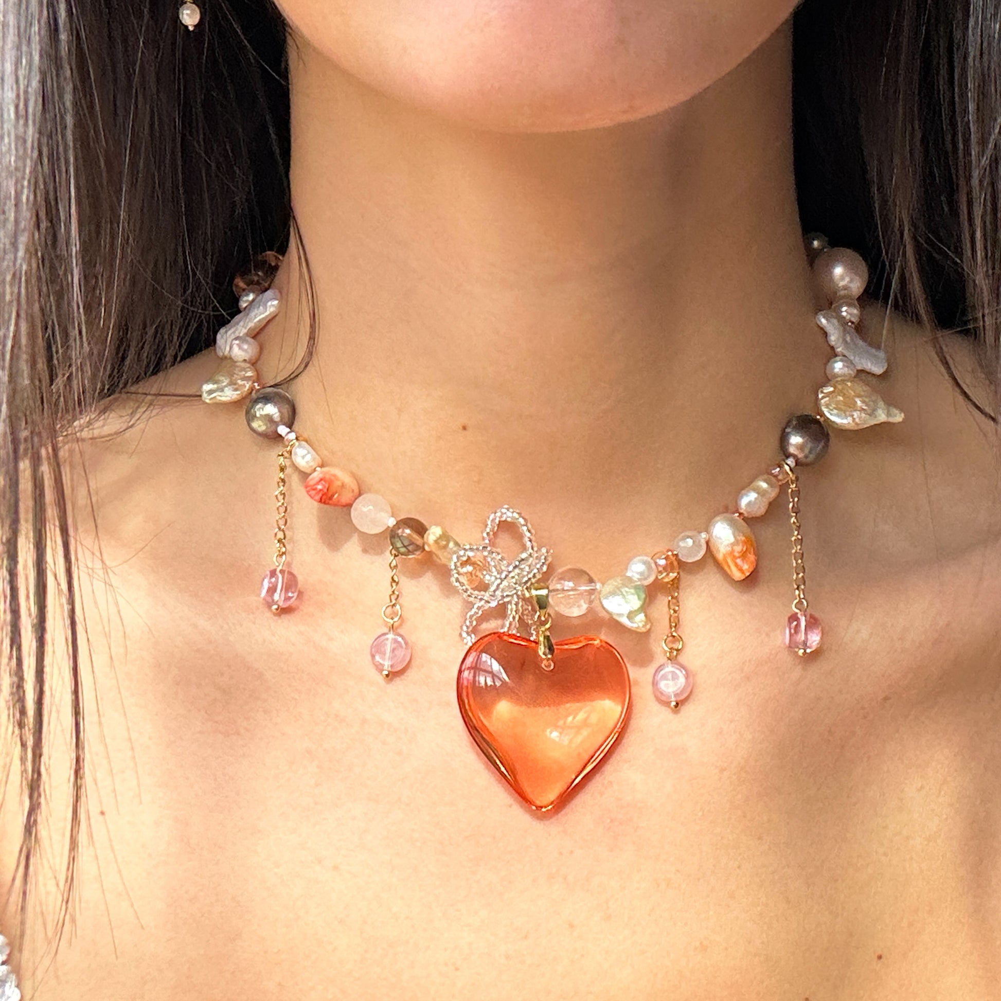 Handmade necklace made with a coral glass heart pendant, handmade beaded flower, spike freshwater pearls, natural pearls and colored ones, crystal beads, seed beads, hanging details, stainless steel golden clasp and chains.