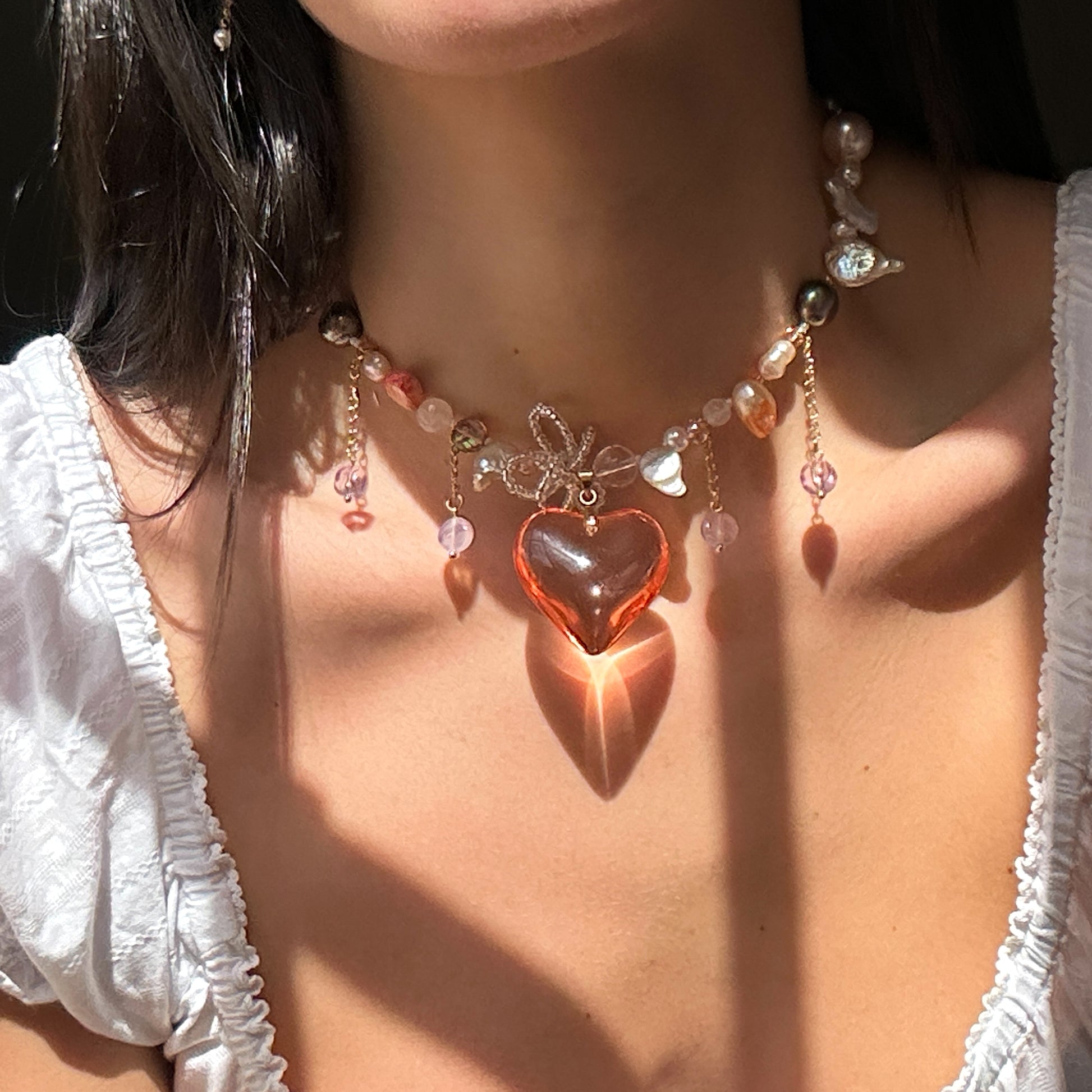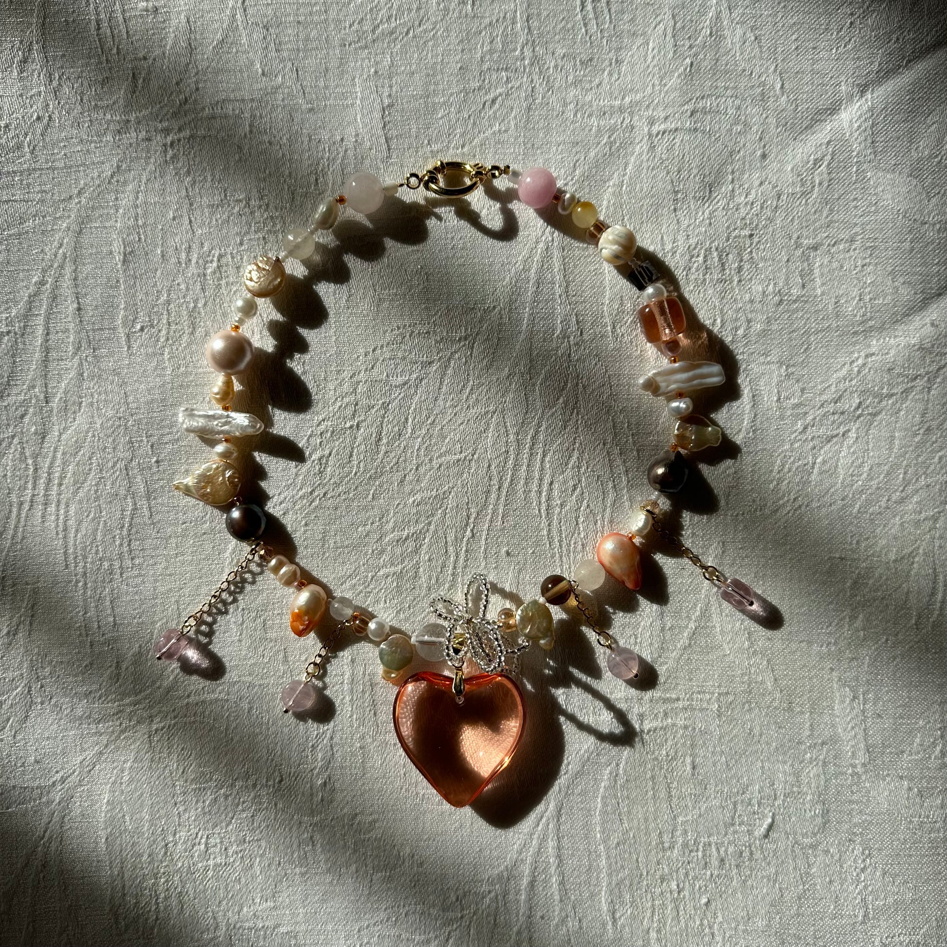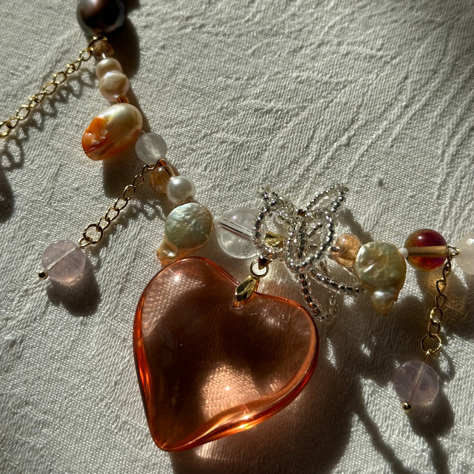 Handmade necklace made with a coral glass heart pendant, handmade beaded flower, spike freshwater pearls, natural pearls and colored ones, crystal beads, seed beads, hanging details, stainless steel golden clasp and chains.