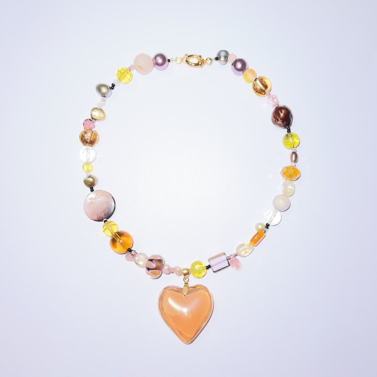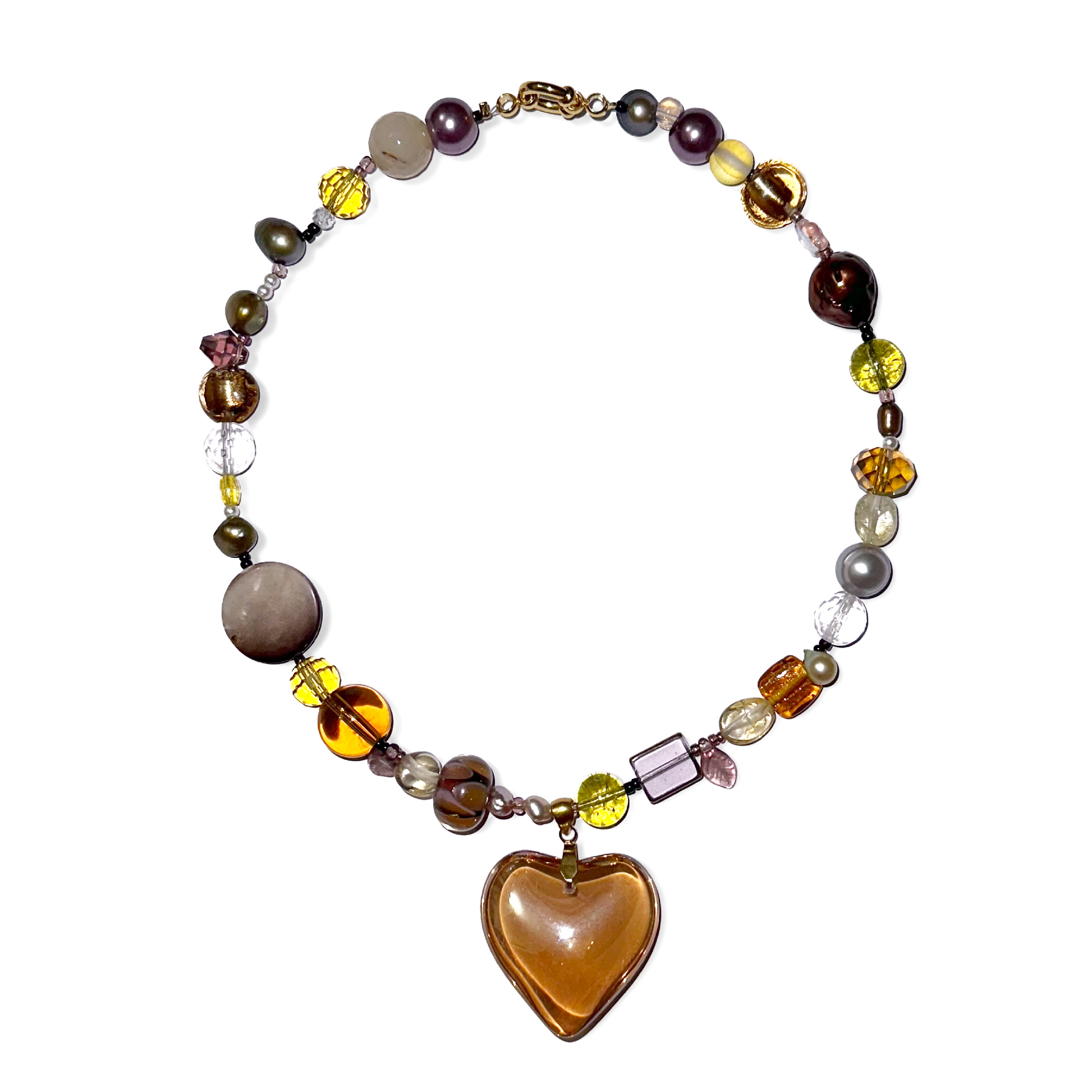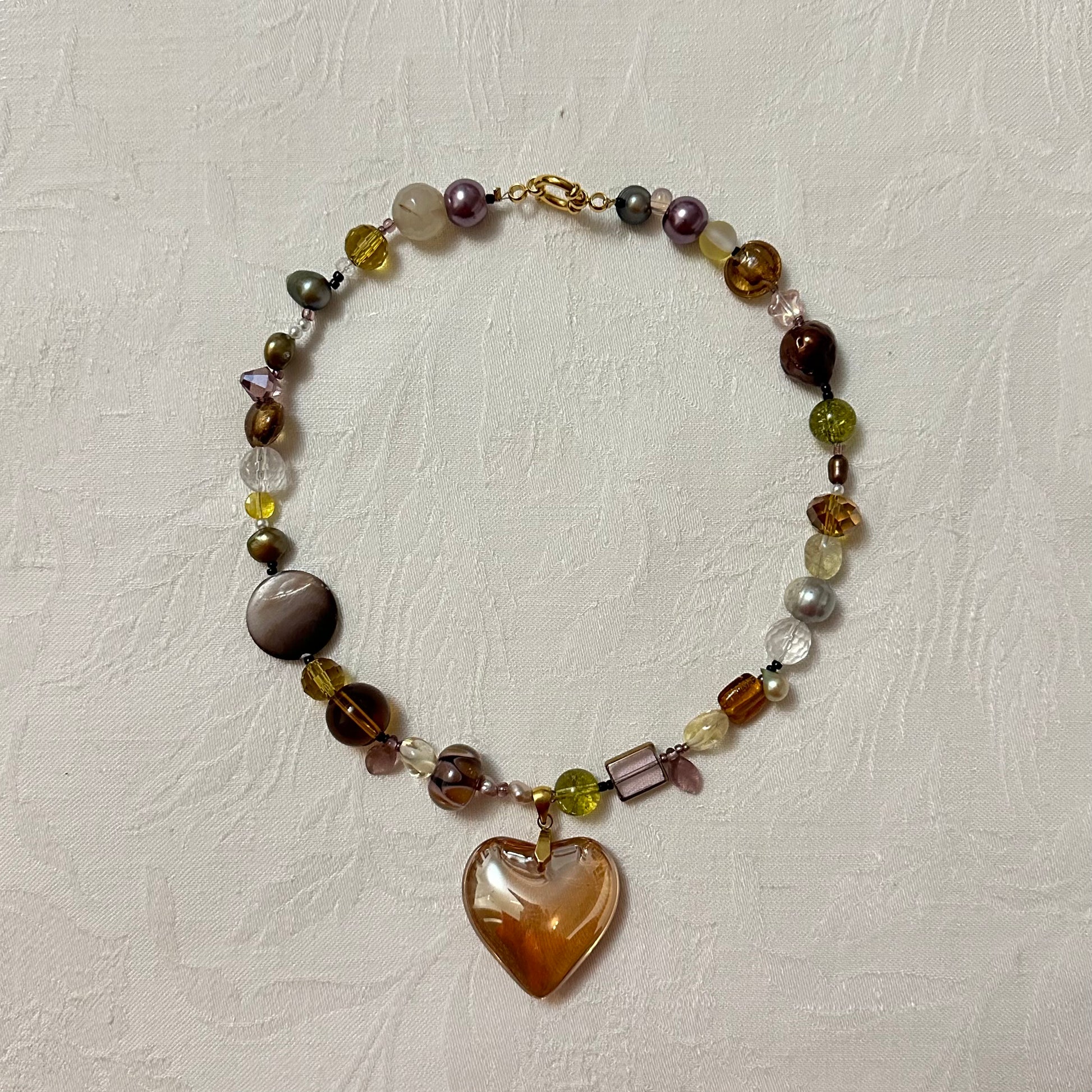 Golden/Amber heart pendant, glass beads, freshwater pearls, crystal beads, seed beads, stainless steel golden clasp.