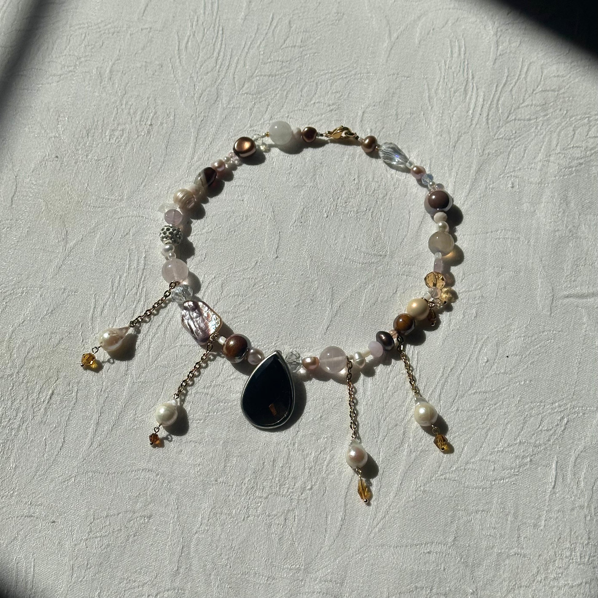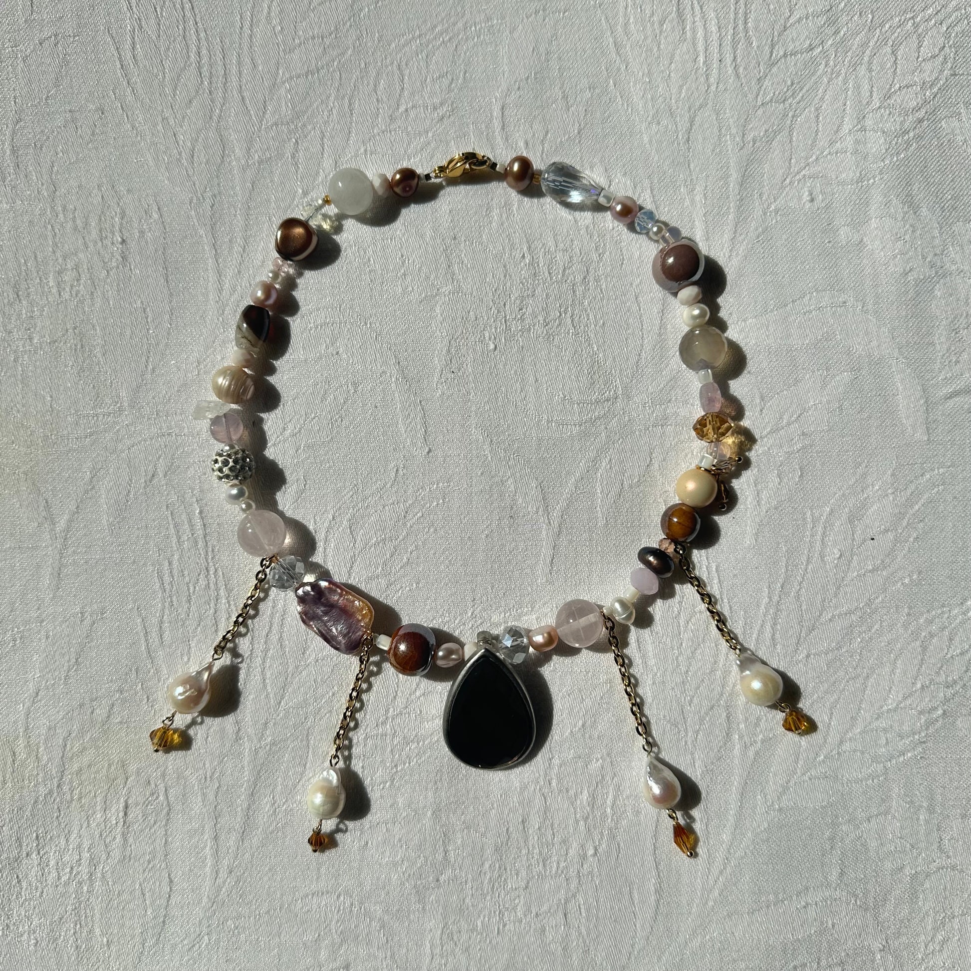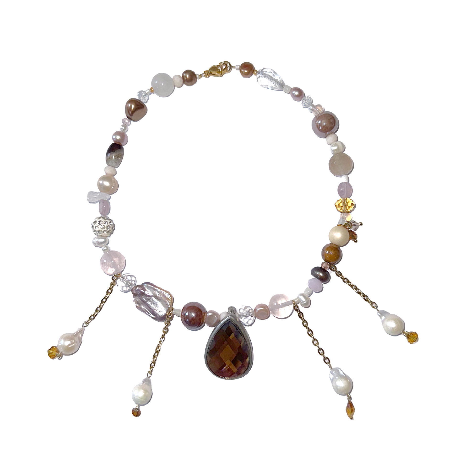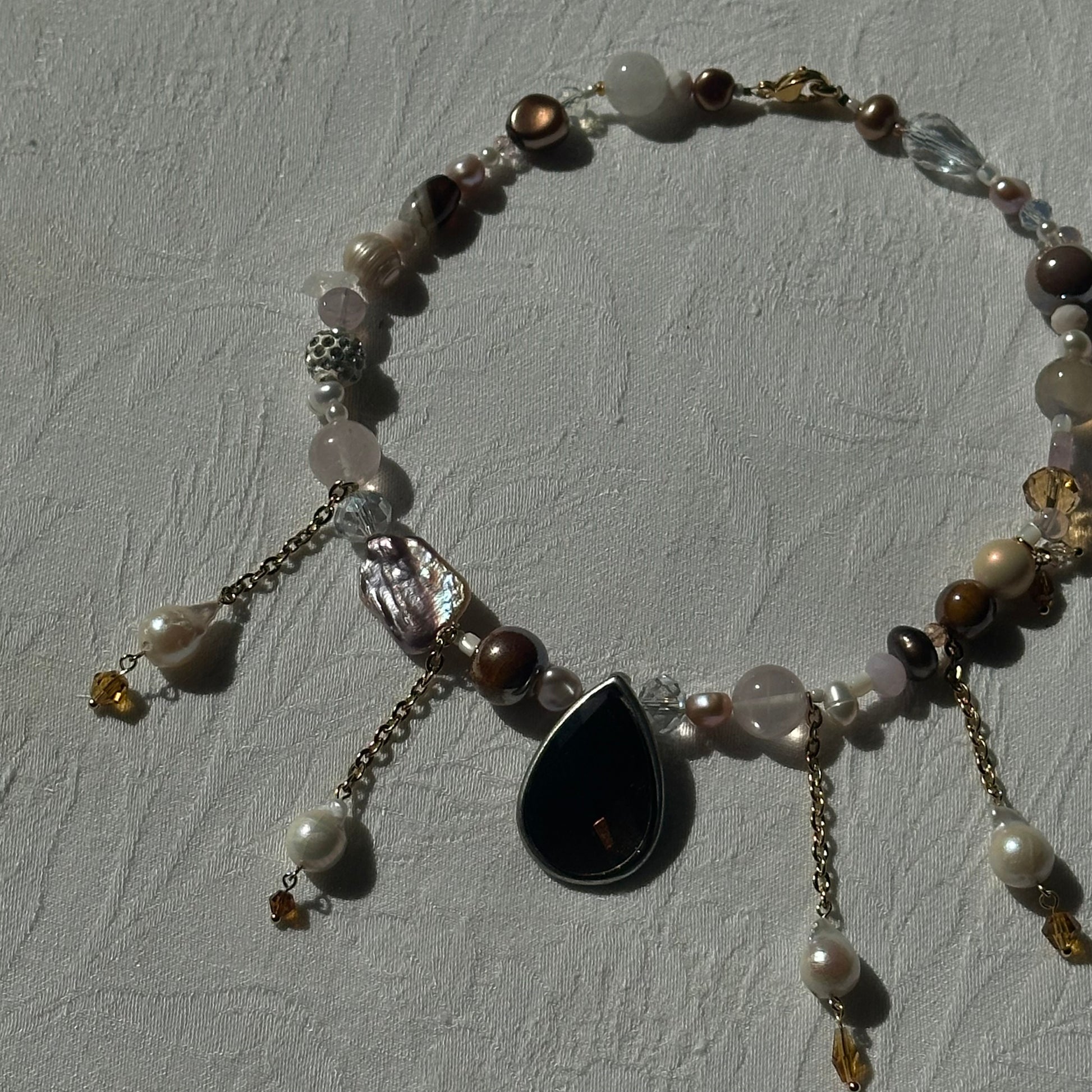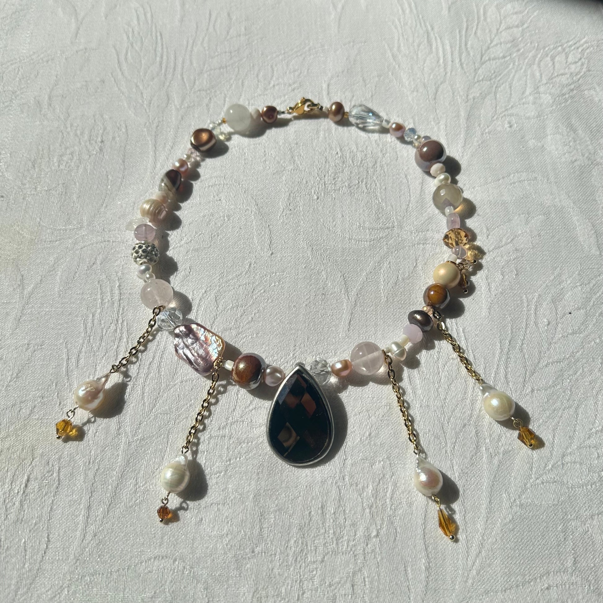 Vintage brown drop pendant, stainless steel golden chains, with freshwater pearls hanging from it, freshwater pearls, Czech beads, stainless steel golden clasp