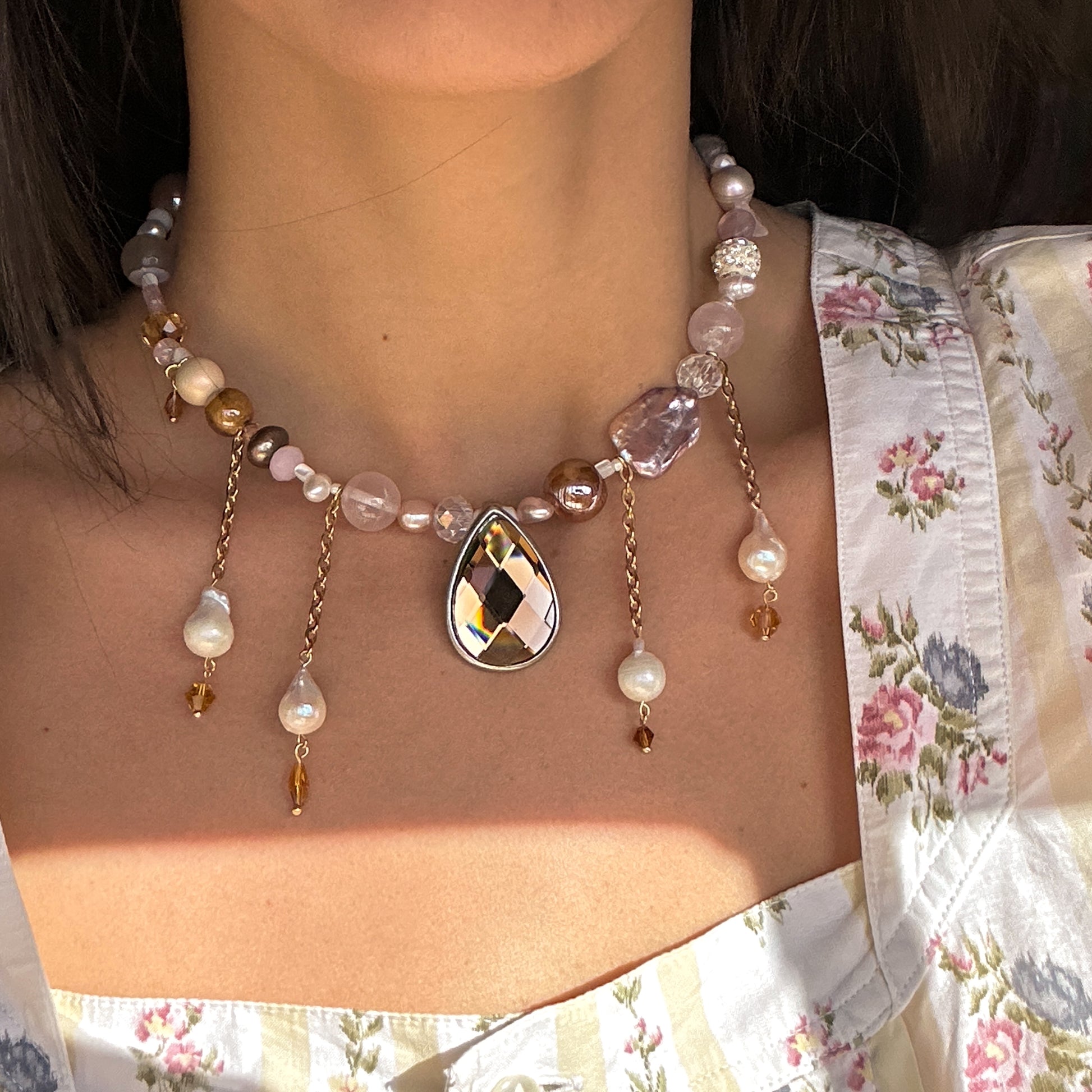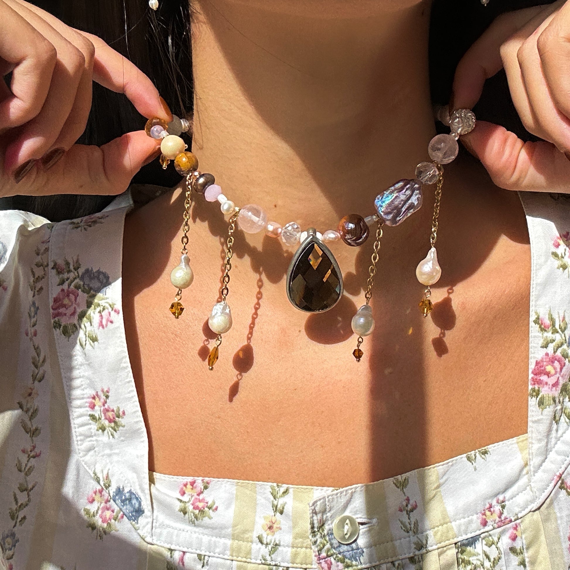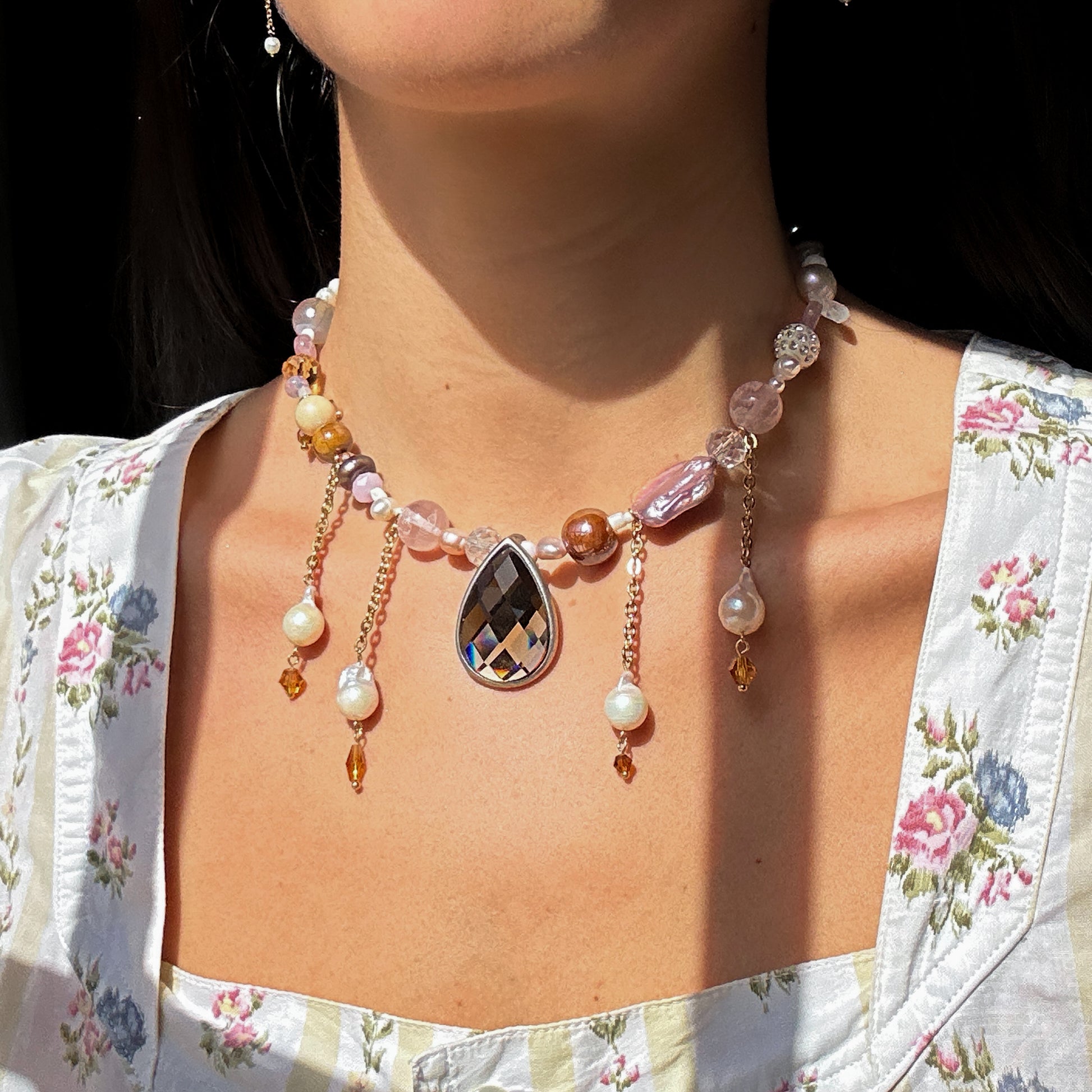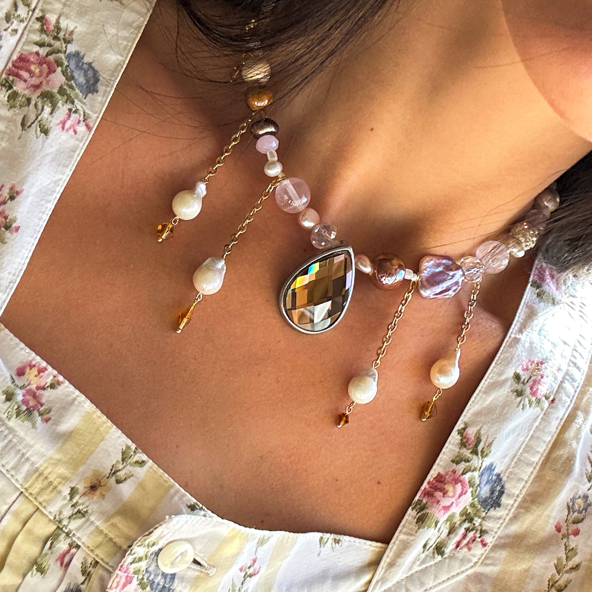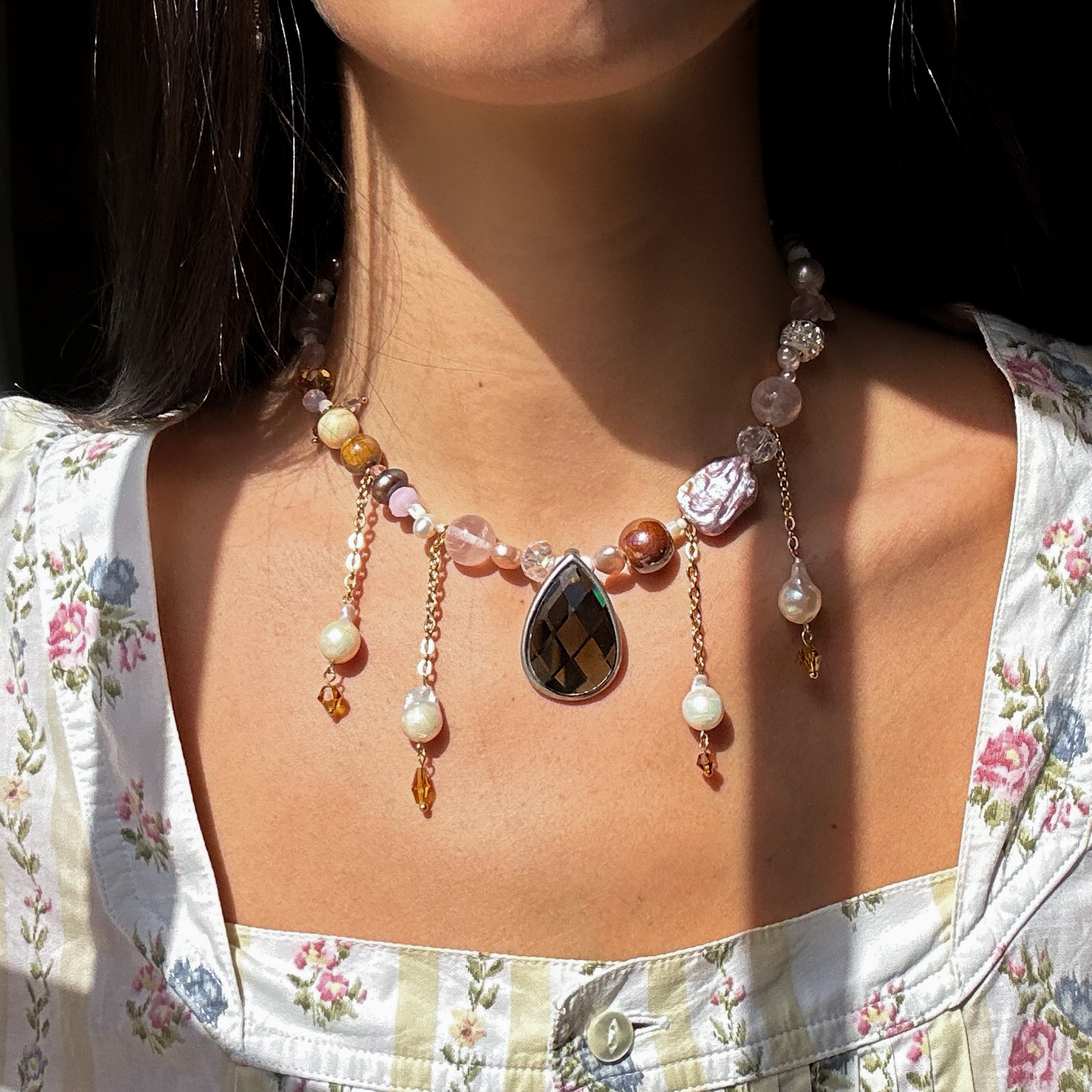 Vintage brown drop pendant, stainless steel golden chains, with freshwater pearls hanging from it, freshwater pearls, Czech beads, stainless steel golden clasp